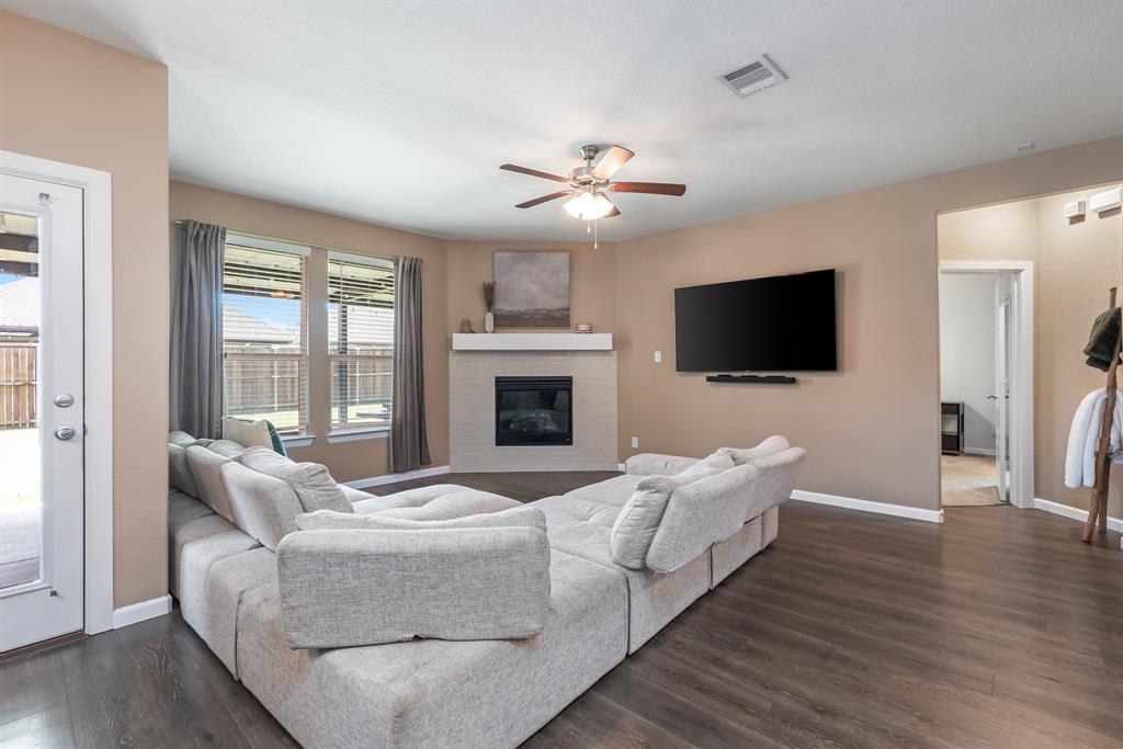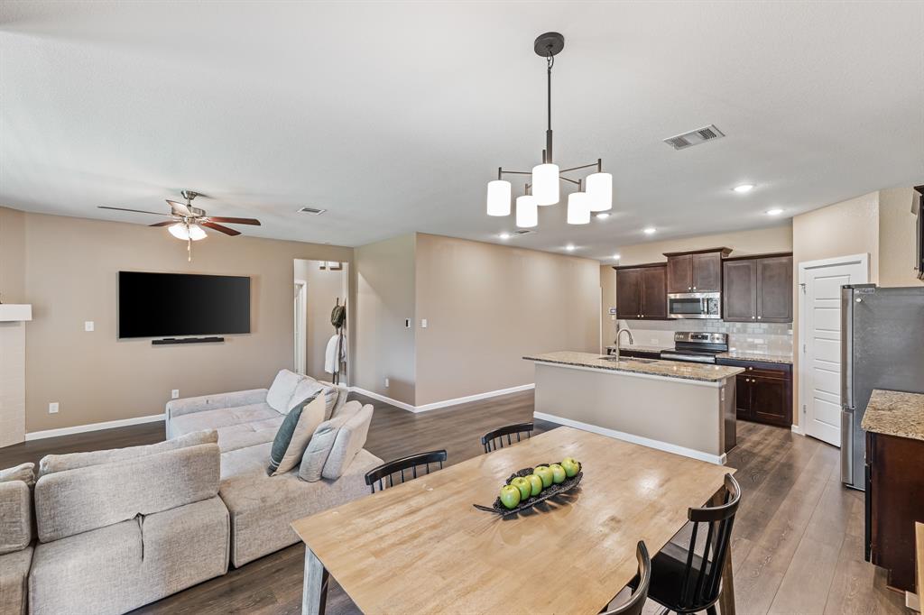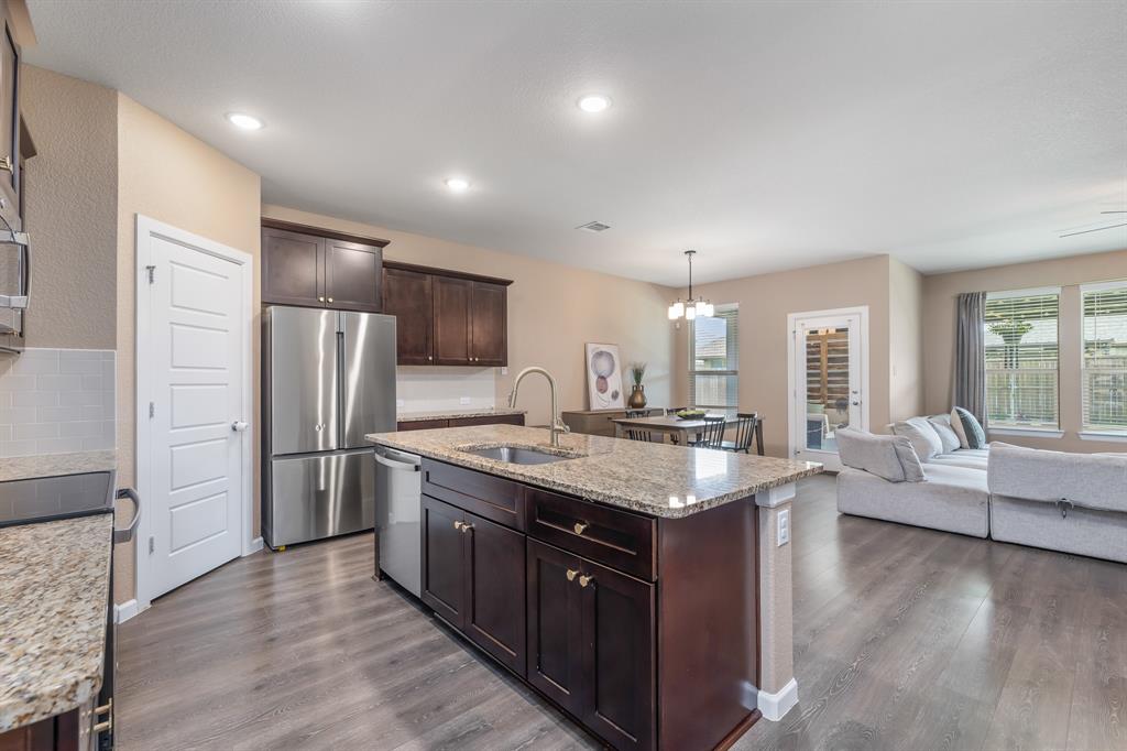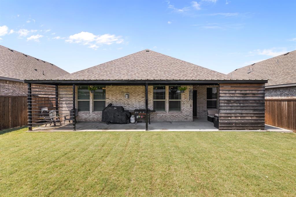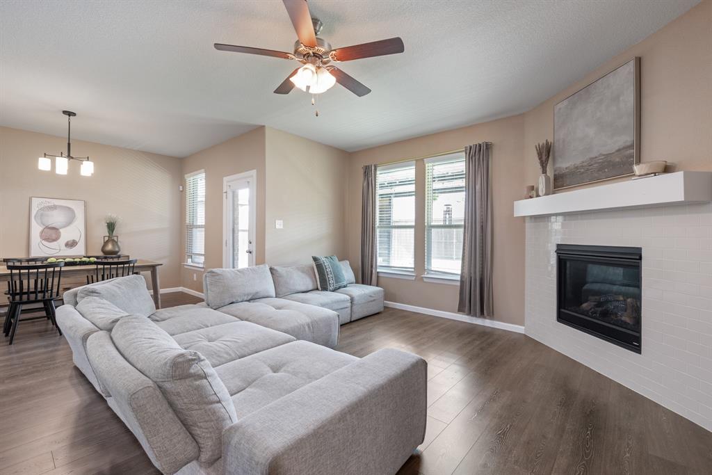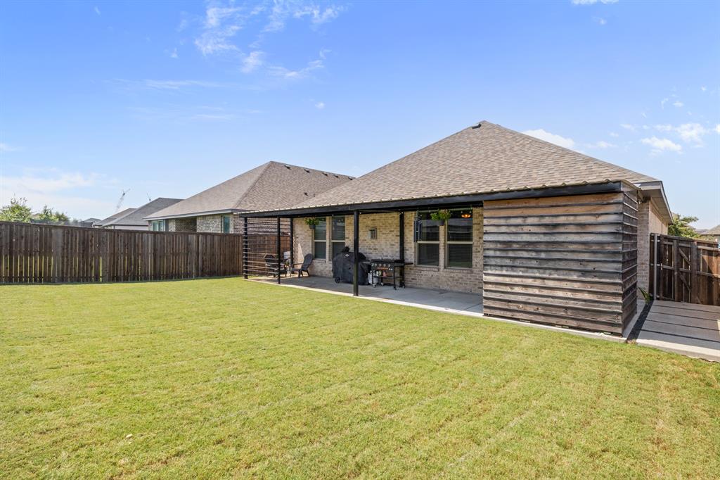 Stunning one-story, 4-bedroom home that perfectly blends comfort, style, and functionality. From the moment you step inside, you’ll notice the bright and inviting open-concept floorplan. The spacious living room features a cozy fireplace that creates a warm and welcoming atmosphere. Adjacent to the living area is a gourmet kitchen that will inspire your inner chef. It’s fully equipped with stainless steel appliances, including a smooth cooktop range. The kitchen also boasts a convenient breakfast bar, perfect for casual meals or morning coffee, and elegant granite countertops that provide ample workspace. The oversized owner’s retreat is a true sanctuary, offering privacy and luxury in equal measure. It features dual sinks that make morning routines easier, a relaxing garden tub where you can unwind after a long day, a separate shower for added convenience, and a custom-designed closet that provides plenty of storage space for your wardrobe and accessories. In addition to the owner’s suite, there are three additional bedrooms that offer versatility to suit your lifestyle. One of these rooms, located at the front of the home, is perfect for a home office, study, or guest room, providing flexibility whether you work from home or need extra space for visitors. Step outside to enjoy the gorgeous covered patio, an excellent spot for outdoor dining, relaxing with a book, or entertaining guests. The large backyard offers plenty of space for play, gardening, or future landscaping projects, making it a wonderful extension of your living space. This home is conveniently located near shopping centers, a variety of dining options, and community amenities such as scenic trails, basketball courts, park, splashpad and soccer fields ensuring you have everything you need within easy reach. Truly a MUST SEE!