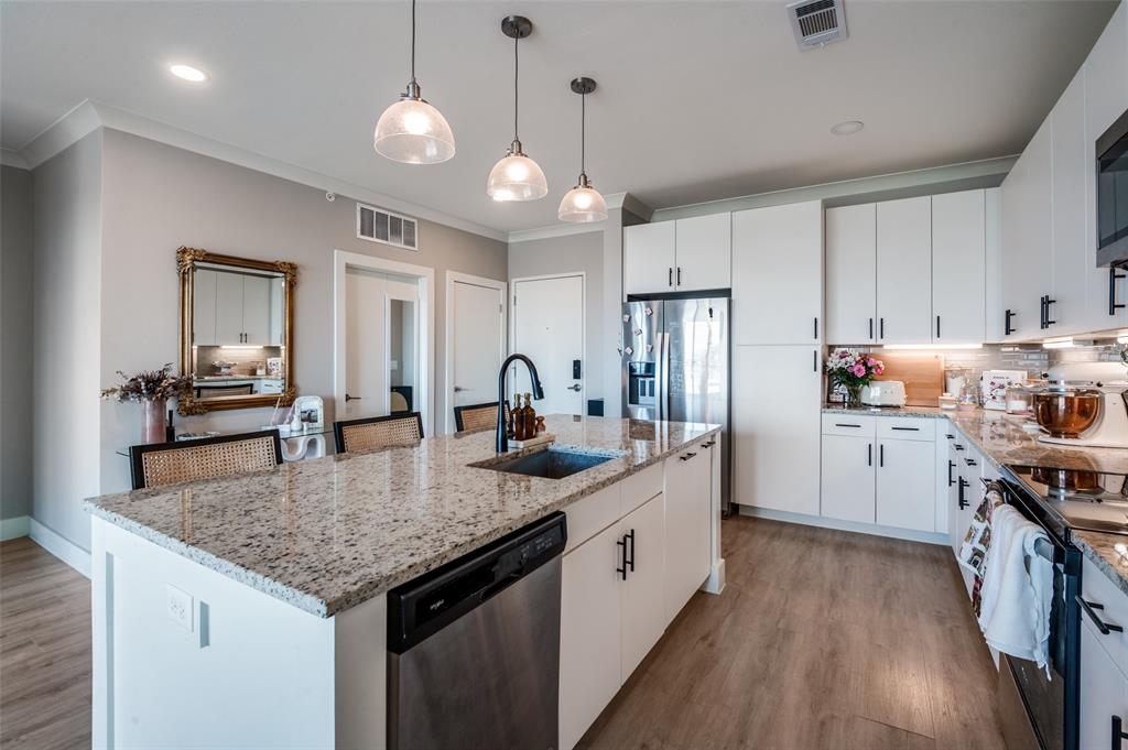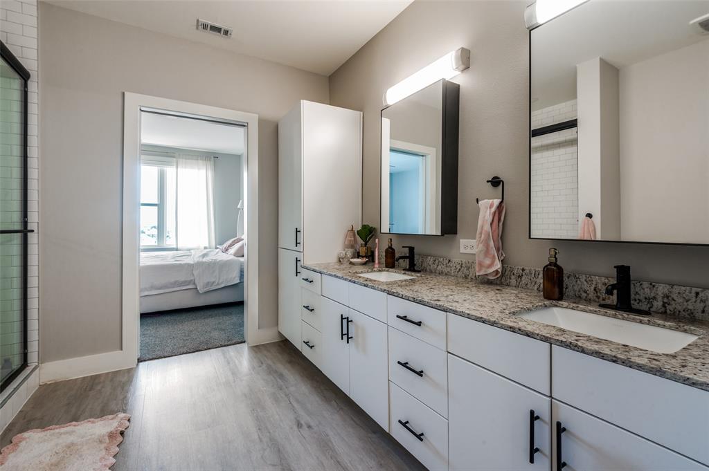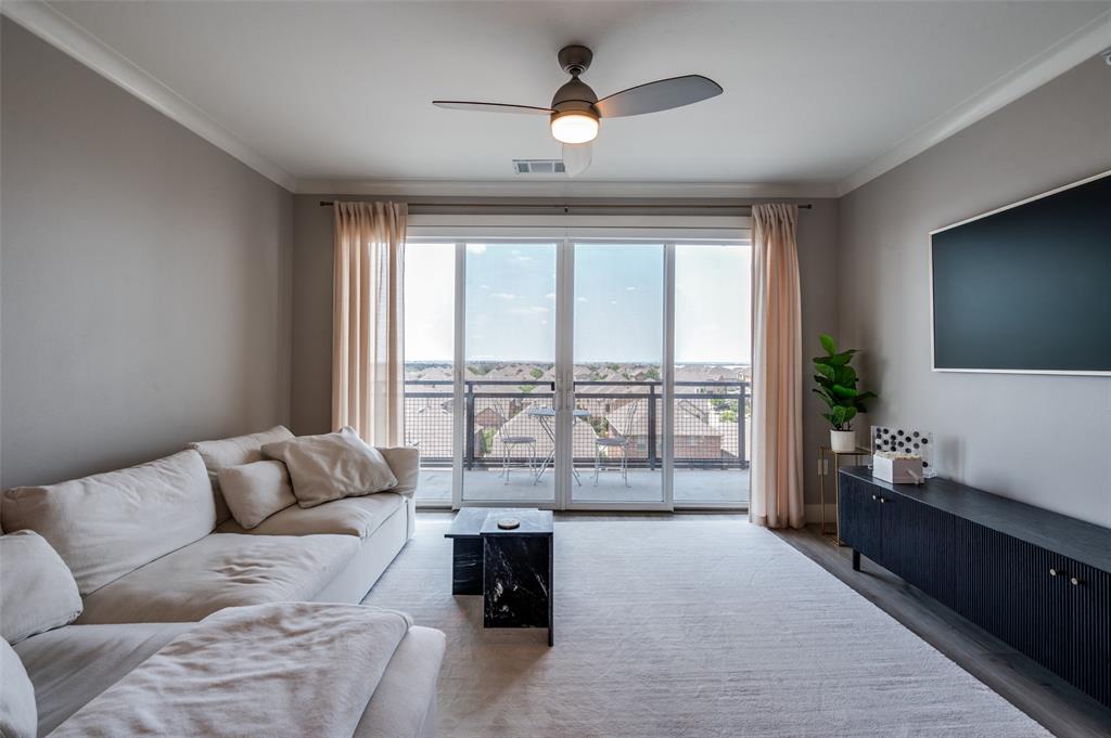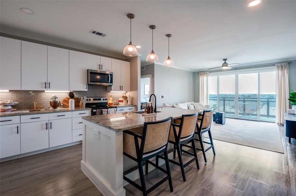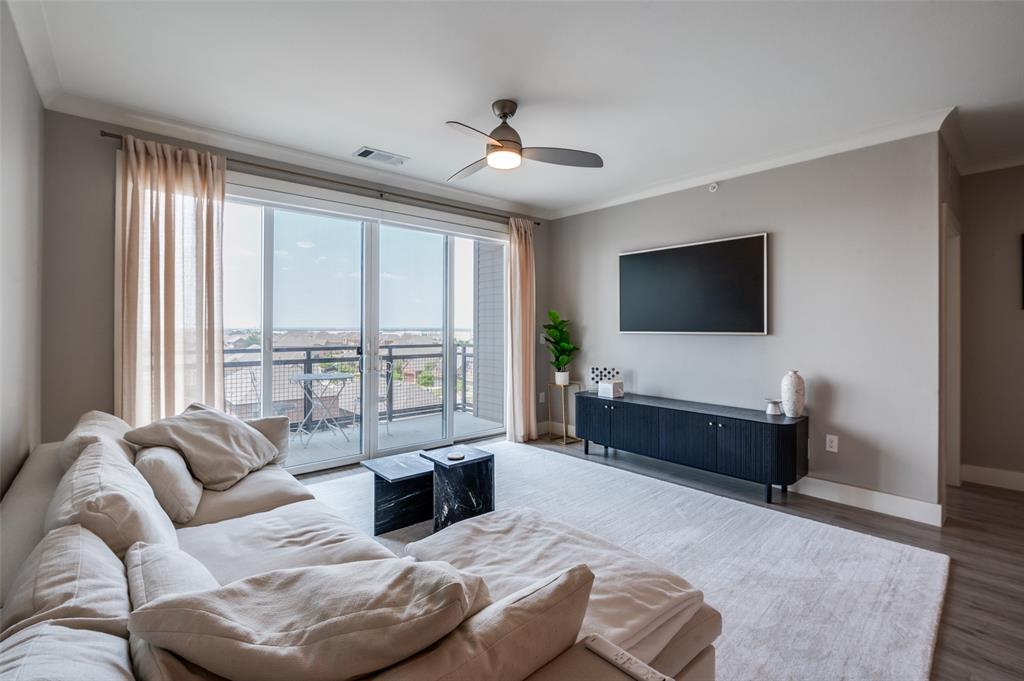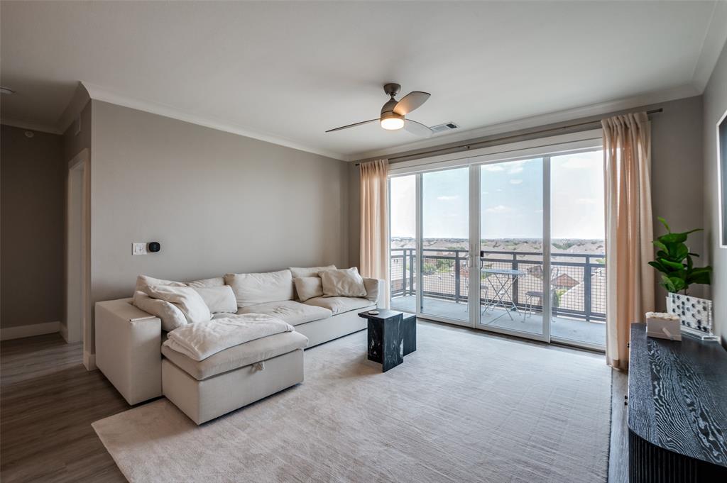 Experience luxury condo living and a low maintenance lifestyle at Sojurn At The Realm in Castle Hills just minutes from Grandscapes, Top Golf, Hawaiin Falls Waterpark, shopping, dining, entertainment and much more!! This 2 bedroom unit is located on the 4th floor and offers wide open city views from the covered & private balcony! The main living area features an open concept floor plan with LVP flooring, light colors, modern design features, and a wall of windows that provide tons of natural lighting. The kitchen is equipped with granite countertops, designer backsplash, white cabinets and large center island with room for bar stools. The private primary suite offers beautiful views, a large bath with walk in shower, dual sinks & a large walk in closet! The second bedroom can be used for guests, as a flex space or as a private office and does have a full bath! Additional features include a covered garage parking spot plus a designated carport parking spot as well as a large storage unit conveniently located in the garage to store your belongings! Easy access to Dallas North Tollway, Highway 121, and close proximity to both Lovefield and DFW airports. Don’t miss out on this gorgeous condo and schedule your appointment today!!!