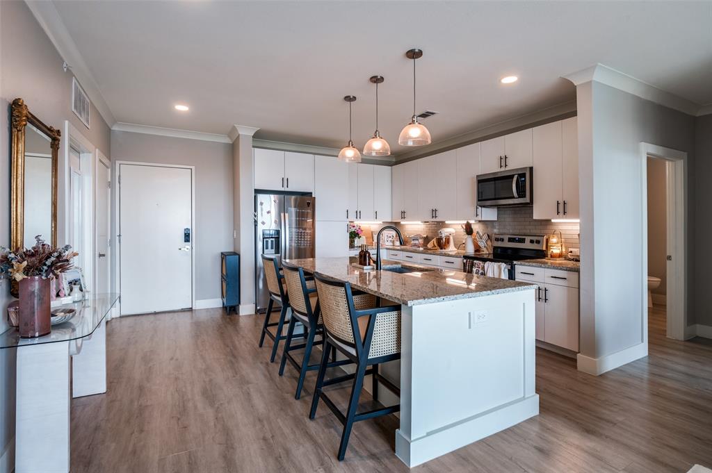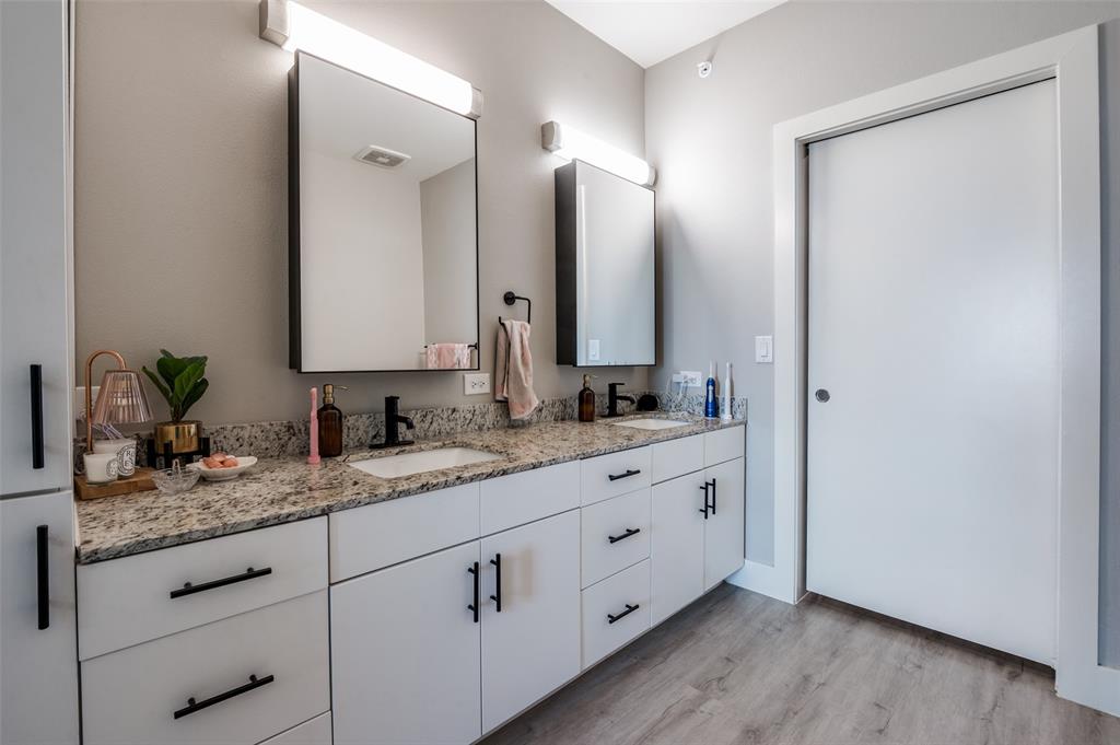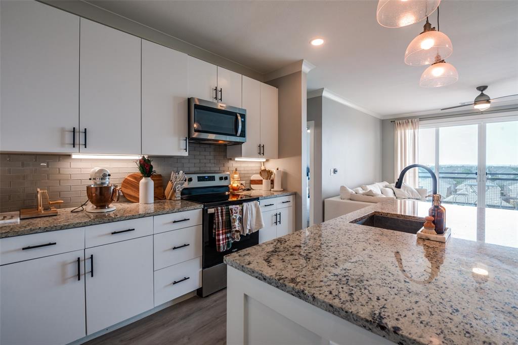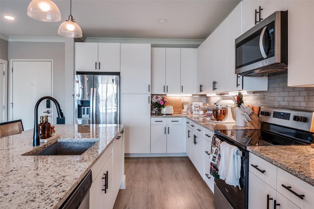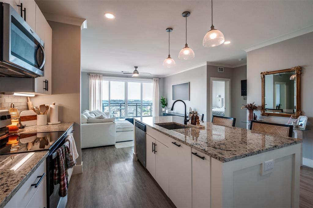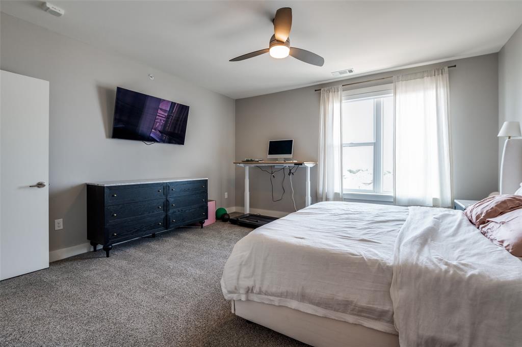 Experience luxury condo living and a low maintenance lifestyle at Sojurn At The Realm in Castle Hills just minutes from Grandscapes, Top Golf, Hawaiin Falls Waterpark, shopping, dining, entertainment and much more!! This 2 bedroom unit is located on the 4th floor and offers wide open city views from the covered & private balcony! The main living area features an open concept floor plan with LVP flooring, light colors, modern design features, and a wall of windows that provide tons of natural lighting. The kitchen is equipped with granite countertops, designer backsplash, white cabinets and large center island with room for bar stools. The private primary suite offers beautiful views, a large bath with walk in shower, dual sinks & a large walk in closet! The second bedroom can be used for guests, as a flex space or as a private office and does have a full bath! Additional features include a covered garage parking spot plus a designated carport parking spot as well as a large storage unit conveniently located in the garage to store your belongings! Easy access to Dallas North Tollway, Highway 121, and close proximity to both Lovefield and DFW airports. Don’t miss out on this gorgeous condo and schedule your appointment today!!!