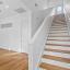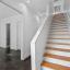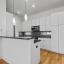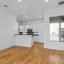 The second level boasts rich wood flooring, an open-concept layout ideal for entertaining, and a beautifully updated half bath. The chef-style kitchen is equipped with granite countertops, stainless steel appliances (including a gas range), a striking glass tile backsplash, white cabinetry, and a generous island. The adjacent living and dining areas open to a private covered balcony for added indoor-outdoor flow.