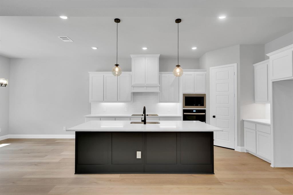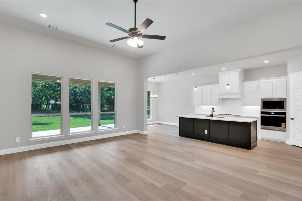 The gourmet kitchen is a showstopper, featuring sleek countertops, stainless steel appliances, and plenty of storage—perfect for both everyday living and entertaining. The spacious living area is ideal for gatherings, with sunlight streaming in and highlighting the home’s warm, inviting finishes.