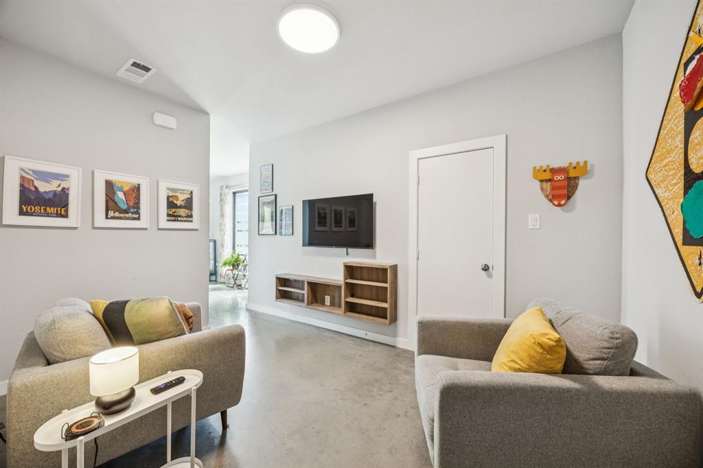 The vaulted ceilings and upgraded exposed beams highlight the high ceilings and brings a level of warmth not seen in many townhomes. Bedrooms are separated on each level with their own ensuite bathroom. Don't forget the large flex space downstairs that can also serve as a second living area, office, or gym.