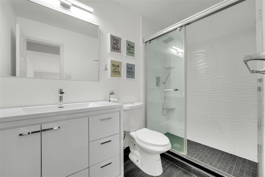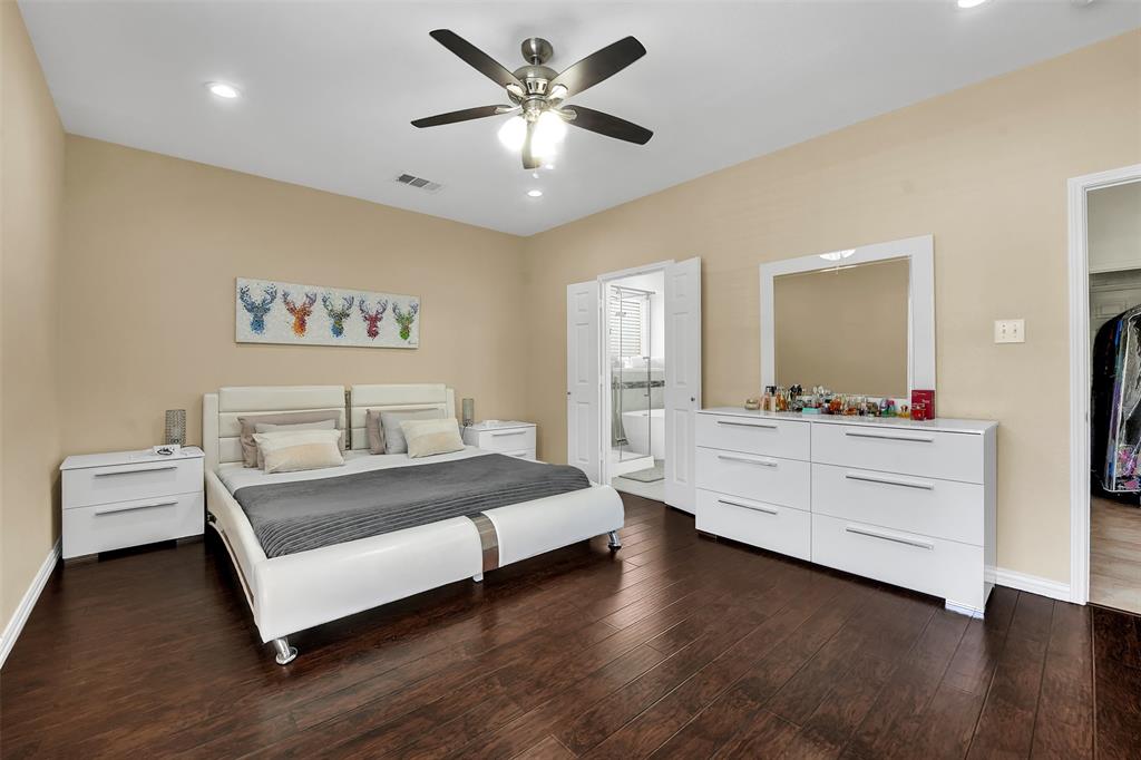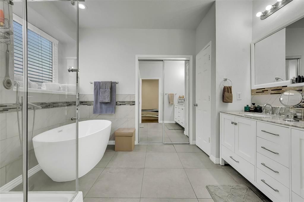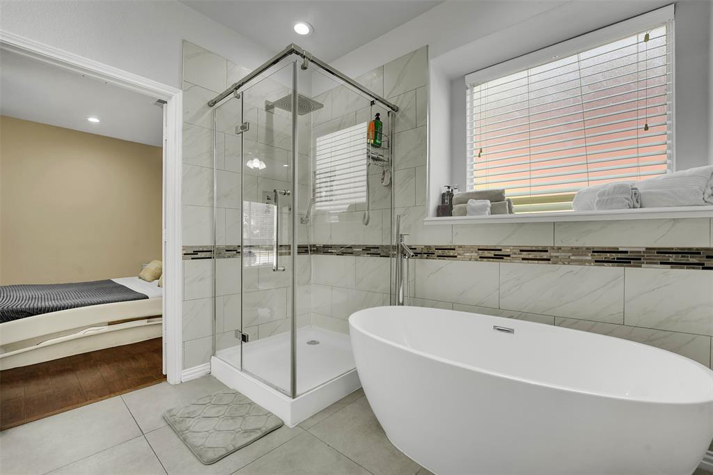 The oversized primary suite is a peaceful retreat with wood flooring, dual closets, and a spa-inspired bathroom complete with a modern freestanding tub, walk-in shower, and double vanities. Upstairs you’ll find three generously sized bedrooms, a fully remodeled bathroom with sleek tile work, and versatile spaces perfect for game rooms, home offices, or creative studios.