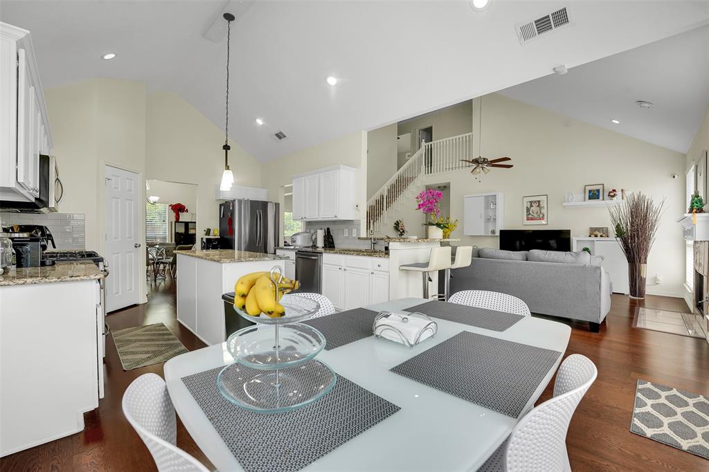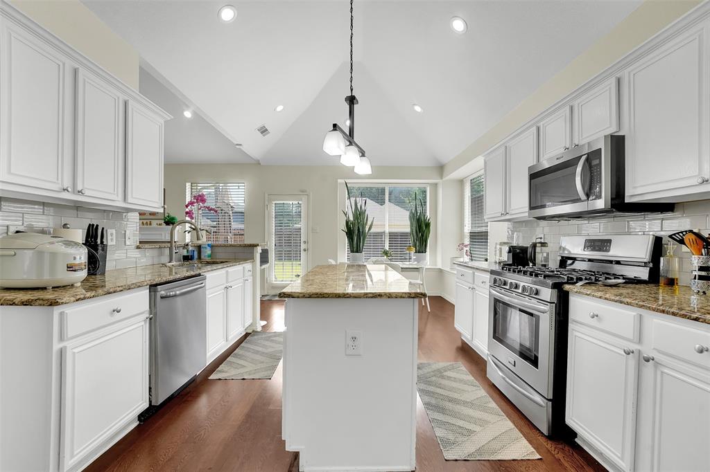 Step inside to soaring ceilings, rich wood flooring, and a bright, open layout that invites natural light throughout. The updated kitchen features granite countertops, crisp white cabinetry, stainless steel appliances, and a spacious island ideal for meal prep and casual dining. The kitchen flows effortlessly into the main living area, making it perfect for entertaining or relaxing with family.