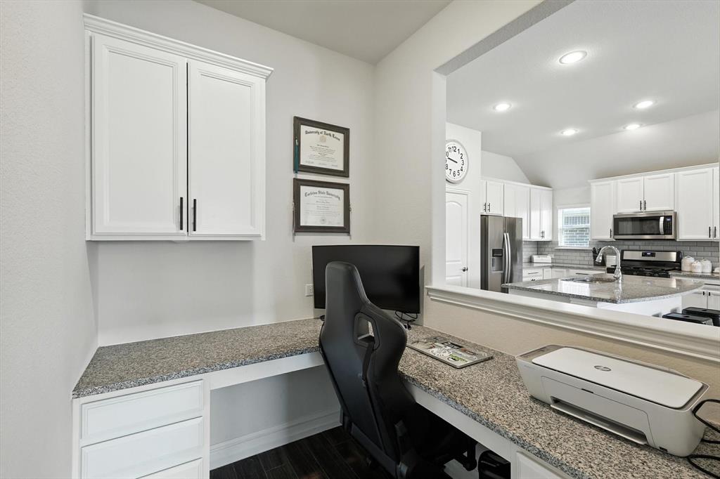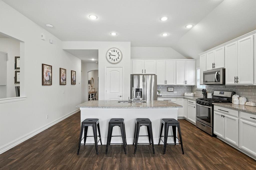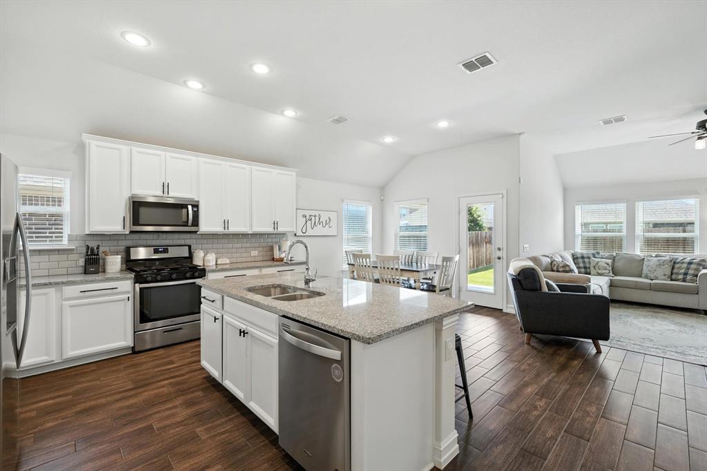 The contemporary kitchen is a true centerpiece—complete with granite countertops, stainless steel appliances, abundant cabinetry, and an oversized island perfect for entertaining or casual dining.