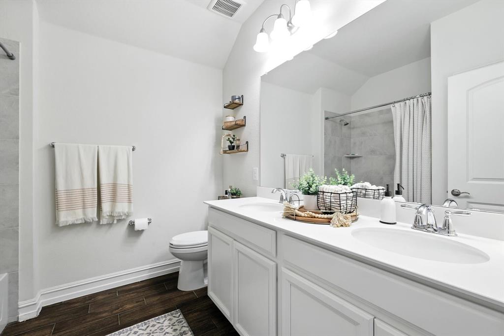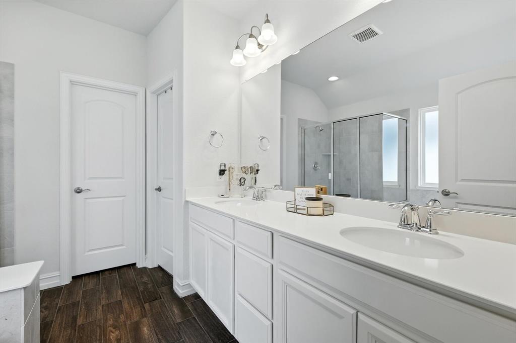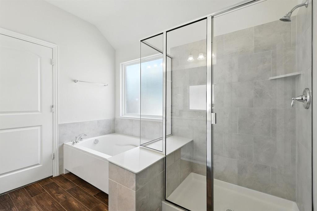 The private primary suite offers a tranquil retreat with a bathroom that includes dual vanities, a soaking tub, separate shower, and a large walk-in closet.
