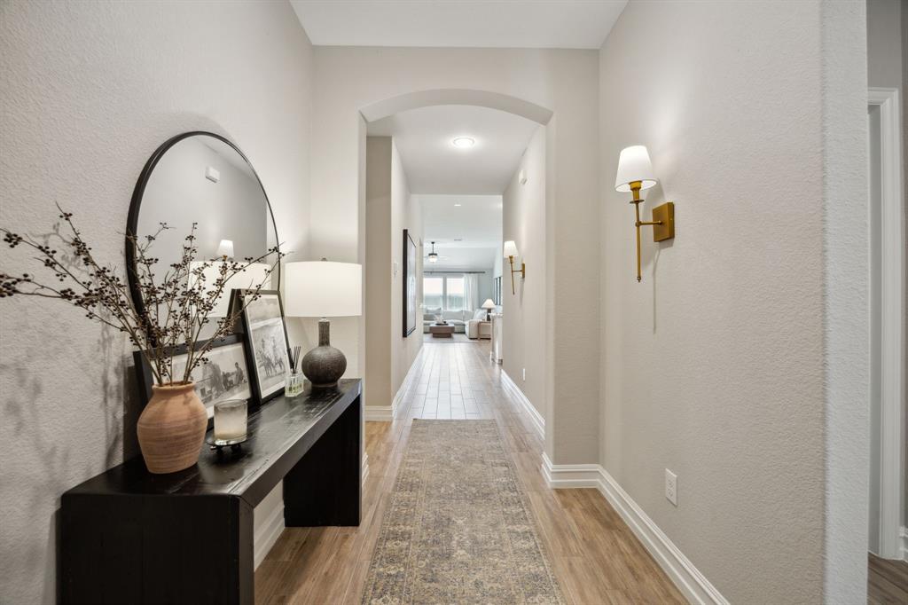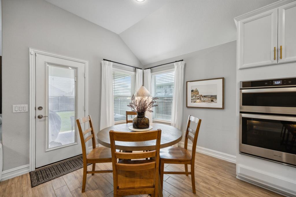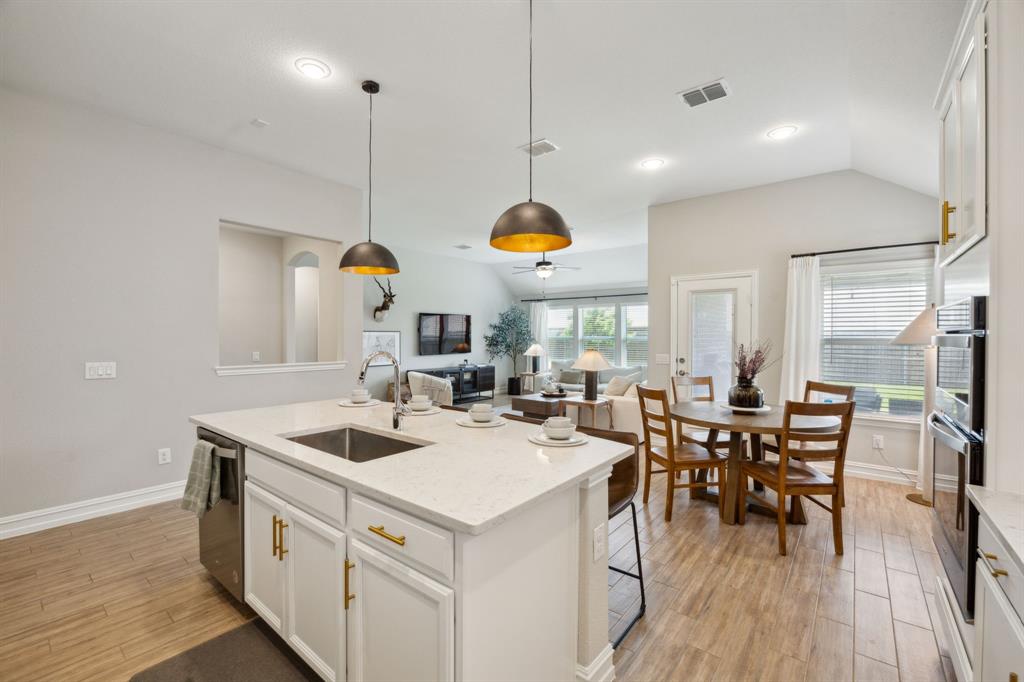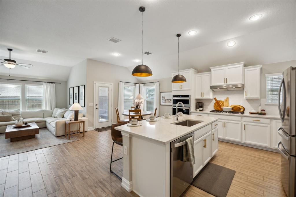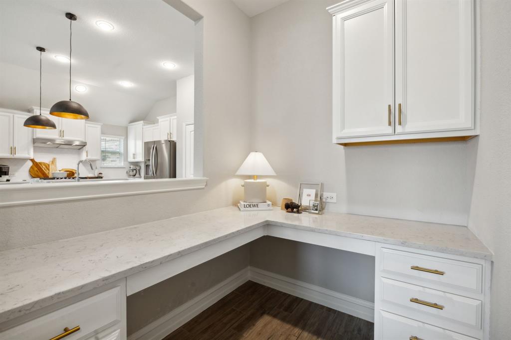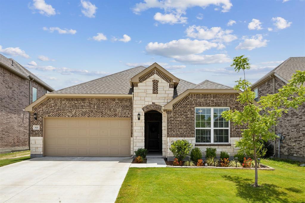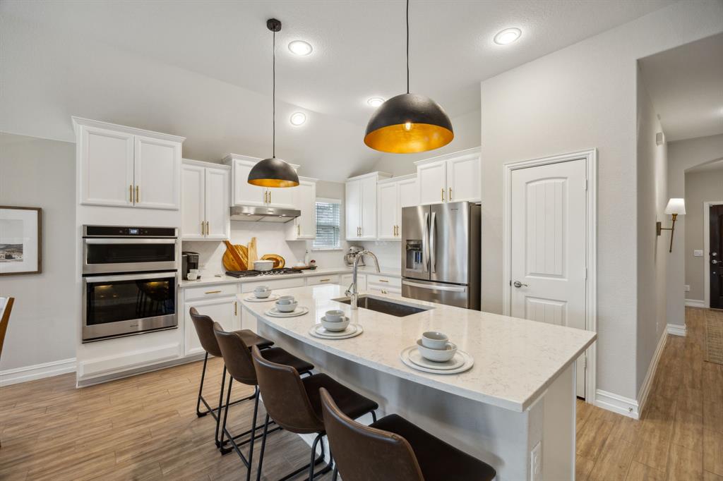 Like-new 4 bed, 2 bath, 2021 build loaded with incredible finishes throughout, zoned into coveted Northwest ISD! As you enter, you're greeted by light oak wood-look tile flooring. It adds a touch of modern character to the space without sacrificing durability. The open layout of the kitchen and living area offers a perfect space for hosting friends and family. The space is flooded with natural light to give it an open and welcoming feel. The bright white kitchen is outfitted with sleek quartz countertops, stylish tile backsplash, a stainless steel double oven, a spacious island with breakfast bar, and drop lighting. A built-in quartz desk in a nook off the kitchen offers a great space to work from home, and built-in cabinetry gives you extra storage space. The private primary suite comes complete with dual quartz vanities, updated mirrors and fixtures, a walk-in tile shower, a garden tub, and a walk-in closet that connects to the utility room, making laundry a breeze! The second bath also features a dual quartz vanity, plus other modern finishes, and a mudroom creates a perfect transition space upon entering and leaving. The tasteful gold fixtures throughout add elegance and charm to the entire home. This is one of the few homes with a 4th bedroom option at this price and size, and it could also double nicely as another dedicated office option for those who work from home. Out back, the covered patio looks out to the oversized backyard with a sprinkler system and gutters to ensure your yard stays looking great all year long. If you're new to the area, make sure to check out all the amazing retail and dining coming in close by, giving you everything you need within minutes!