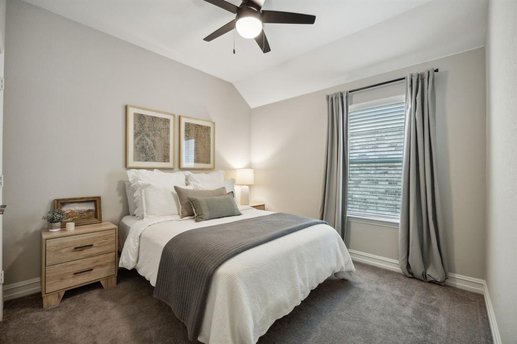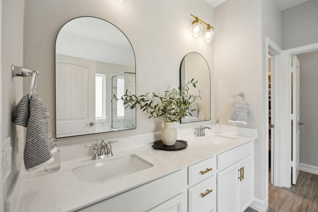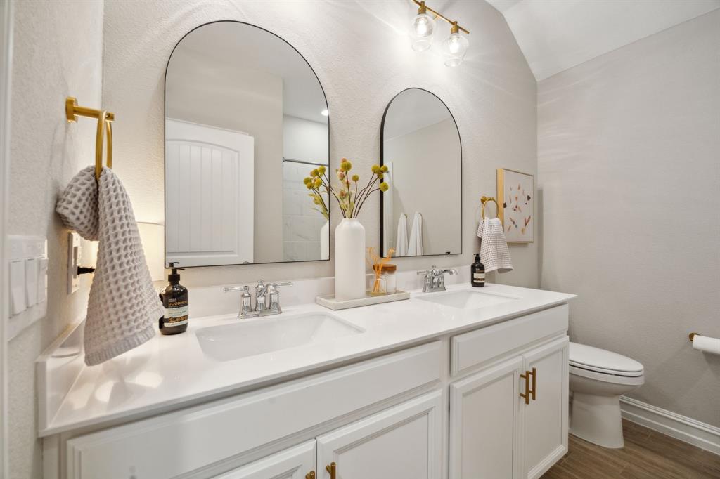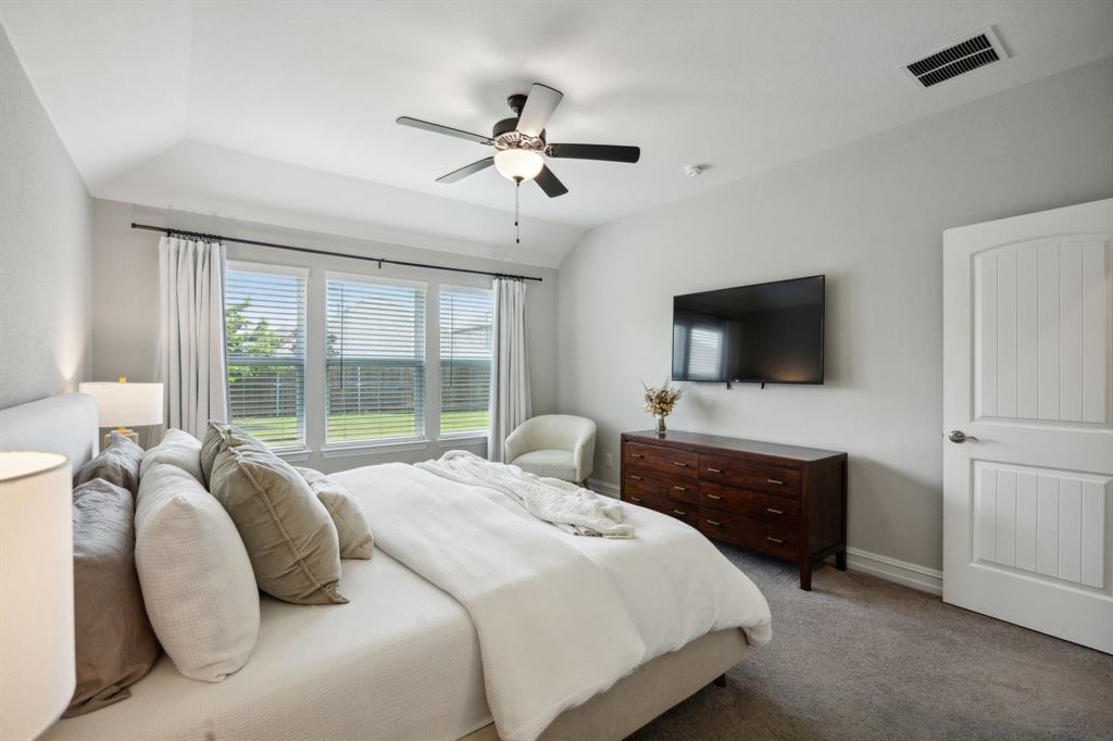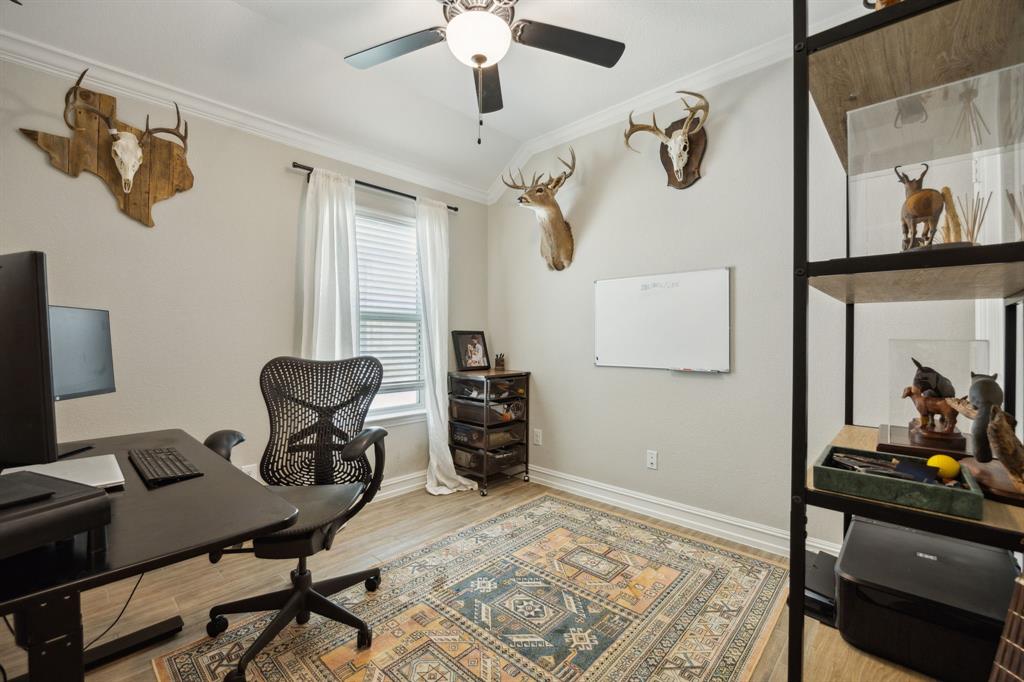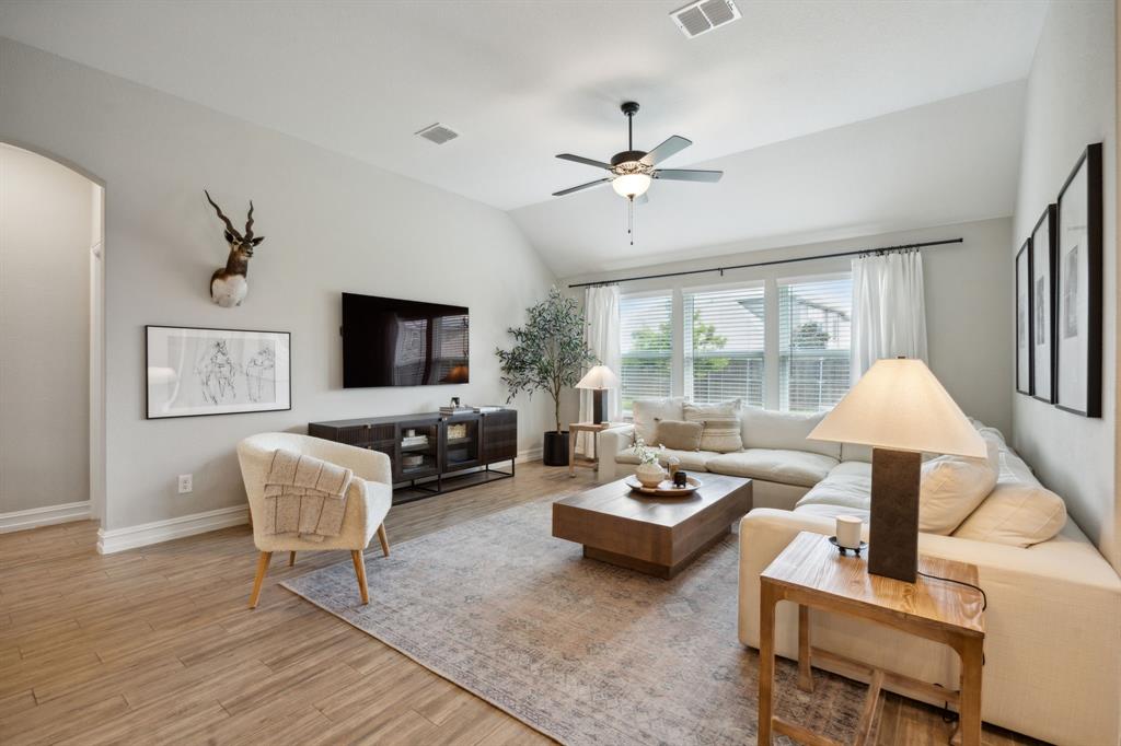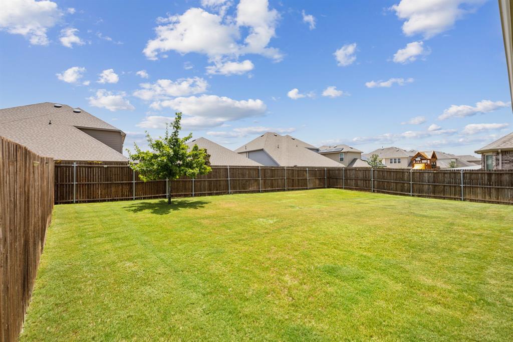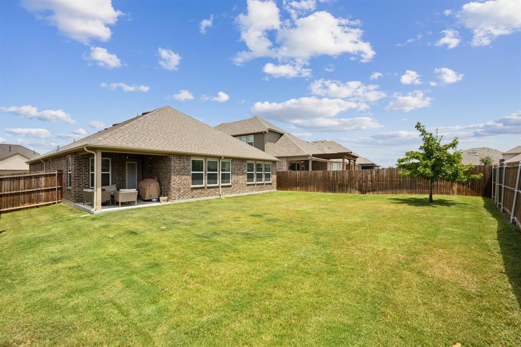 Like-new 4 bed, 2 bath, 2021 build loaded with incredible finishes throughout, zoned into coveted Northwest ISD! As you enter, you're greeted by light oak wood-look tile flooring. It adds a touch of modern character to the space without sacrificing durability. The open layout of the kitchen and living area offers a perfect space for hosting friends and family. The space is flooded with natural light to give it an open and welcoming feel. The bright white kitchen is outfitted with sleek quartz countertops, stylish tile backsplash, a stainless steel double oven, a spacious island with breakfast bar, and drop lighting. A built-in quartz desk in a nook off the kitchen offers a great space to work from home, and built-in cabinetry gives you extra storage space. The private primary suite comes complete with dual quartz vanities, updated mirrors and fixtures, a walk-in tile shower, a garden tub, and a walk-in closet that connects to the utility room, making laundry a breeze! The second bath also features a dual quartz vanity, plus other modern finishes, and a mudroom creates a perfect transition space upon entering and leaving. The tasteful gold fixtures throughout add elegance and charm to the entire home. This is one of the few homes with a 4th bedroom option at this price and size, and it could also double nicely as another dedicated office option for those who work from home. Out back, the covered patio looks out to the oversized backyard with a sprinkler system and gutters to ensure your yard stays looking great all year long. If you're new to the area, make sure to check out all the amazing retail and dining coming in close by, giving you everything you need within minutes!