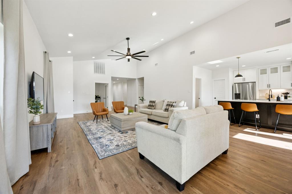 Fantastic opportunity! Newer home minutes from the incredible Historic Downtown McKinney! Completed in 2023, this impressive home boasts striking curb appeal with modern paint colors, covered front porch, two private back porches, a HUGE fenced pool sized backyard and all the benefits of living close to Downtown McKinney without all the historic district restrictions! Step up to the modern split light front door and enjoy the charming front porch- perfect for chatting with neighbors or just enjoying the outdoors. Step inside and be ready to be impressed! This light and bright open floorplan boasts 9 foot ceilings vaulted to 14 feet in the living room, fantastic flow and abundant natural light from multiple windows. Features of the home include easy care LVP flooring throughout (except baths), modern ceiling fans with remote control in most rooms and quartz in kitchen and baths. The spacious living room is open to the kitchen and dining making it perfect for entertaining. The kitchen is a dream with quartz countertops, massive island, enormous walk in pantry and stacked cabinets with glass to showcase your treasures with soft close cabinetry. Just off the living room is a private office, perfect for dedicated work from home space but not too far from family activity. The spacious primary has backyard access, spa like en suite bath and massive walk in closet. The split secondary bedrooms are also nice sized! The home has a huge fenced backyard that is perfect for pets and kids to run and play. Two sheds for great storage. Convenient to all that Historic Downtown McKinney has to offer including shopping and dining, this location can't be beat. Don't miss this one! Please note that this is an active AIRBNB. Do not approach property with out an approved appointment.