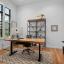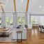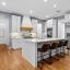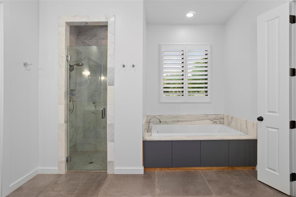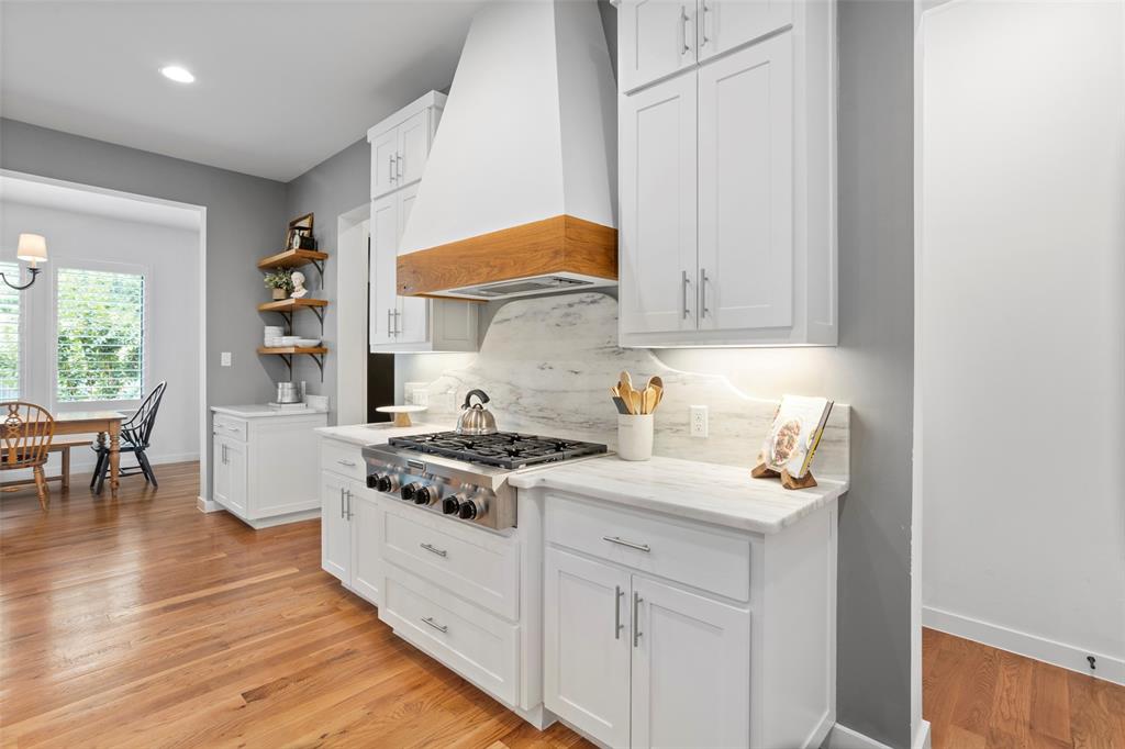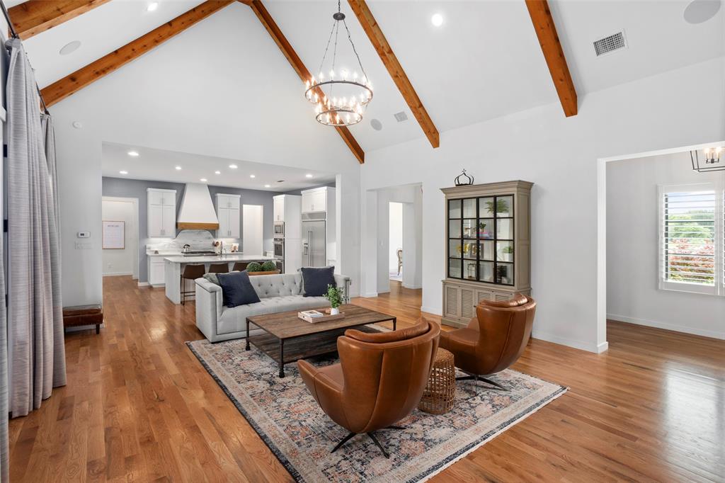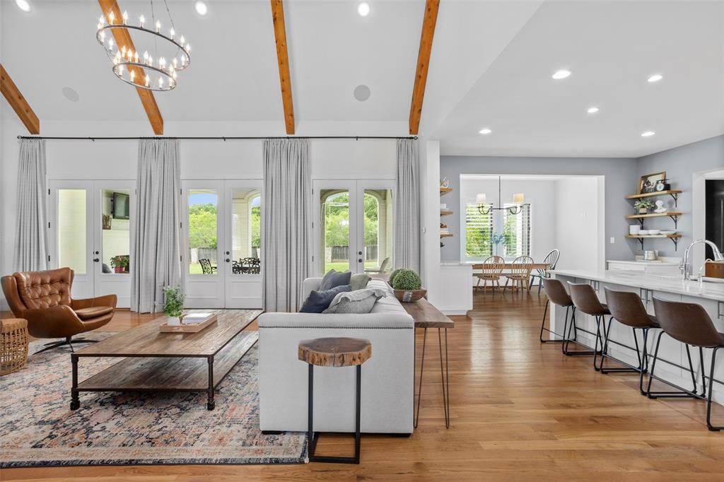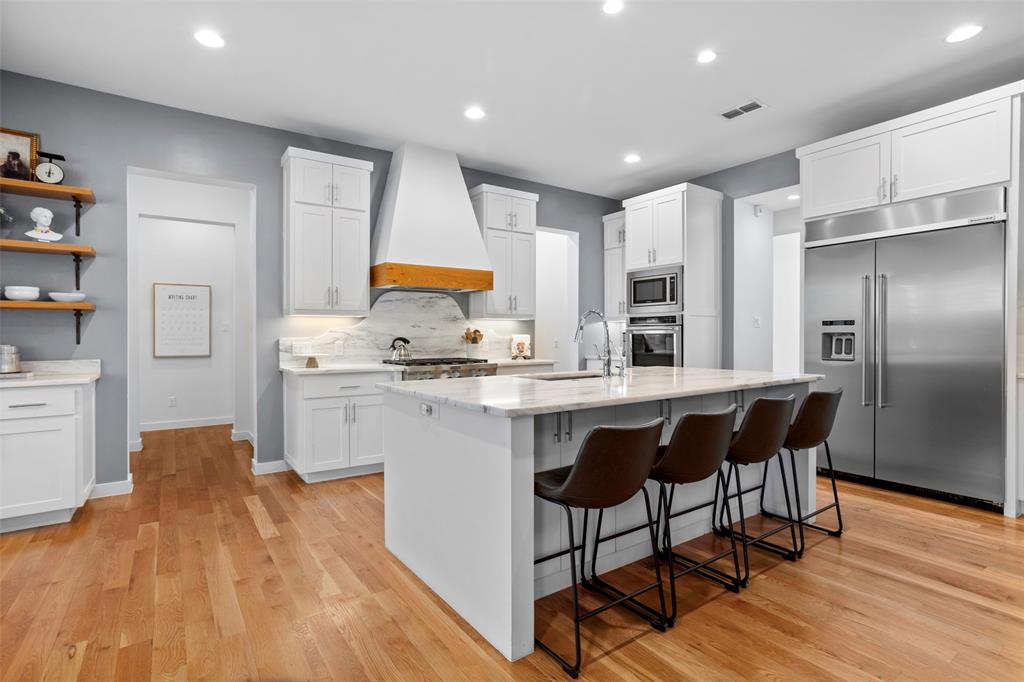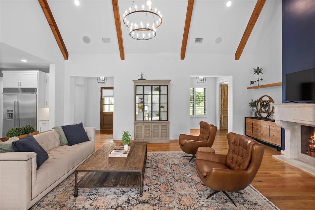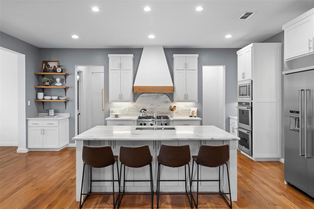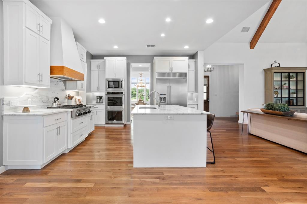 The heart of the home is the elevated chef’s kitchen, designed for both beauty and function. White marble countertops stretch across a large center island, perfect for gathering and entertaining. A gas stove, double oven, double pantry, and abundant custom cabinetry provide exceptional storage and cooking capability. The open layout flows seamlessly into the expansive living room, where vaulted ceilings, rich wood floors, and a wall of windows create a bright and inviting atmosphere, showcasing backyard and pool views. Plantation shutters throughout add elegance and light control.