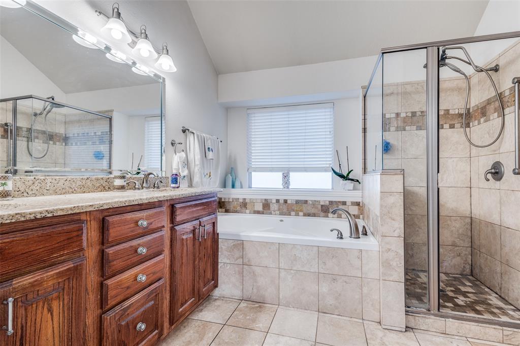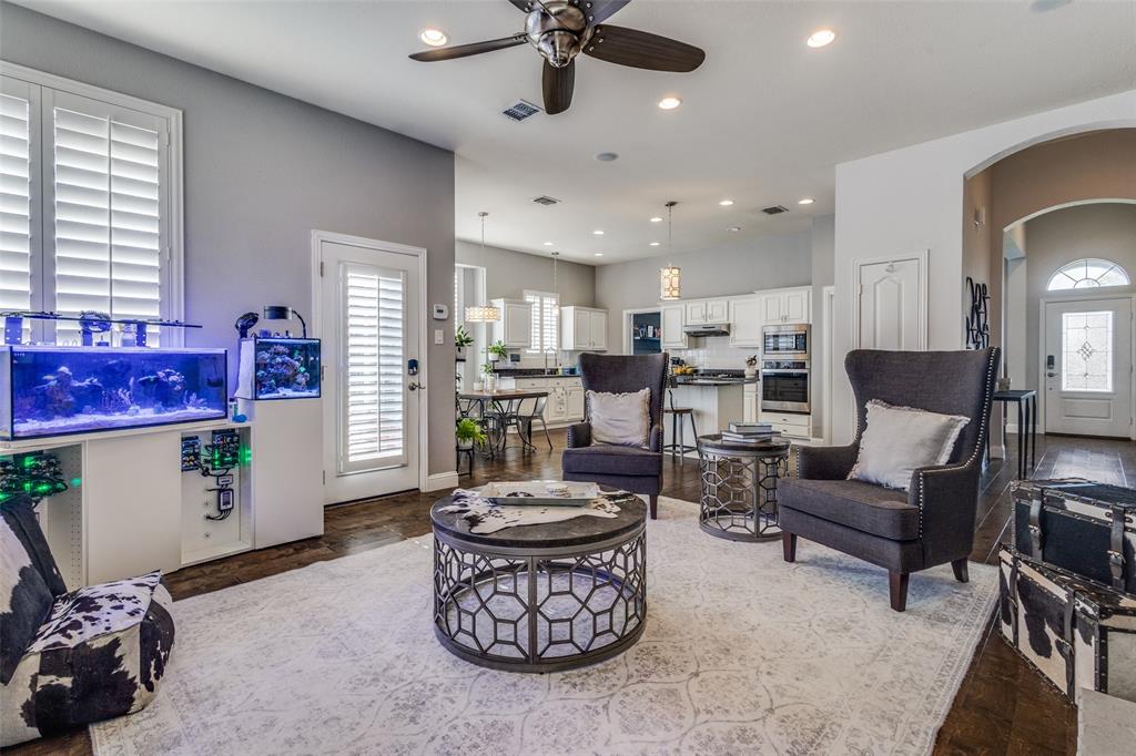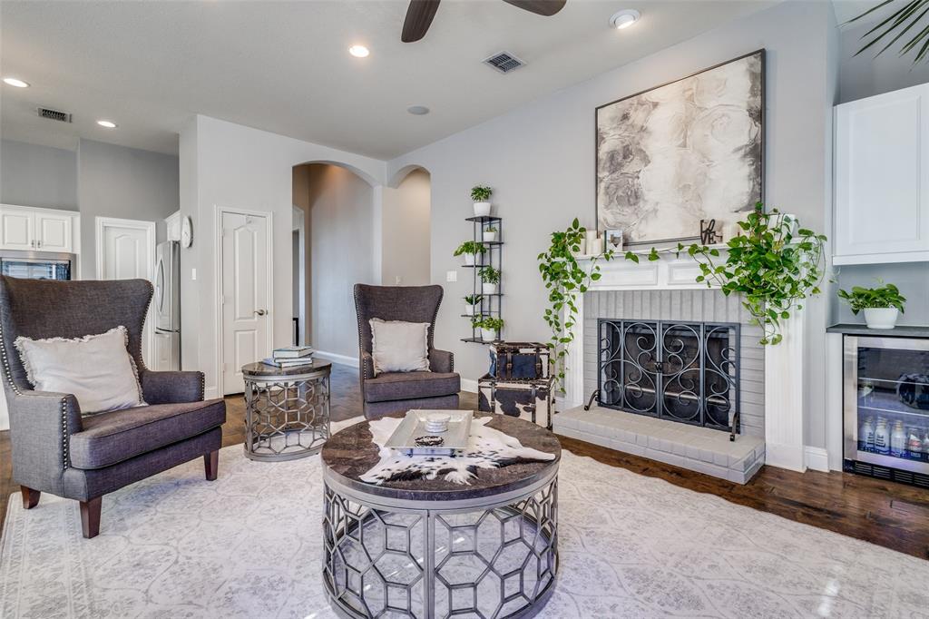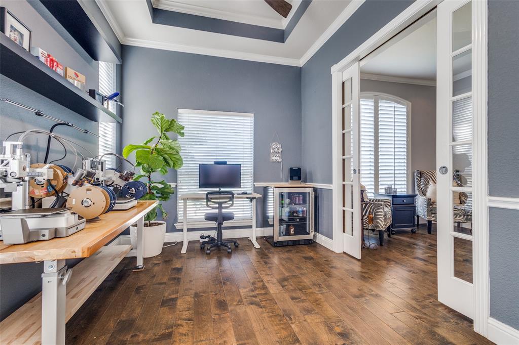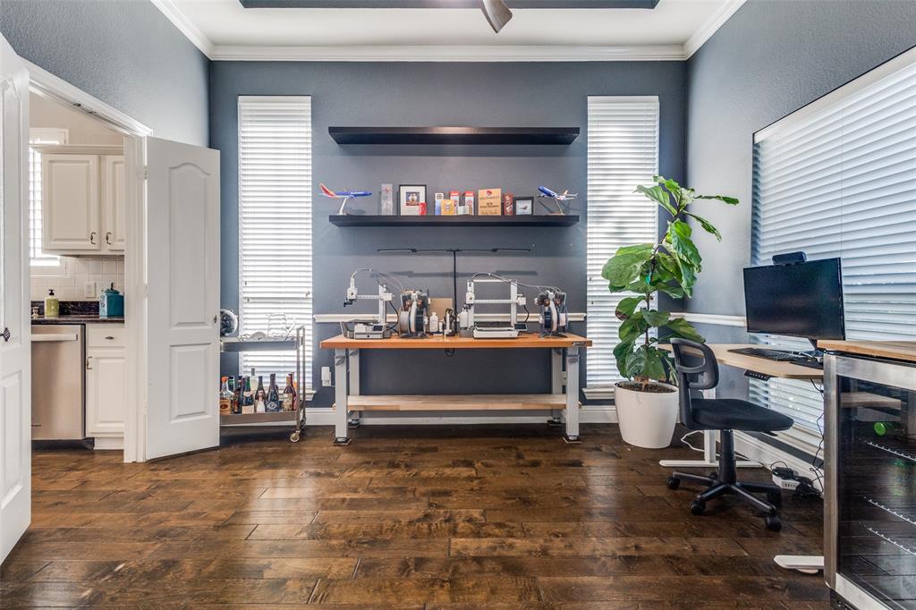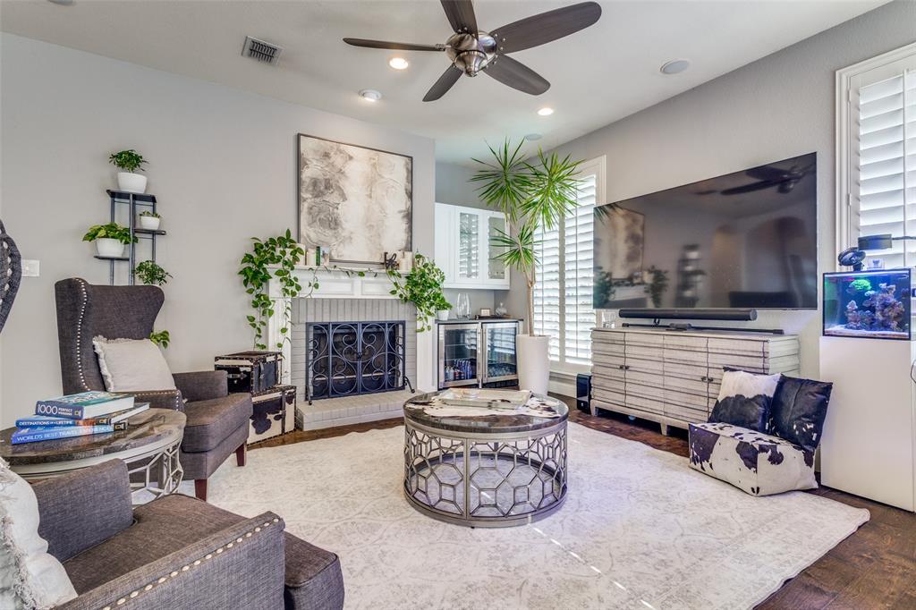 The light-filled living area invites relaxation with LED accents, a cozy gas-log fireplace, and a stylish dry bar complete with a built-in mini cooler—perfect for entertaining. Work from home in the spacious office, then unwind in your luxurious primary suite featuring a garden tub, dual vanities, and a walk-in closet.