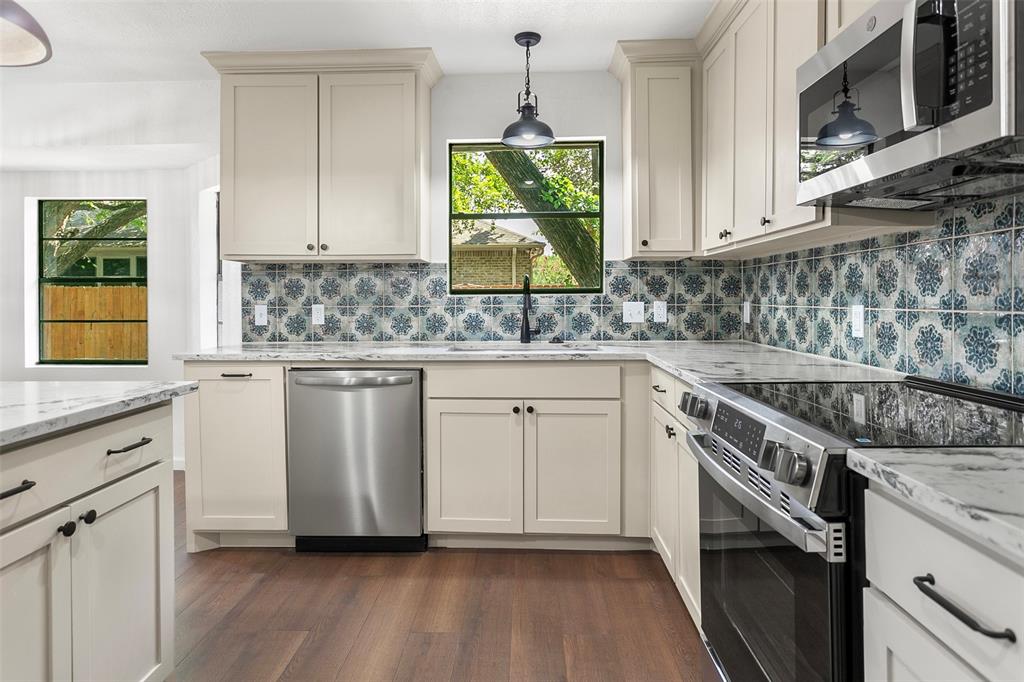 The kitchen is a true showstopper, featuring stunning quartz countertops, brand new stainless steel appliances, and plenty of workspace for everyday living or entertaining. Luxury vinyl plank flooring flows throughout the main areas, combining durability with a modern, high-end look.