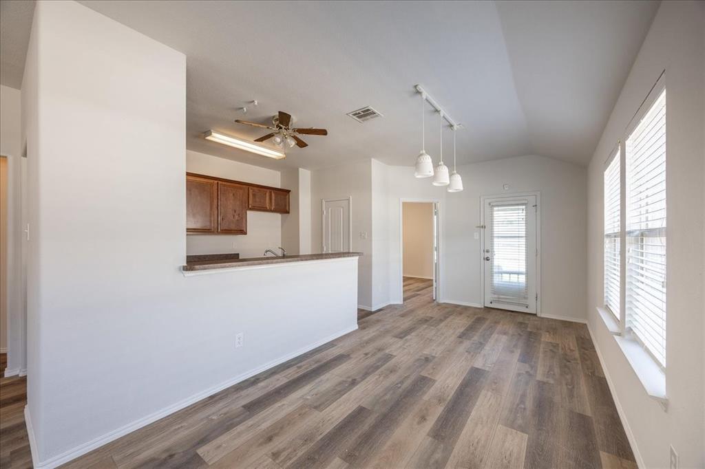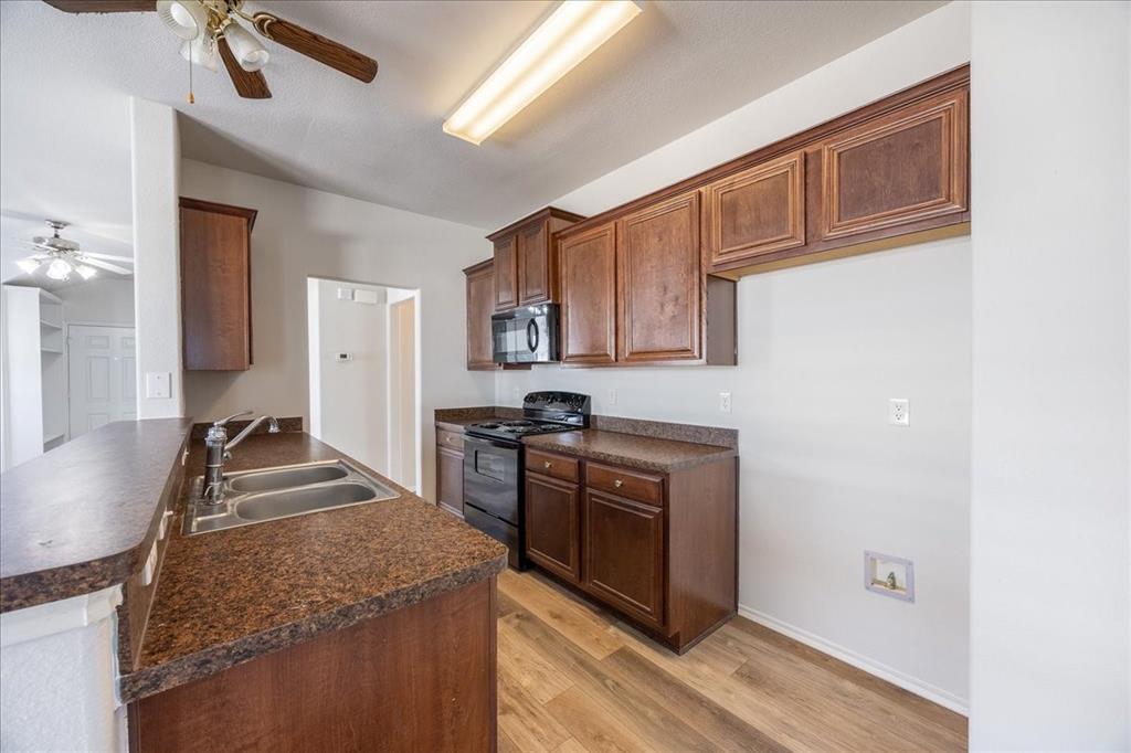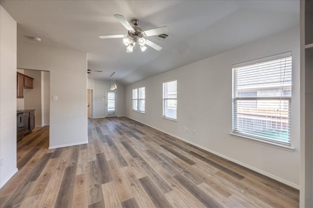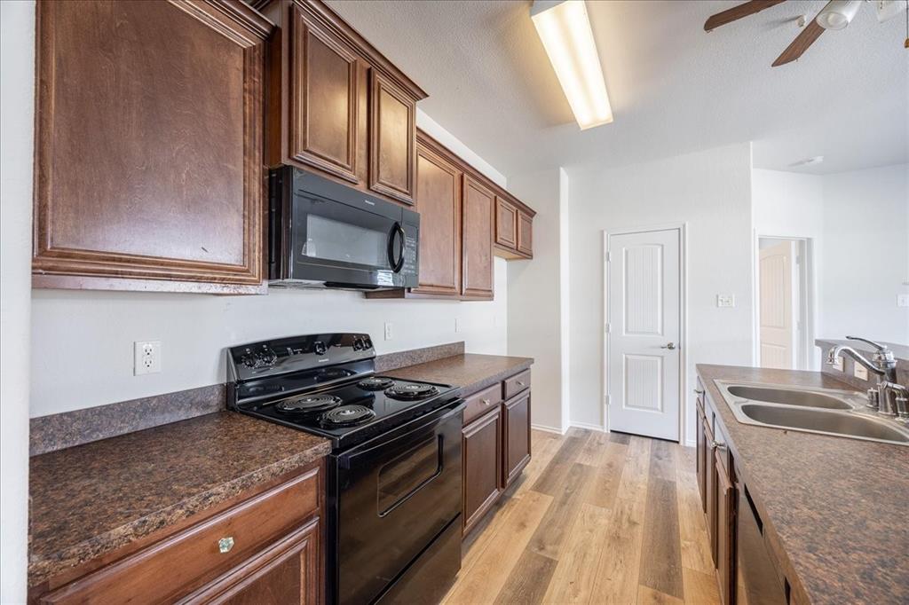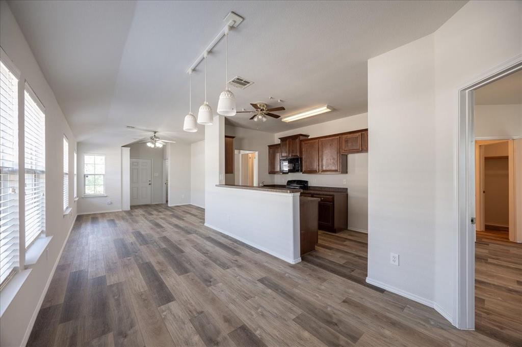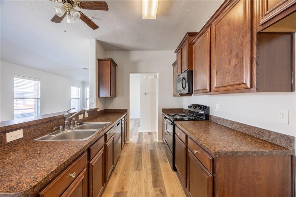 Welcome to your new home in Heartland. This would be fantastic for a first-time home buyer or as an investment property. This one-story home is nice and bright. Brand new luxury vinyl flooring and fresh paint throughout. New oven, new microwave, new dishwasher. The living room opens up to galley kitchen with a generous breakfast bar and dining area. The secondary bedrooms are located at the front of the house along with the secondary bathroom. The large primary suite is located at the back of the house. It features an en-suite bathroom and a large walk-in closet. The backyard has a covered patio with plenty of room for an outdoor table and chairs. Across the street, you'll find a pond and the bus stop to school. Heartland has so much to offer. Three community pools. A fitness center. A 35-acre stocked pond for fishing. Parks, walking trails, and so much more. See this home today!