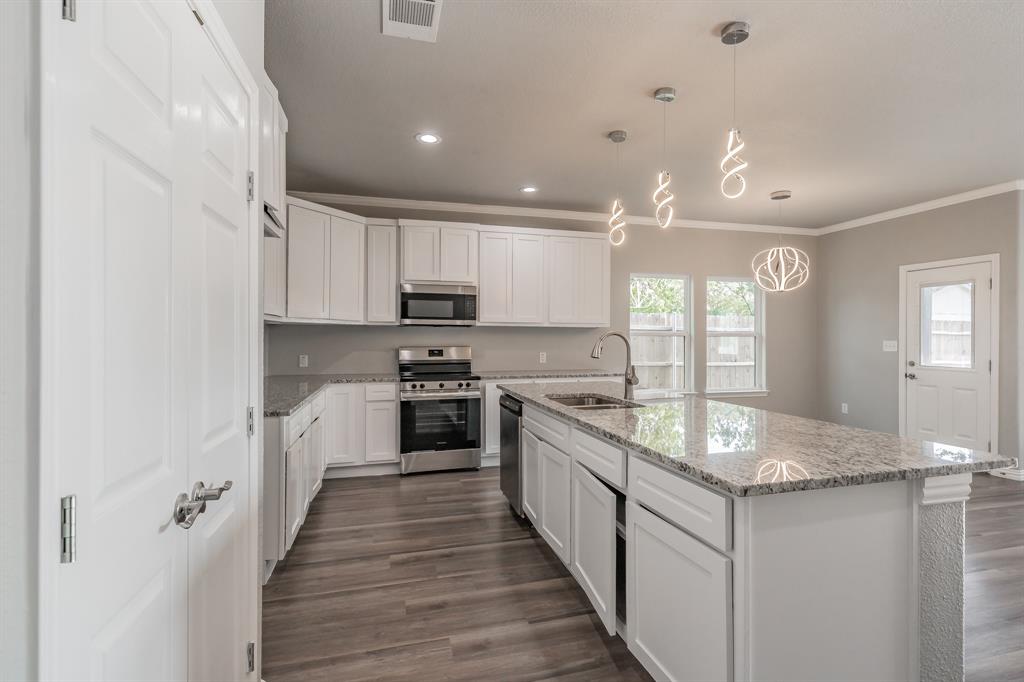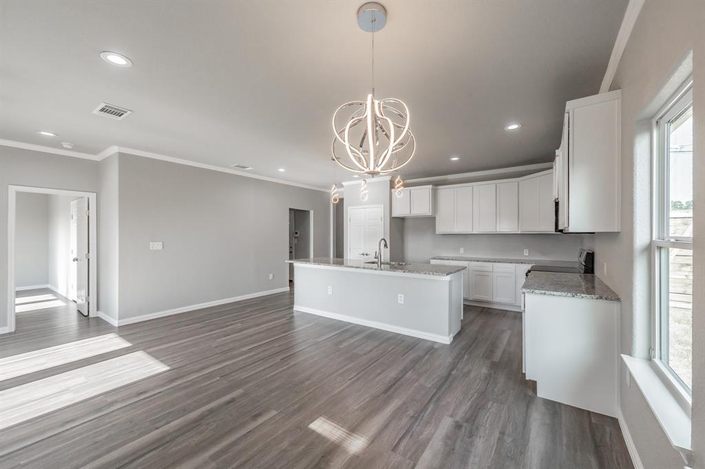 Step through the entryway to find luxury vinyl plank flooring throughout, designer lighting, and expansive windows that flood the space with natural light. The gourmet kitchen is a true showstopper — featuring granite countertops, custom cabinetry, a large center island with sink, and stylish pendant lighting — perfect for both everyday meals and entertaining guests.