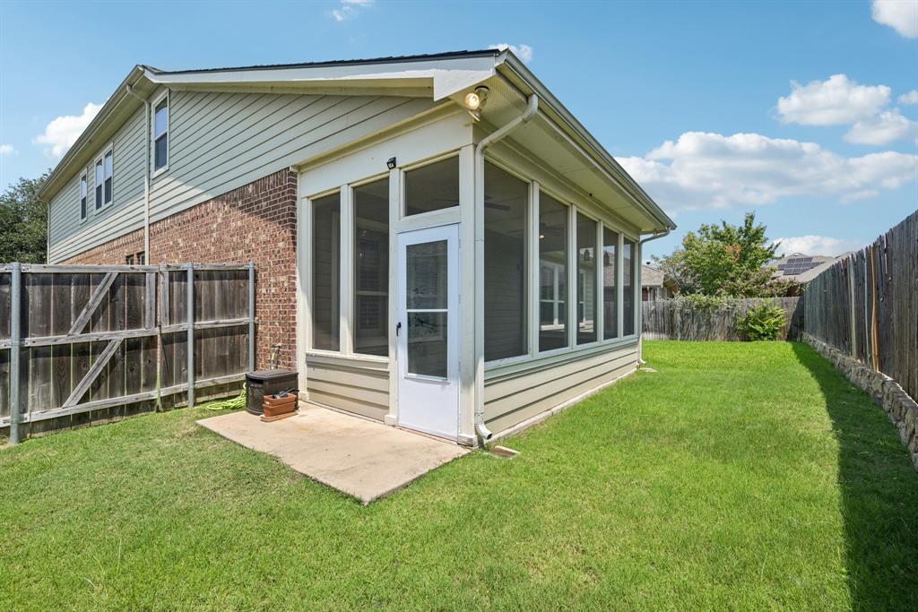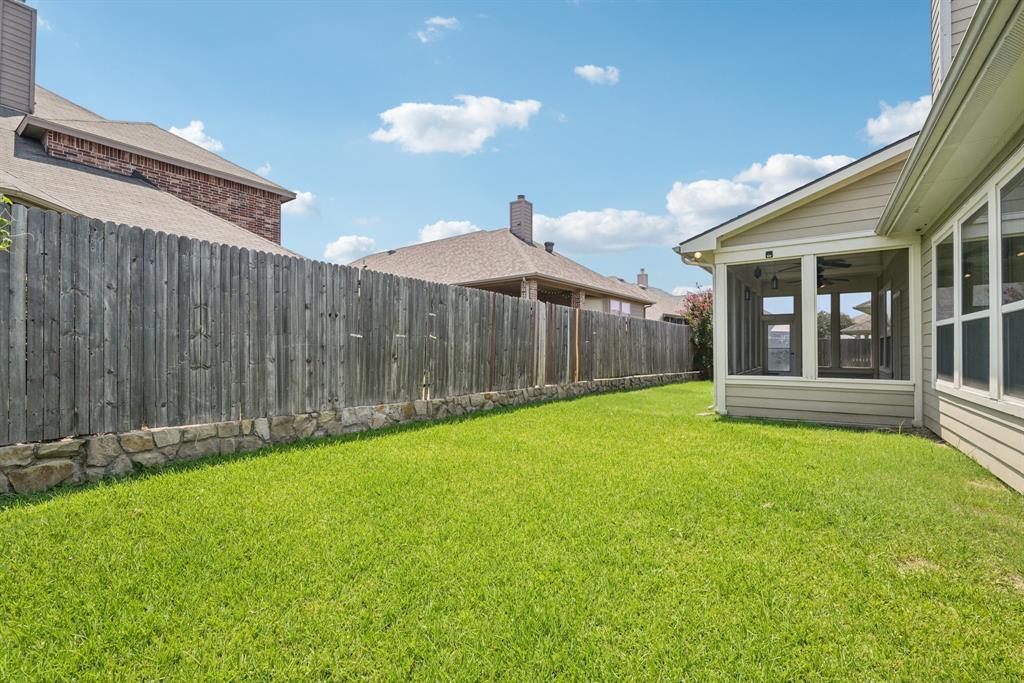The fenced backyard features a fully enclosed back porch with stone flooring, offering the perfect retreat for outdoor enjoyment.