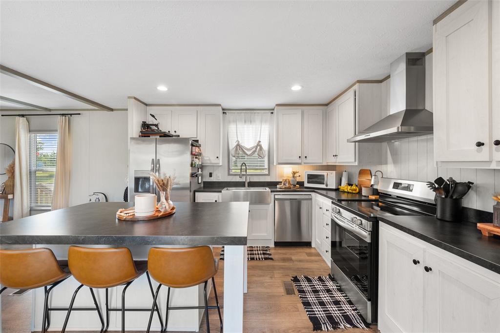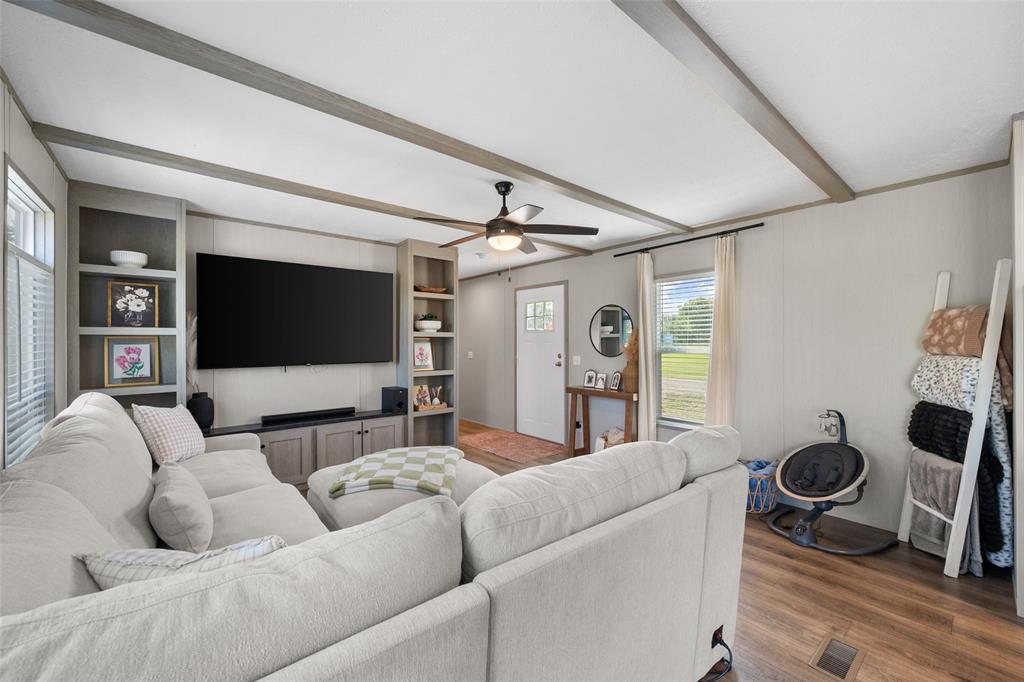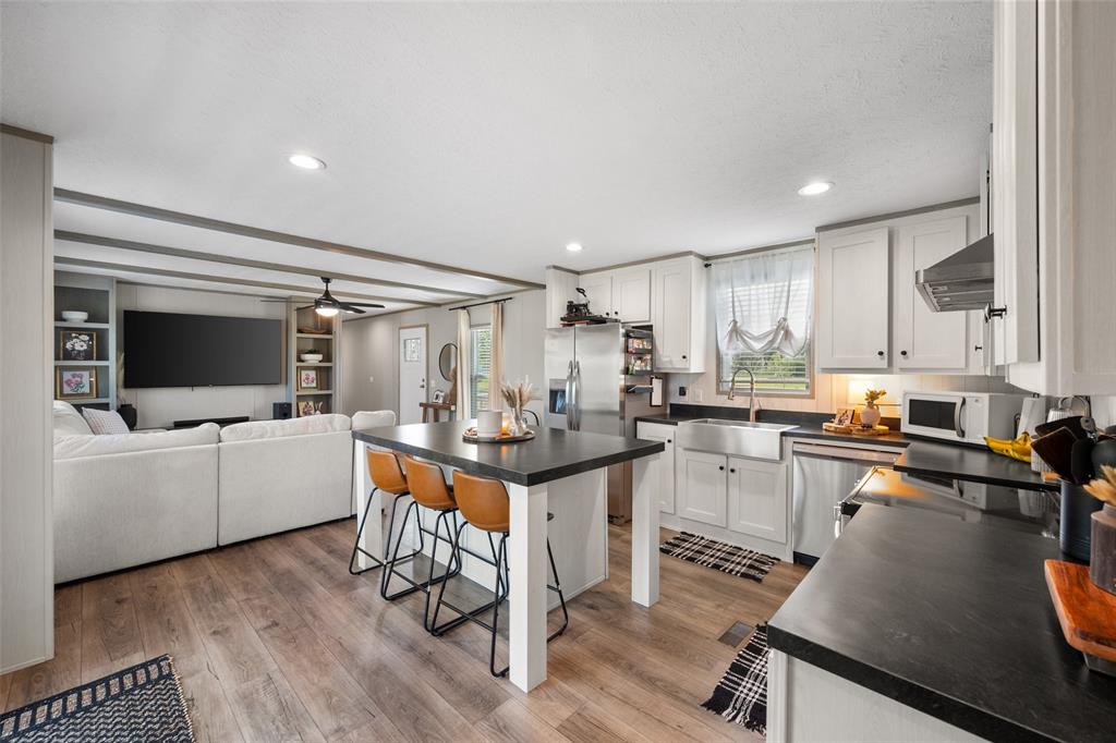 Just like new! Step inside this gently lived in 2024 Clayton Home with 3 bedrooms, 2 baths, and a great location in Frost ISD. The living room welcomes you with a warm, modern color palette and built-ins ready to frame your big-screen TV. The kitchen is a true showstopper with an oversized island, breakfast bar, farm sink, stainless steel appliances, and plenty of counter space and cabinets for all your cooking needs.