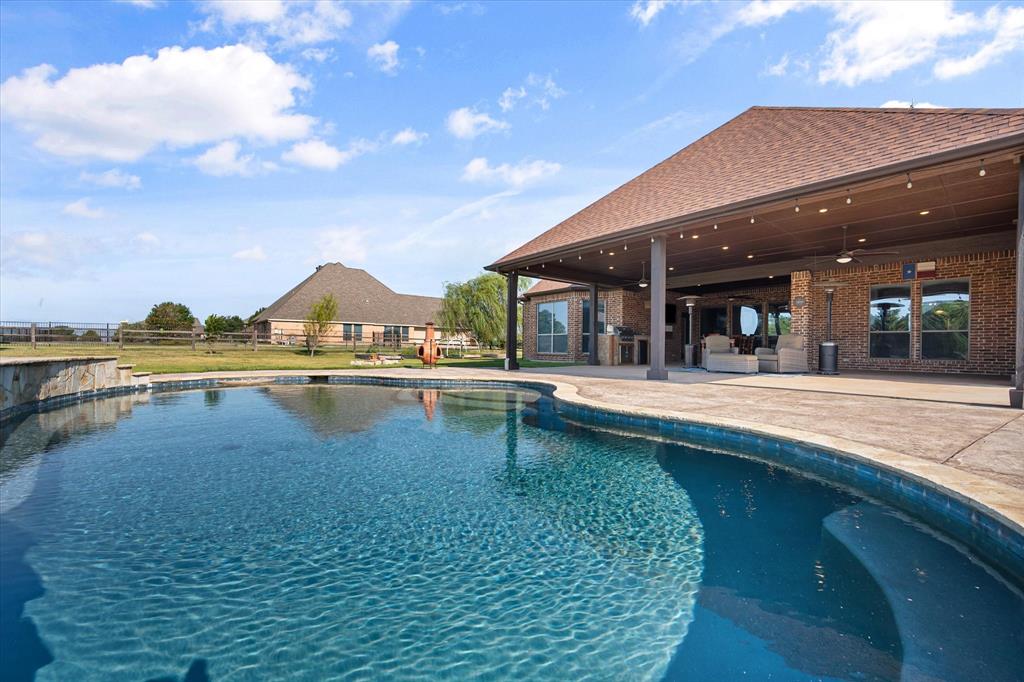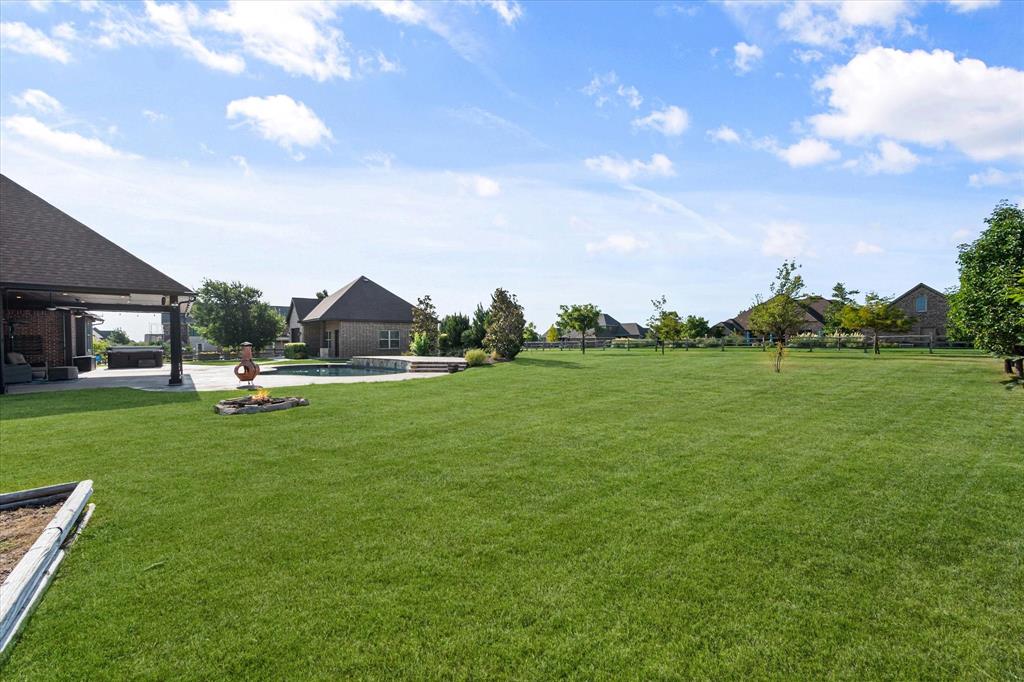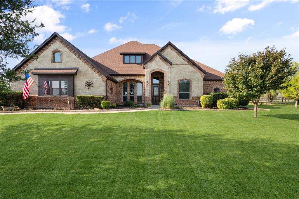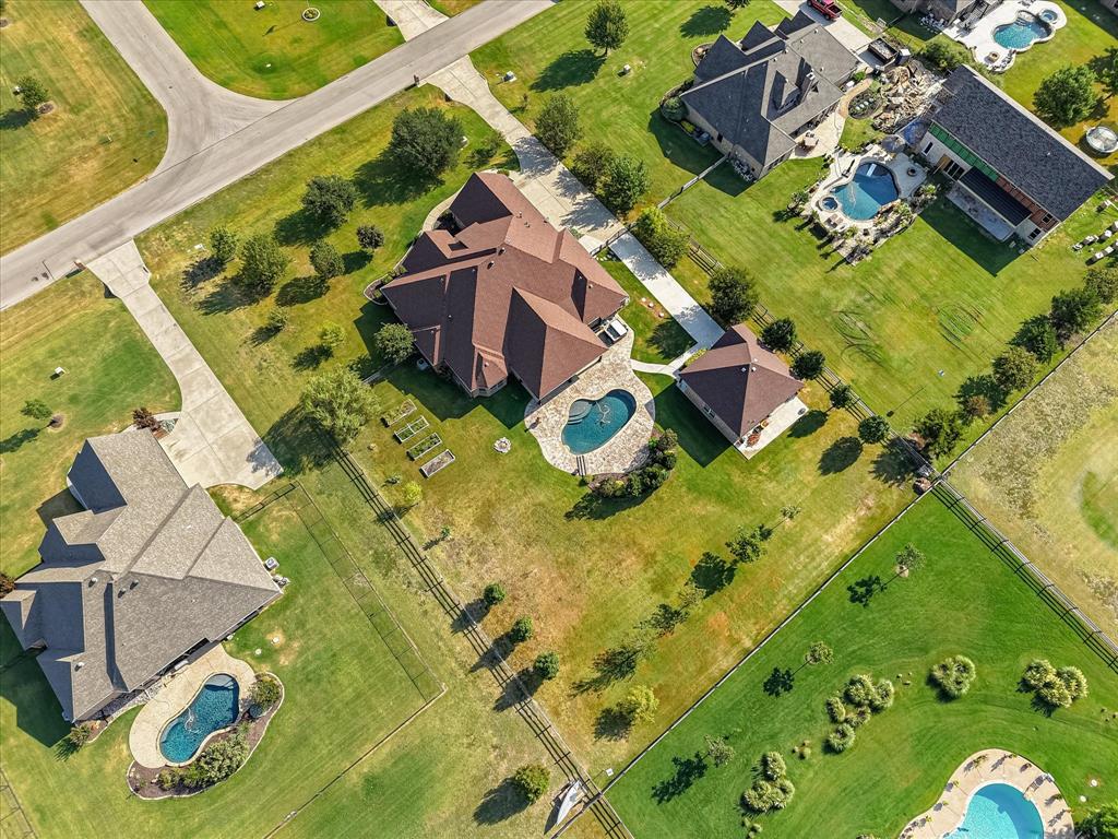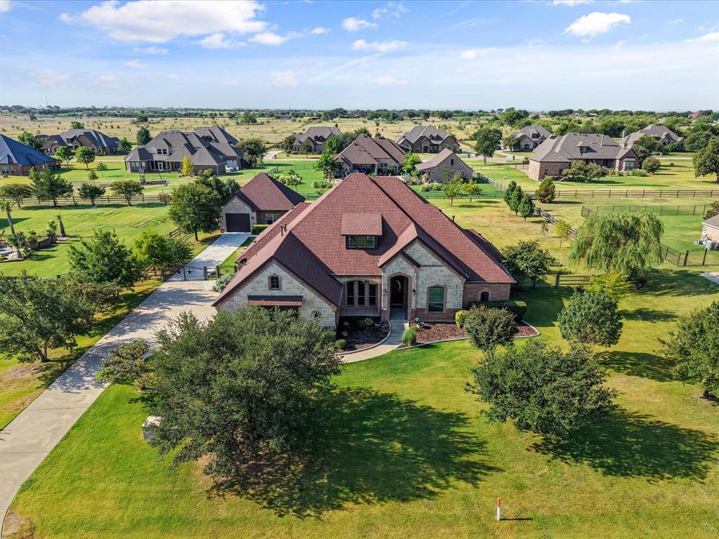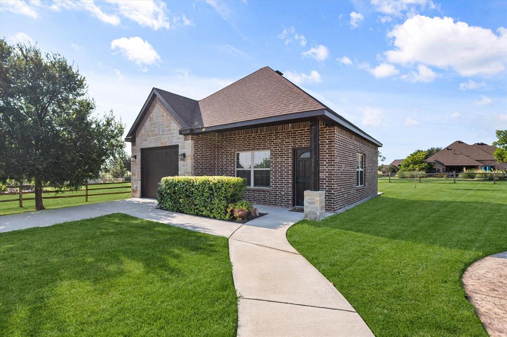 Immaculate single-story home on 1 acre in the highly desirable Vista Ranch community. With 4 spacious bedrooms, each with direct bathroom access, and a versatile 5th room perfect for a media room, game room, quiet home office, or gym, this home offers both comfort and flexibility. The thoughtful design includes split bedrooms, cathedral ceilings, true hardwood flooring, stain grade wood trim, and beautiful brick and stone detailing around the fireplace and kitchen. Special touches like a built-in spice rack in the pantry, generator outlet in the garage, and an abundance of closet storage make everyday living simply easier. Step outside to an outstanding backyard with a refreshing lagoon-style play pool, lush landscaping, and a covered patio that seamlessly extends your living space year round. A separate studio building with it's own 2 ton HVAC adds even more possibilities for independent living of an adult child, an aging parent or privacy for a regular visitor. *Tandem garage is fully insulated to allow for expansion of living if desired* This entire estate offers a lucky buyer the perfect blend of luxury and practicality. Zoned to Northwest ISD, this estate-style neighborhood is perfect for those who value space, quality finishes, and a strong sense of community.