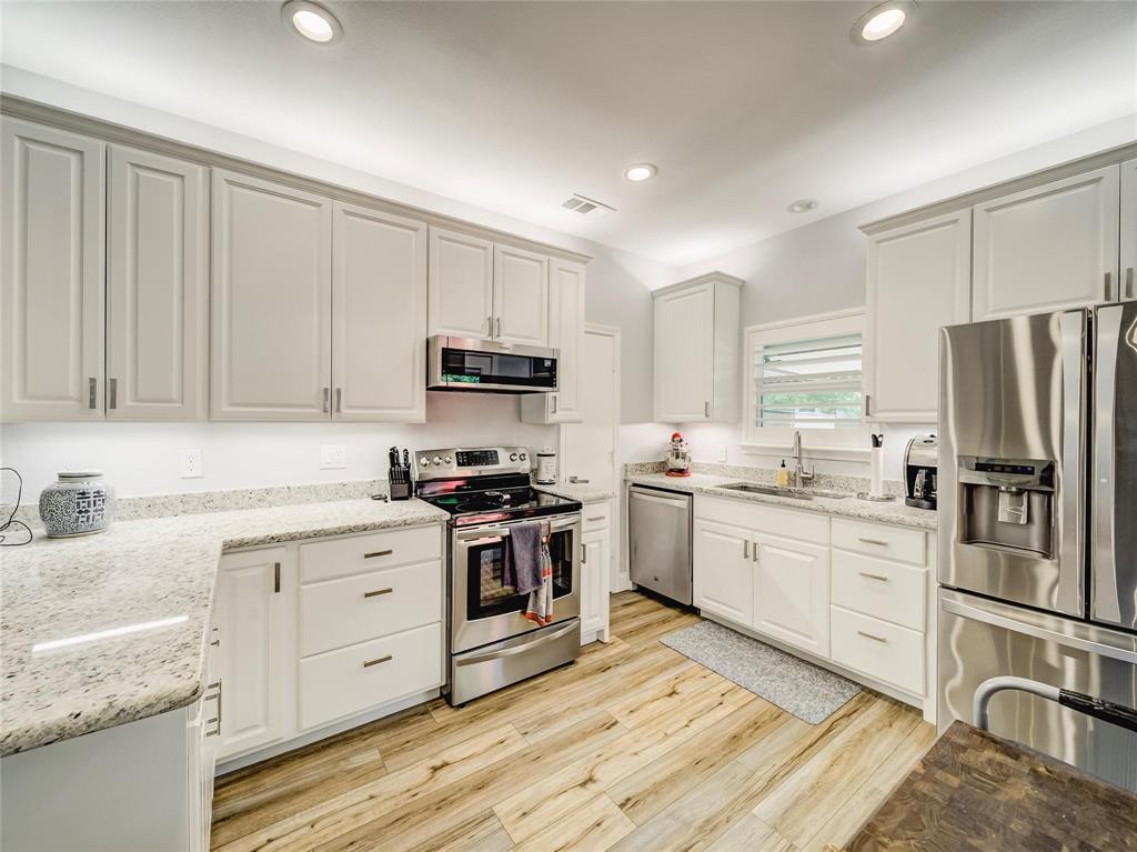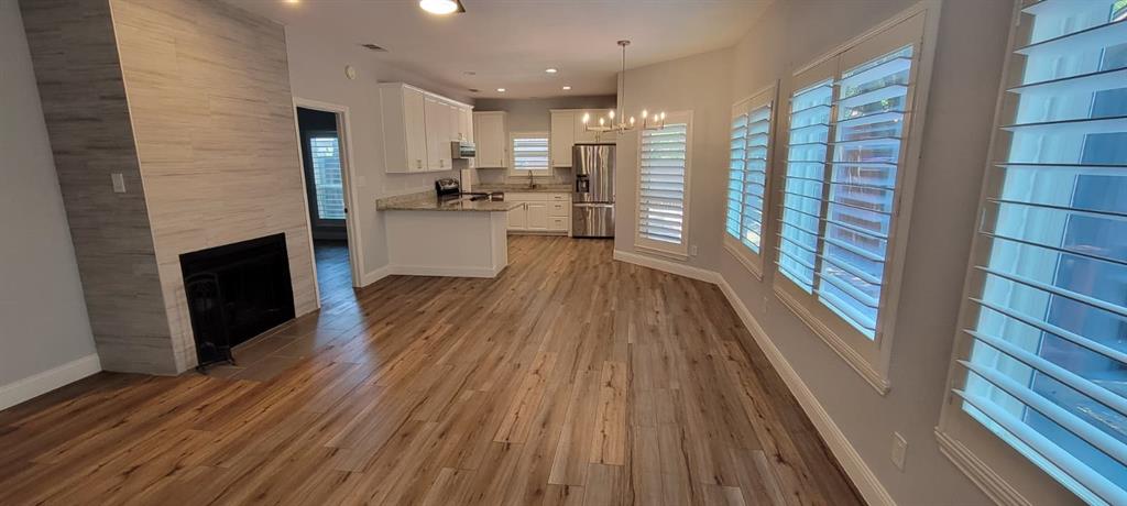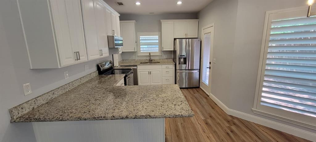 Step inside to an inviting open floor plan filled with warm natural light, neutral tones, and stylish modern accents. The spacious living area seamlessly connects to a recently remodeled U-shaped kitchen featuring granite countertops, stainless steel appliances, a breakfast bar, and direct access to the backyard—ideal for entertaining.