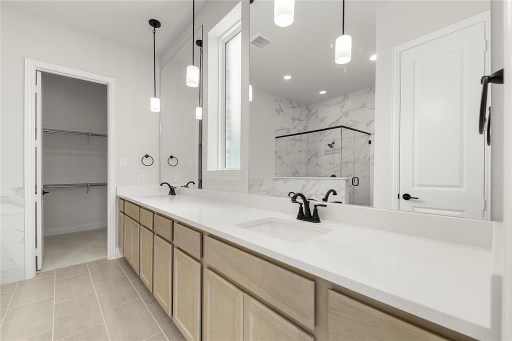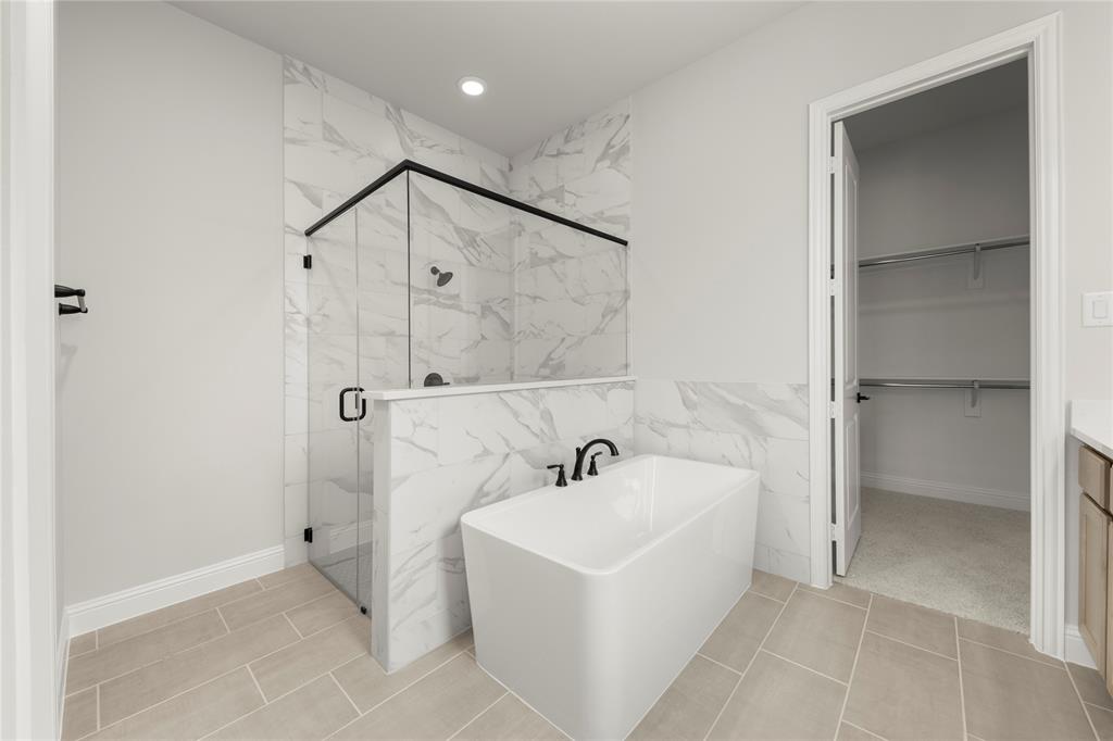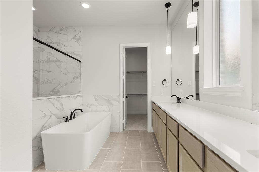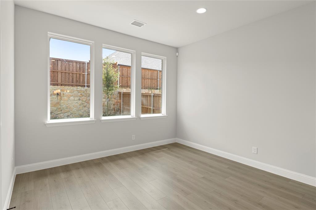 MLS# 21027708 - Built by RockWell Homes - Ready Now! ~ Picasso new home 5 bedrooms, 4.5 bathrooms, a dining room, home office, large game room, all complemented by a 3-car garage. The elegant exterior showcases a combination of ACME brick, metal roof accents, shutters, an 8-foot front & interior doors, and covered patios, creating a striking first impression. Upon entering, the foyer with soaring ceilings leads to a versatile home office and a formal dining area, which then flows into the expansive open-concept living and kitchen space. The kitchen is a chef’s dream, boasting a large island, solid surface countertops, GE stainless steel appliances, including a built-in gas cooktop, oven, microwave, and dishwasher. Additional features include a ceramic tile backsplash, 42-inch cabinets, a custom cabinet vent hood, undermount sink, Delta faucet, walk-in pantry, upgraded flooring, recessed can lighting, and upgraded cabinets. The family room, bathed in natural light from multiple dual-pane energy-efficient windows and 12ft sliding glass back door offers views of the covered patio and backyard. The primary suite, located privately at the back of the home, includes dual vanity sinks with solid surface countertops, Delta faucets, ceramic tile flooring, a ceramic tile shower with a semi-frameless glass enclosure, a freestanding soaker tub, a linen closet, a lighting package, towel bars and huge walk-in closet. Upstairs, three additional bedrooms are served by two full bathrooms and surround an oversized game room and media room perfect for entertaining or additional living space. This home also features a fully fenced private backyard, oversized home site with room for a pool, a landscaping package, a full sprinkler system, full gutters, energy-efficient HVAC, dual-pane energy-efficient windows, upgraded flooring, a mud bench, ample storage, a ceramic tile utility room with cabinets. Quick access to I30, downtown Dallas