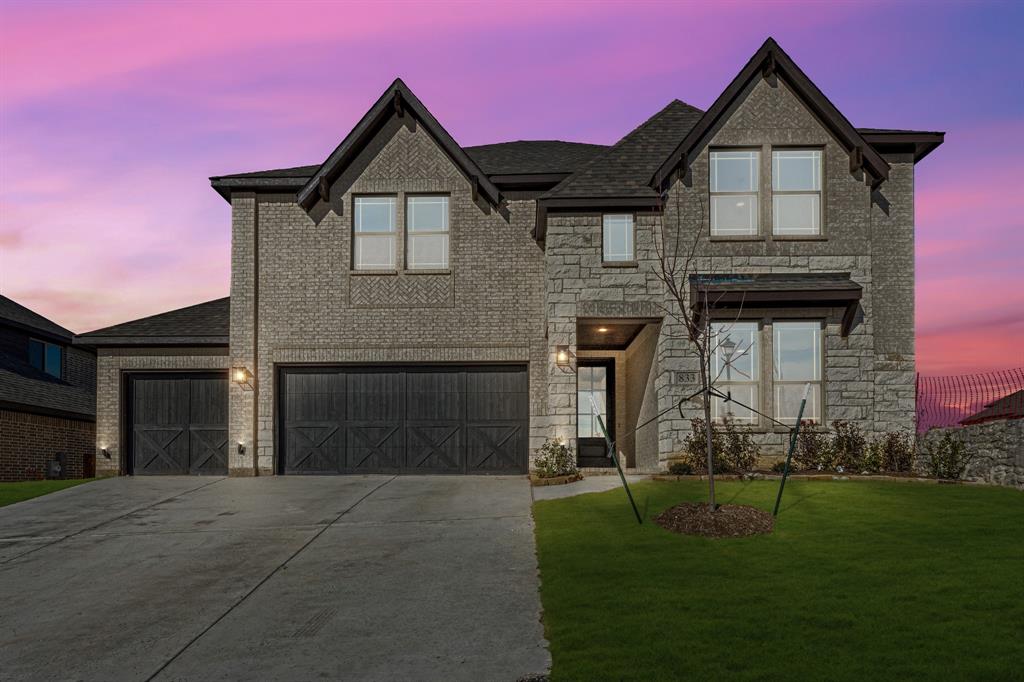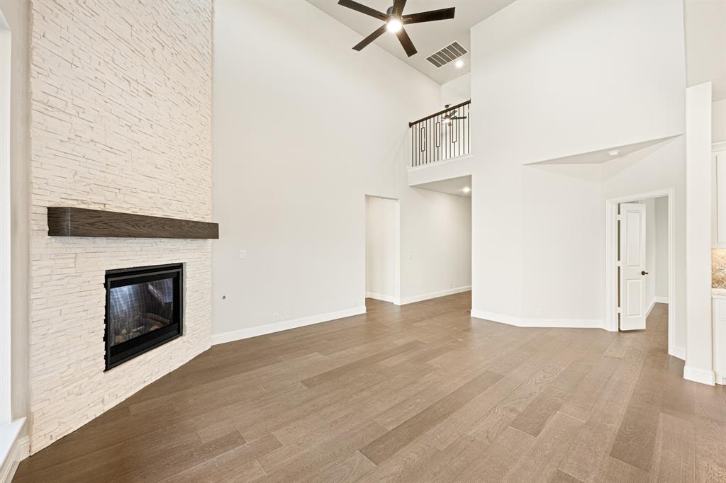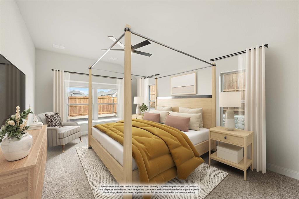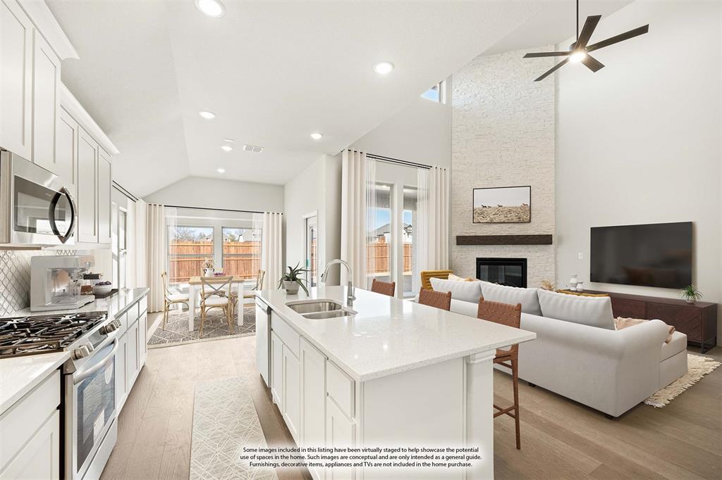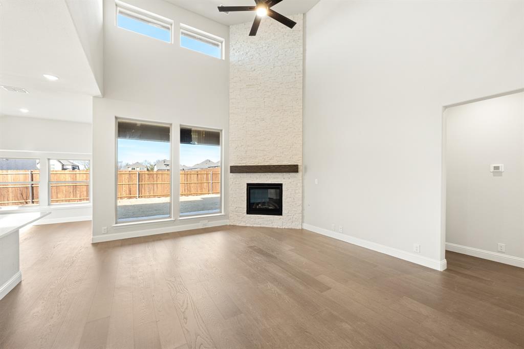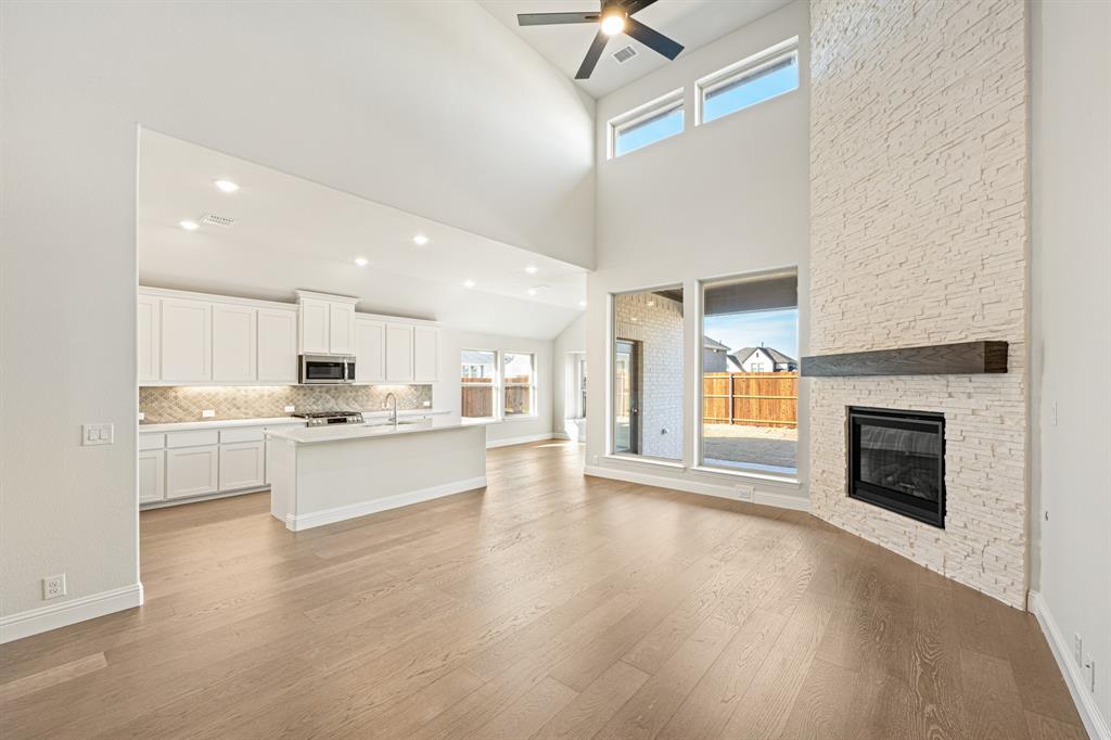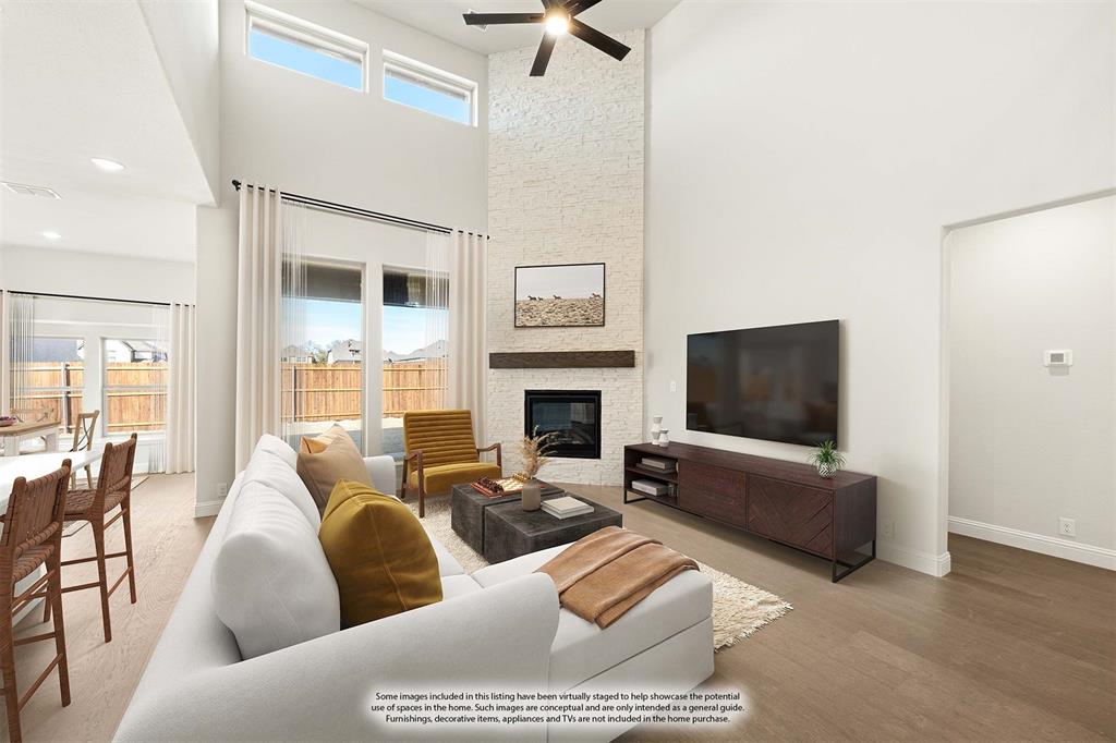 *Contact Community Manager for incentives!* NEW! NEVER LIVED IN. The Rose II by Bloomfield Homes blends open living and private retreats across 5 bedrooms and 4 baths, with a flexible first-floor study that adapts to your lifestyle. From the curb, a white stone-and-brick exterior, 8-foot front door, and 3-car garage create a bold welcome. Inside, upgraded wood floors flow through the main living areas, leading to a Family Room with ceilings soaring over 17 feet and a full-height stone fireplace that draws the eye upward. The kitchen is designed for both daily function and entertaining, with a massive island, quartz countertops, white Shaker cabinetry, built-in stainless steel appliances, and a walk-in pantry. The adjacent breakfast area looks out to the covered patio and fenced backyard, creating an easy indoor-outdoor connection. The first-floor primary suite offers space for a sitting area and features a bath with a garden tub, separate shower, dual sinks, and a generous walk-in closet. A secondary bedroom with a nearby full bath on the main level is ideal for guests. Upstairs, the game room opens to the family room below, while the media room is tucked away for movie nights. 3 more bedrooms—one connected by a Jack and Jill bath—each have direct bath access. Additional features include a mudroom off the garage, a gorgeous exposed staircase wrapped by a modern rail design, and a tankless water heater. Full landscaping with irrigation and exterior lighting ensures the home is as polished at night as it is by day. Located in a vibrant community with parks, trails, and gathering spaces, the Rose II offers room to live, gather, and unwind in style. Stop by to tour any day - Bloomfield's model in the community is open daily, ready to help!
