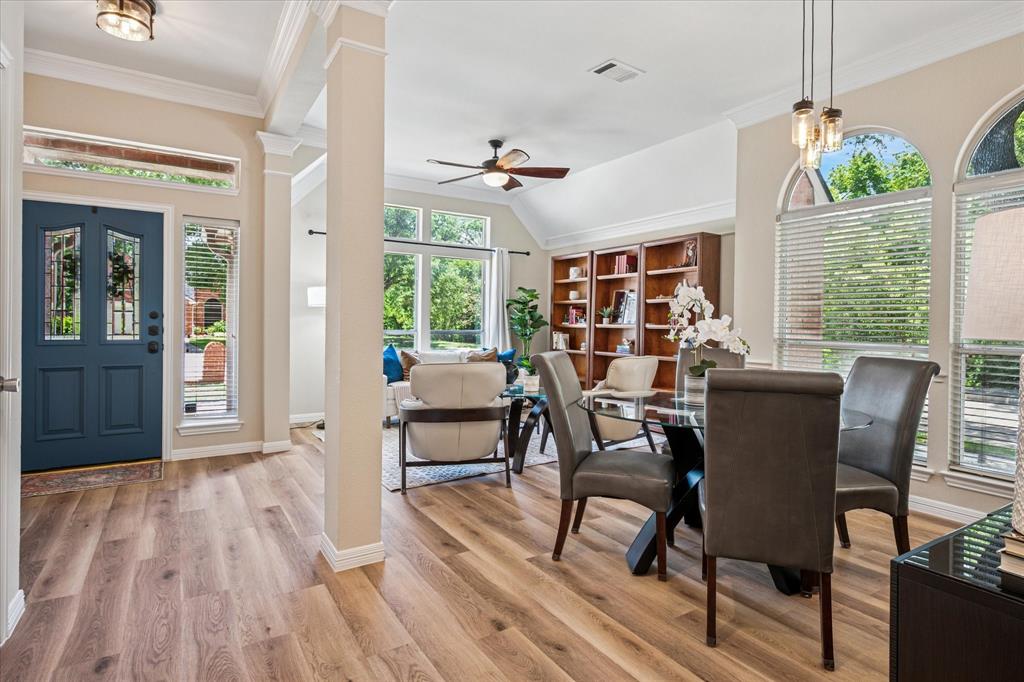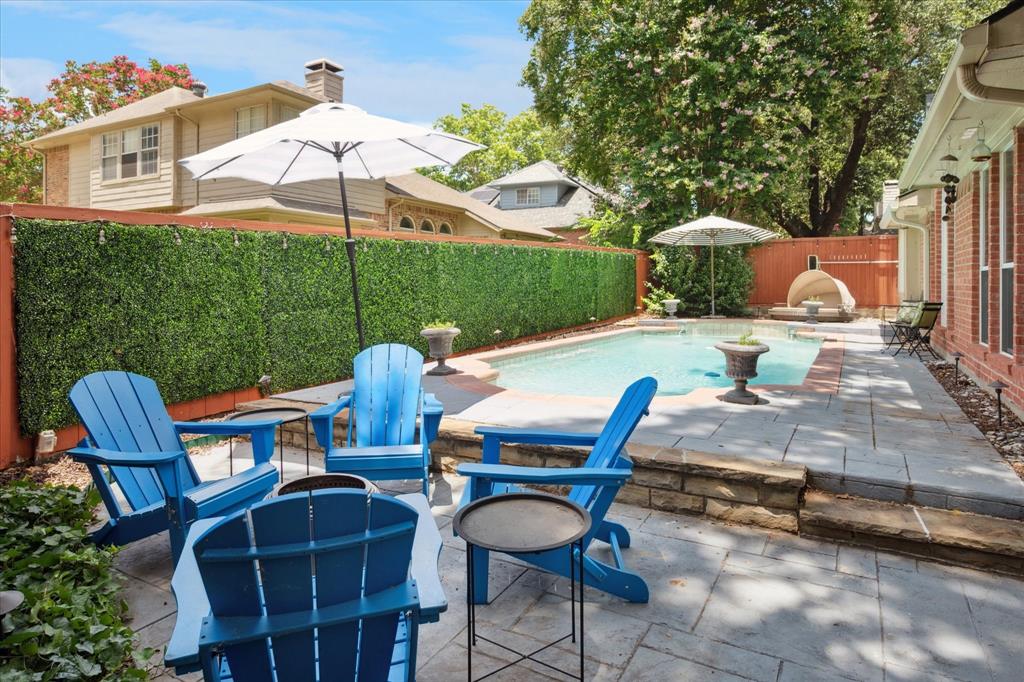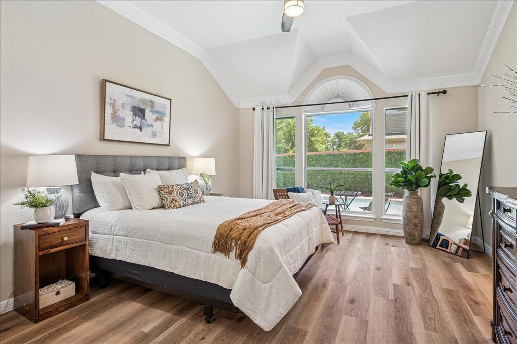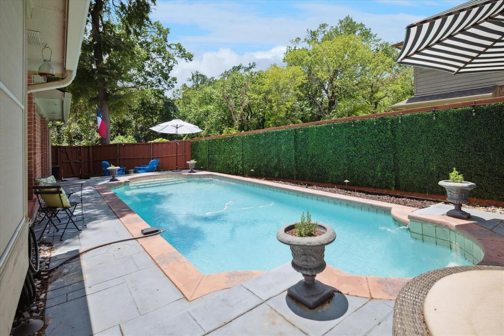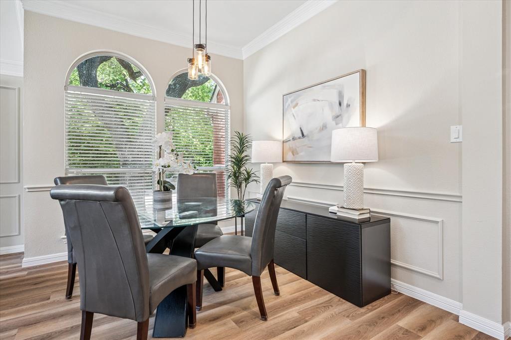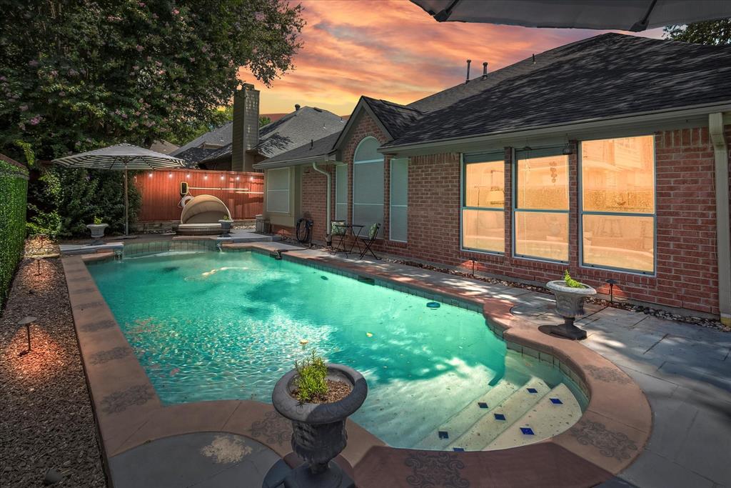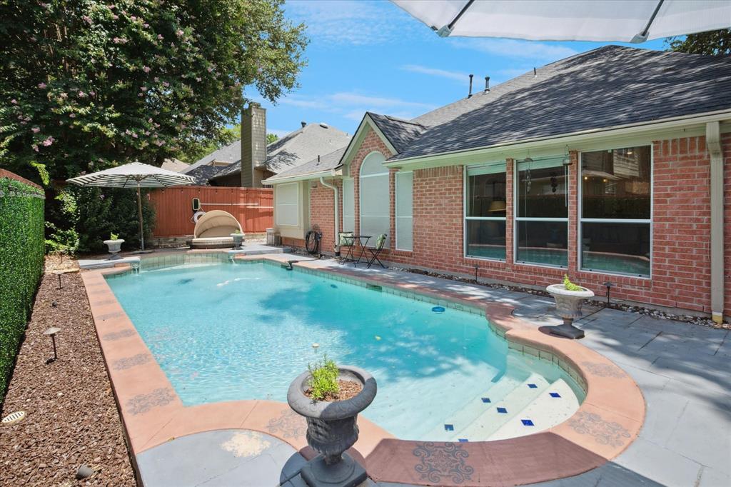 Elegantly beautiful home positioned on a corner lot within Park Hallow of Plano. From entry and throughout you'll immerse yourself in an atmosphere of sophisticated relaxation of a floorplan that flows seamlessly to each area boasting a professionally painted modern color pallet. Take note of the designer lighting, high-end ceiling fans, and abundant windows allowing natural rays of sun to bath over each room. Warm wood-like flooring through main living areas with tile in wet areas. The front formal living and dining areas are accented with millwork, crown molding, and a great mix of clean lines and arched entries. The main Family Living area with lovely gas-log fireplace flanked by a large window and direct access to the low maintenance backyard that was designed for the entertainer and daily relaxer! From a sparkling pool with water feature and tanning ledge to multiple gather areas and even a small grass area to the side for the four-legged friends! The heart of the home is said to be the kitchen, and you will love this eat-in island kitchen with rounded breakfast bar, SS appliances, and large banquette, ample storage and counter space, and cast-iron sink. Enjoy the well sized Primary suite with dual sinks, separate shower, and large walk-in closet. Both secondary bedrooms are sizable and share a full secondary bath. Since purchased, the homeowner invested another 25K and installed the lovely LVT flooring, had the popcorn removed from the ceilings and had the interior painted.