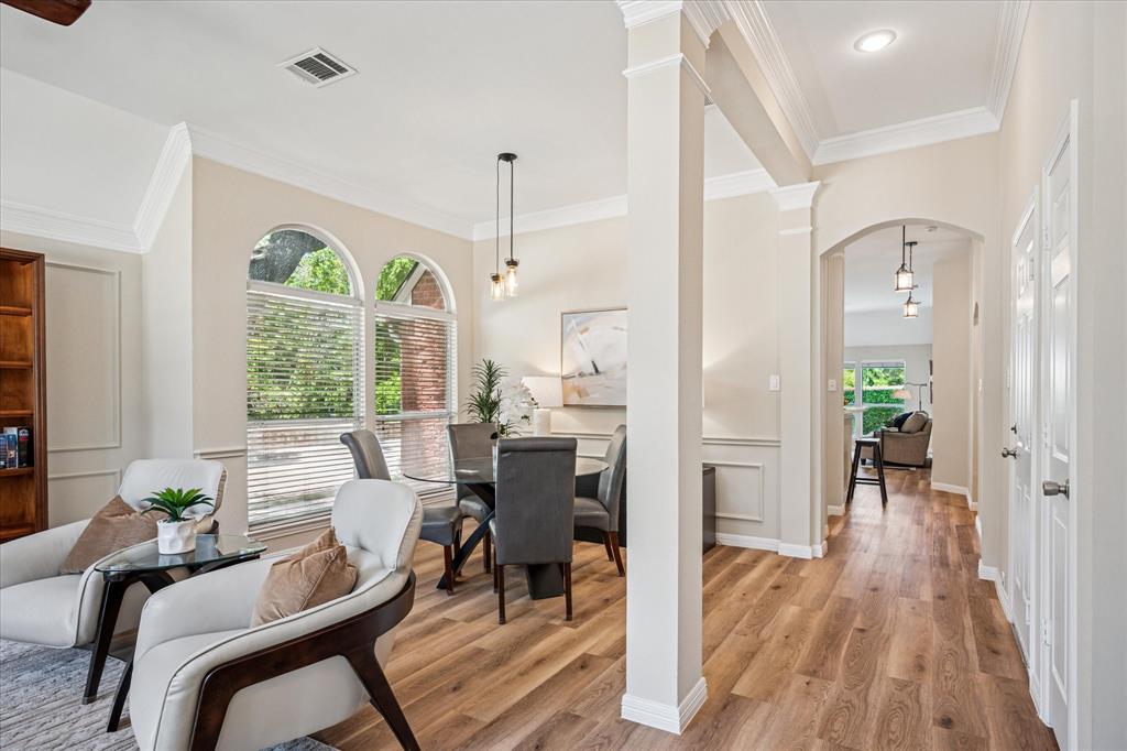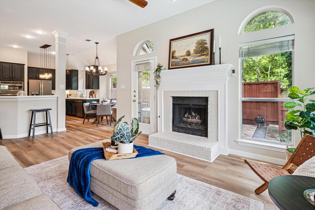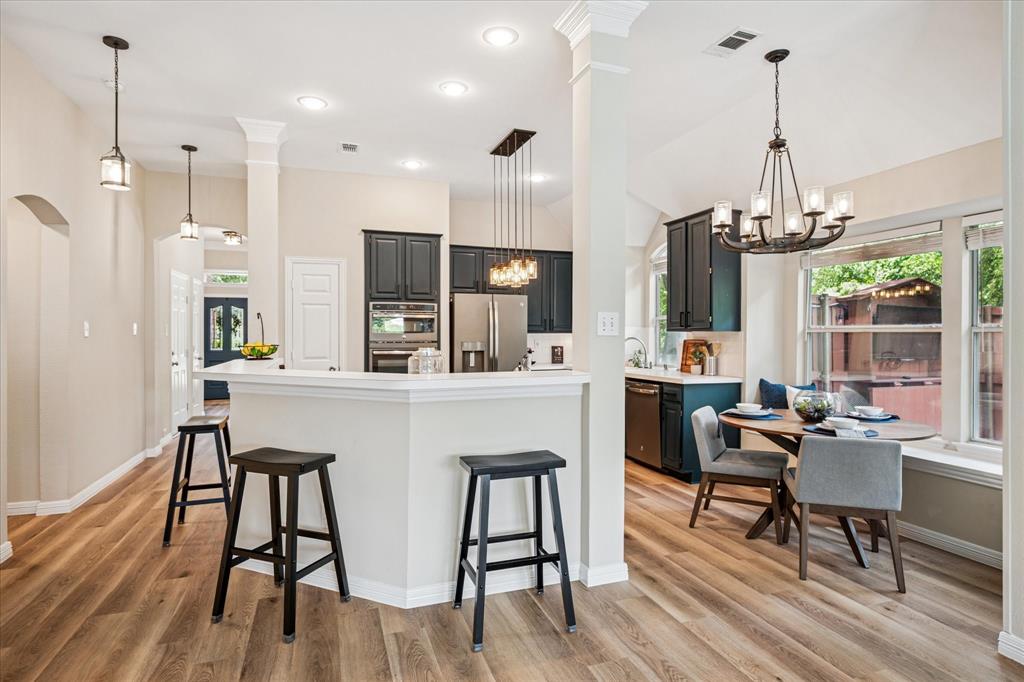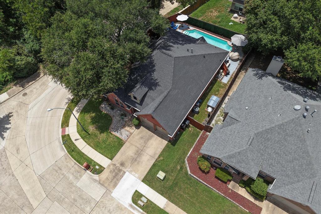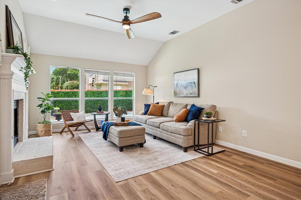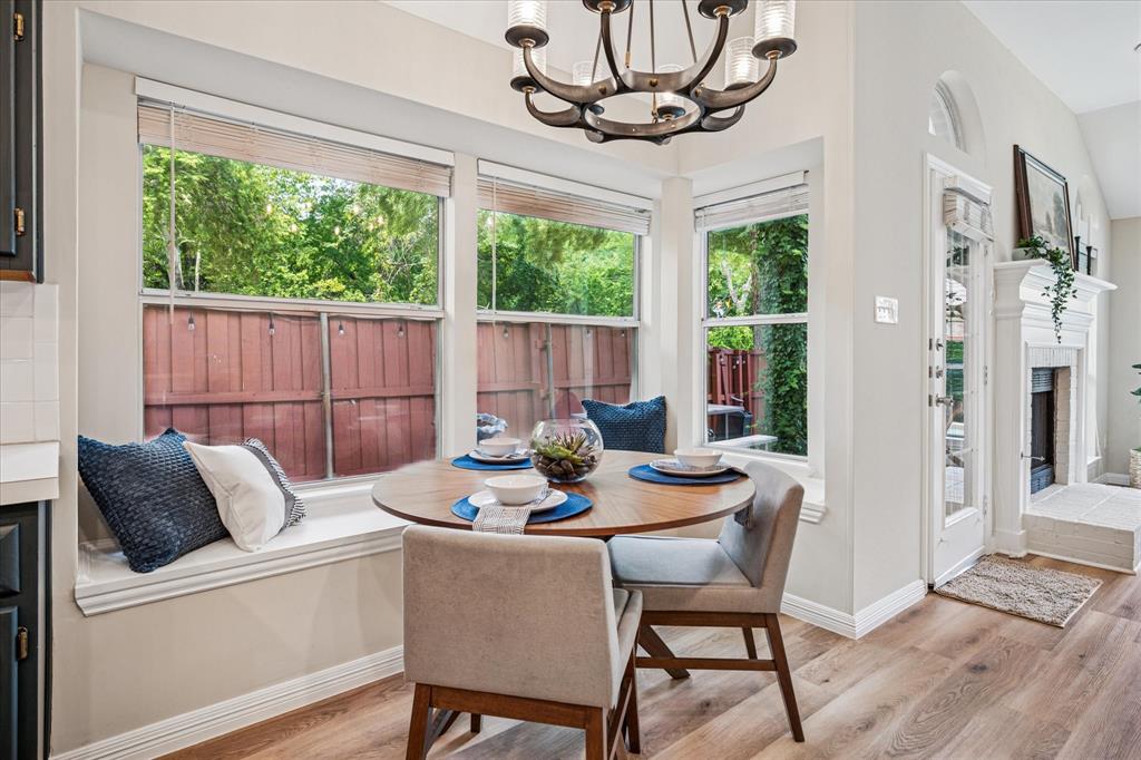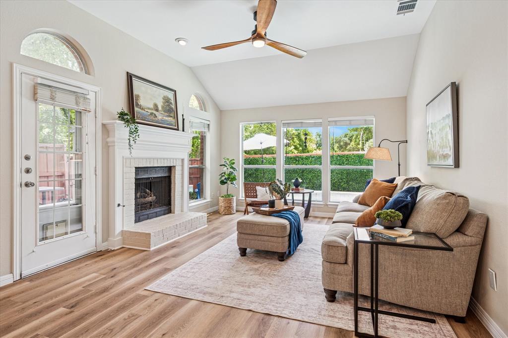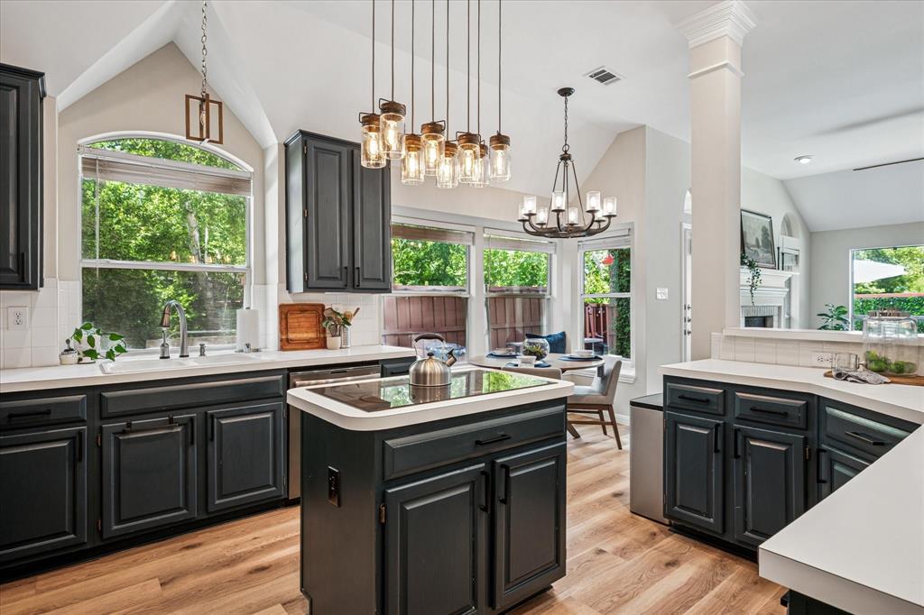 Elegantly beautiful home positioned on a corner lot within Park Hallow of Plano. From entry and throughout you'll immerse yourself in an atmosphere of sophisticated relaxation of a floorplan that flows seamlessly to each area boasting a professionally painted modern color pallet. Take note of the designer lighting, high-end ceiling fans, and abundant windows allowing natural rays of sun to bath over each room. Warm wood-like flooring through main living areas with tile in wet areas. The front formal living and dining areas are accented with millwork, crown molding, and a great mix of clean lines and arched entries. The main Family Living area with lovely gas-log fireplace flanked by a large window and direct access to the low maintenance backyard that was designed for the entertainer and daily relaxer! From a sparkling pool with water feature and tanning ledge to multiple gather areas and even a small grass area to the side for the four-legged friends! The heart of the home is said to be the kitchen, and you will love this eat-in island kitchen with rounded breakfast bar, SS appliances, and large banquette, ample storage and counter space, and cast-iron sink. Enjoy the well sized Primary suite with dual sinks, separate shower, and large walk-in closet. Both secondary bedrooms are sizable and share a full secondary bath. Since purchased, the homeowner invested another 25K and installed the lovely LVT flooring, had the popcorn removed from the ceilings and had the interior painted.