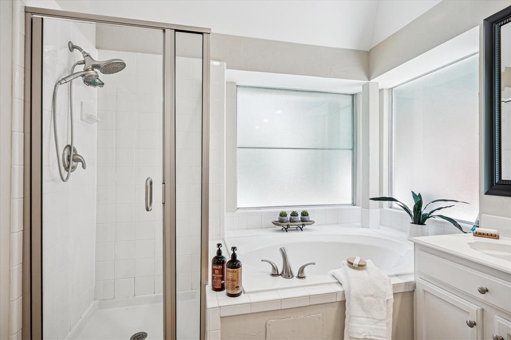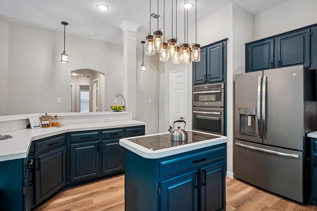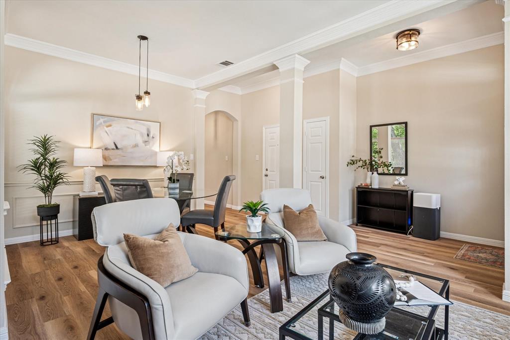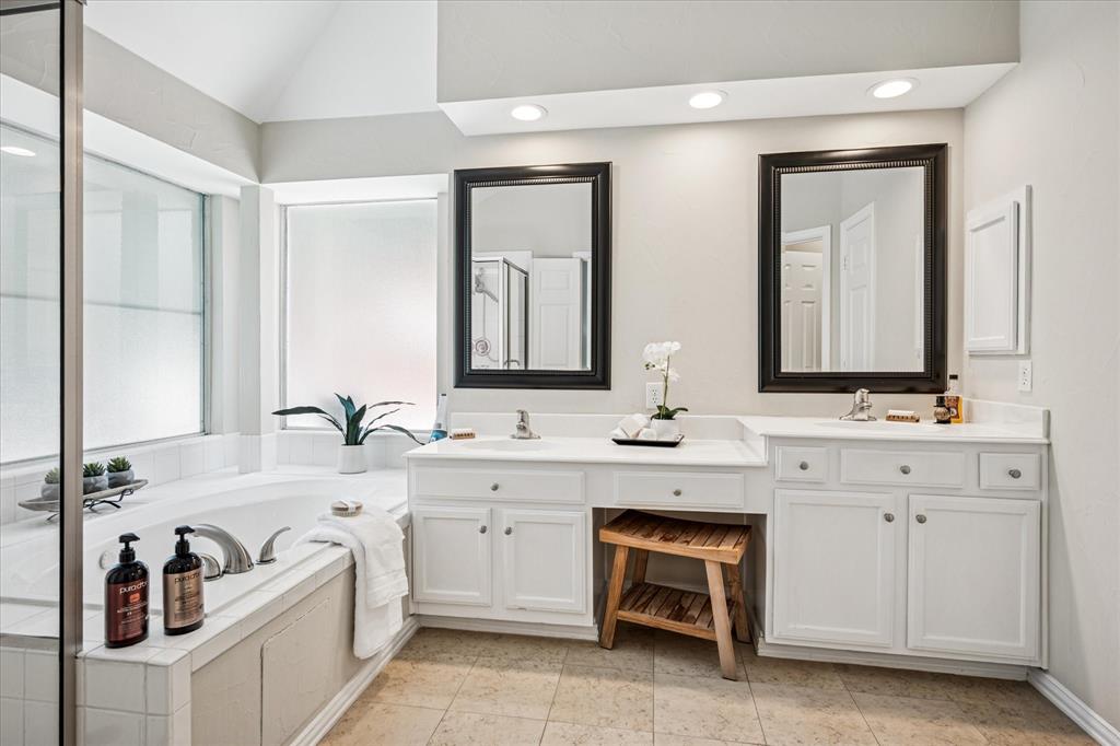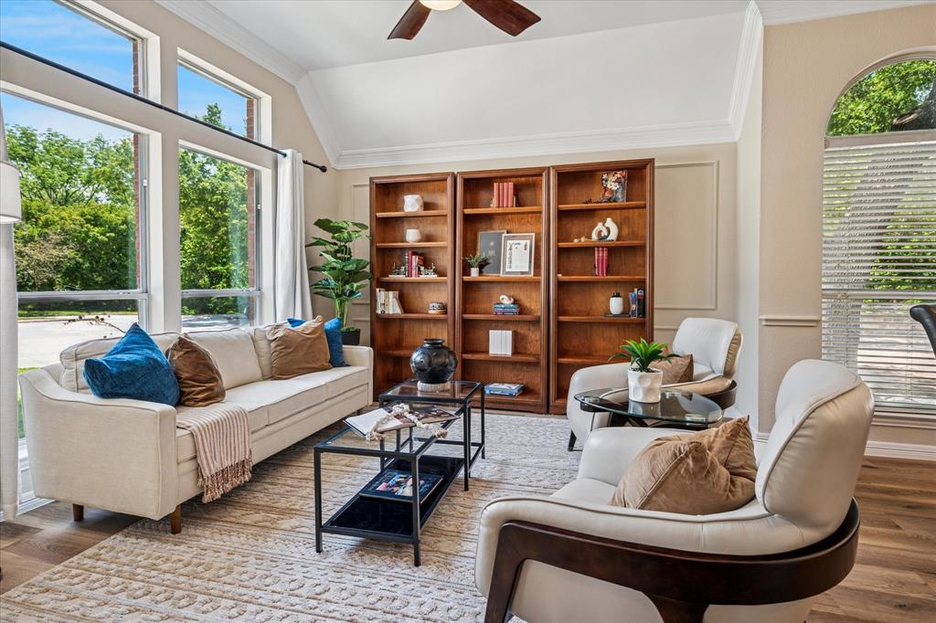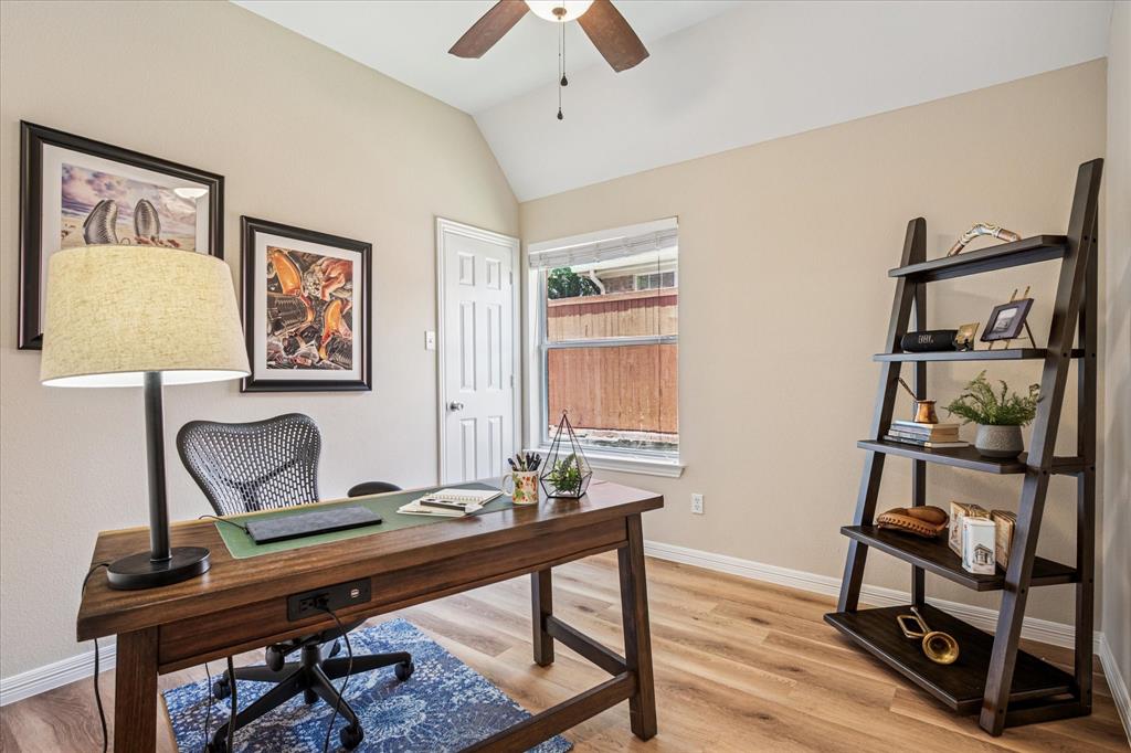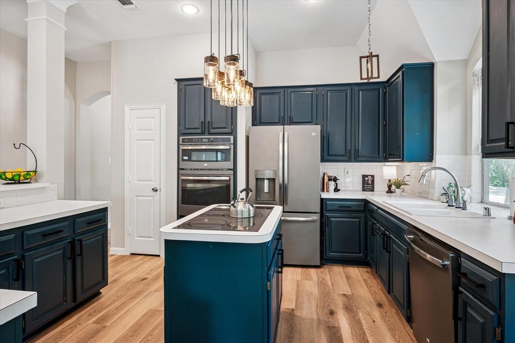 Elegantly beautiful home positioned on a corner lot within Park Hallow of Plano. From entry and throughout you'll immerse yourself in an atmosphere of sophisticated relaxation of a floorplan that flows seamlessly to each area boasting a professionally painted modern color pallet. Take note of the designer lighting, high-end ceiling fans, and abundant windows allowing natural rays of sun to bath over each room. Warm wood-like flooring through main living areas with tile in wet areas. The front formal living and dining areas are accented with millwork, crown molding, and a great mix of clean lines and arched entries. The main Family Living area with lovely gas-log fireplace flanked by a large window and direct access to the low maintenance backyard that was designed for the entertainer and daily relaxer! From a sparkling pool with water feature and tanning ledge to multiple gather areas and even a small grass area to the side for the four-legged friends! The heart of the home is said to be the kitchen, and you will love this eat-in island kitchen with rounded breakfast bar, SS appliances, and large banquette, ample storage and counter space, and cast-iron sink. Enjoy the well sized Primary suite with dual sinks, separate shower, and large walk-in closet. Both secondary bedrooms are sizable and share a full secondary bath. Since purchased, the homeowner invested another 25K and installed the lovely LVT flooring, had the popcorn removed from the ceilings and had the interior painted.