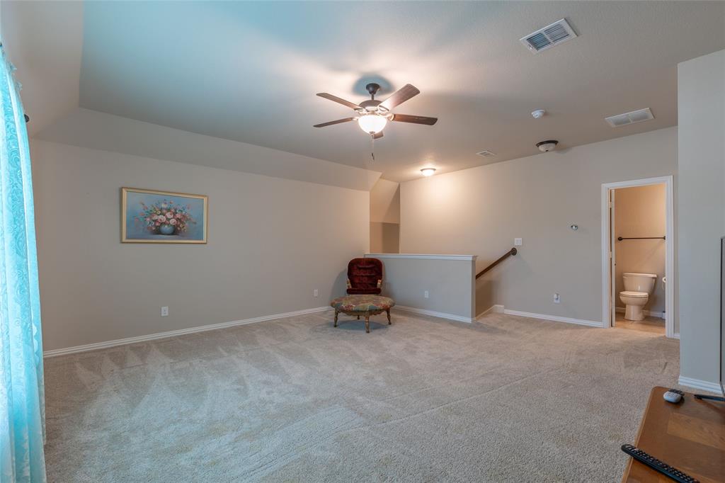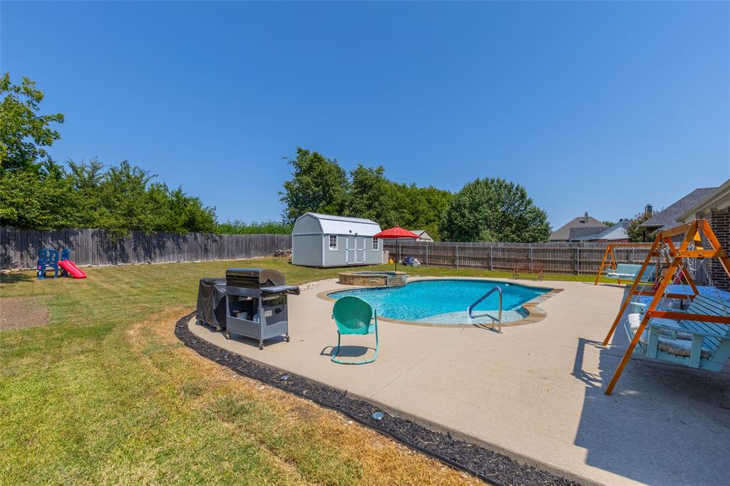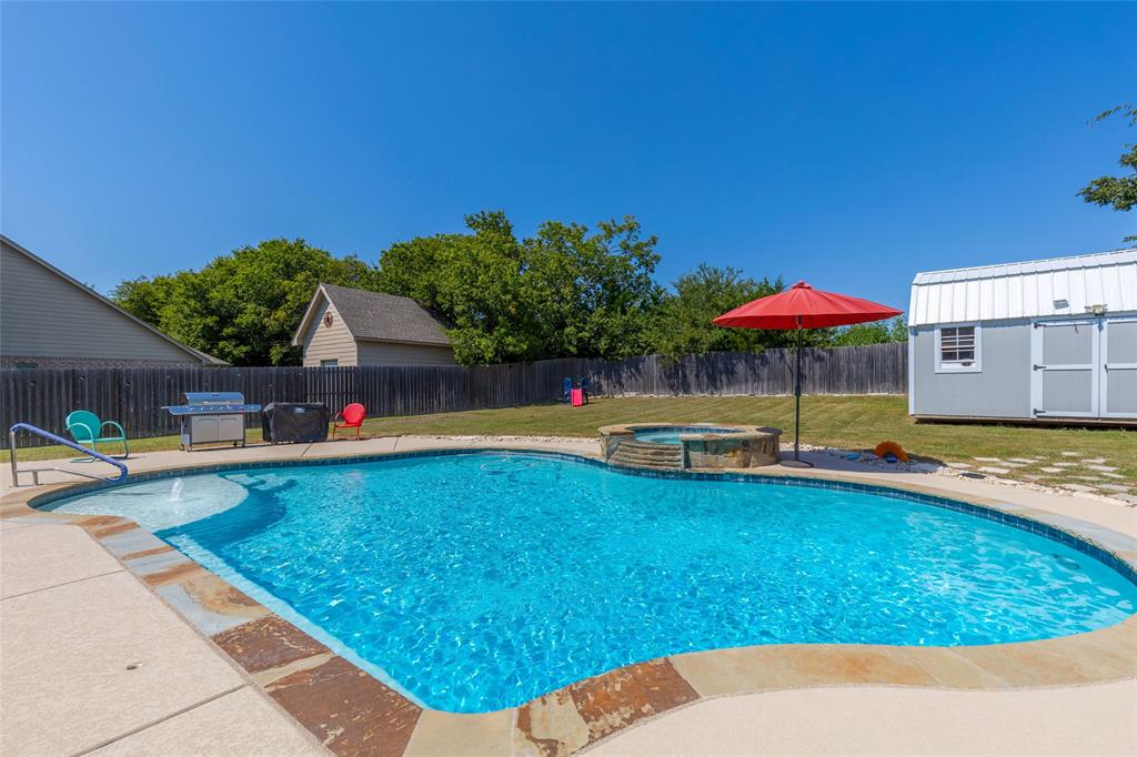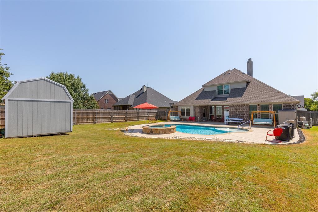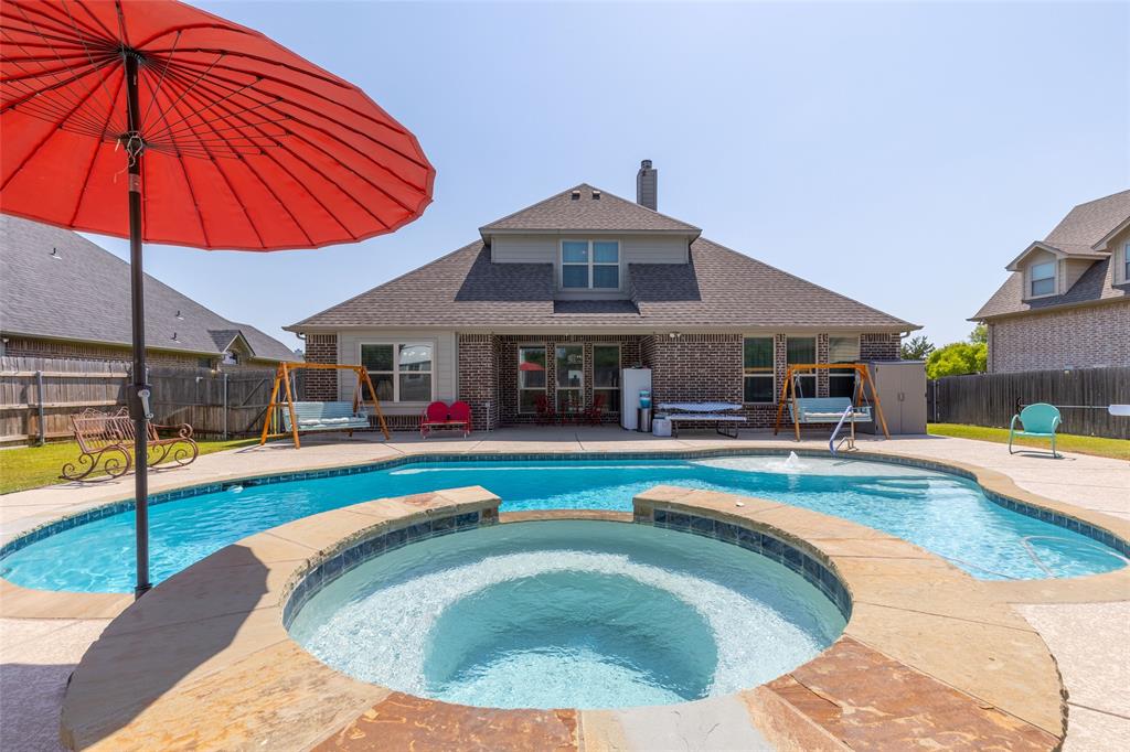 The upstairs entertainment center is perfect for movie nights, game days, or a playroom. Outdoors, enjoy your own private oasis featuring a sparkling swimming pool with a relaxing hot tub, surrounded by a large backyard—plenty of room for BBQs, outdoor games, or simply soaking up the Texas sunshine. This home is also equipped with a storm shelter in the garage, great for keeping your family safe or for storing personal belongings.