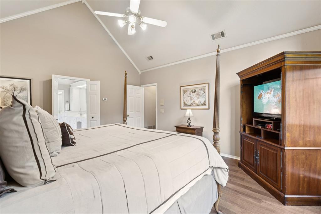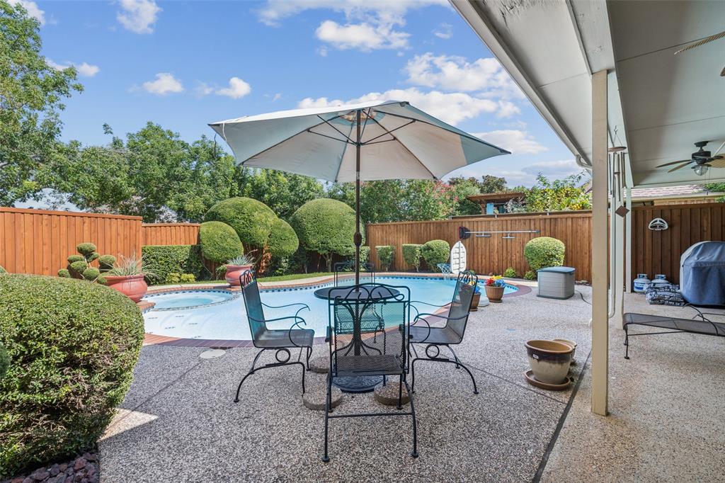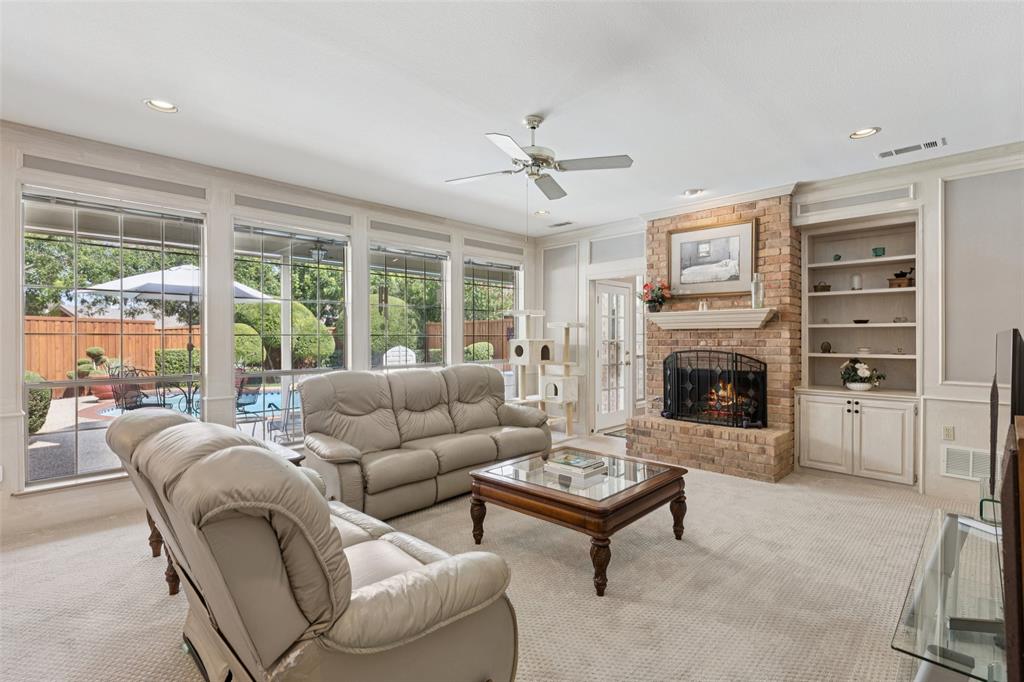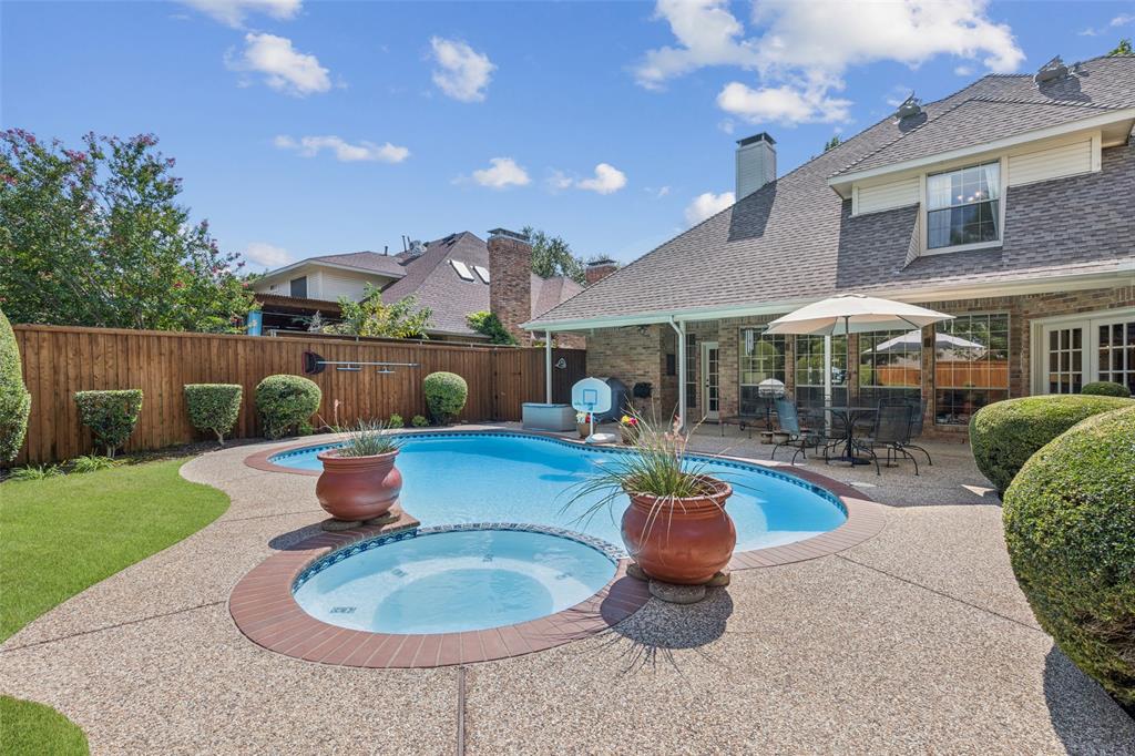 Welcome to this breathtaking 4 bedroom, 3 bath custom home in the highly sought-after Carriage Hills community! With 3,285 sqft of beautifully designed living space, this meticulously maintained home is ready for you to make your own. You’re warmly welcomed the moment you enter the grand foyer, flanked by elegant split formals—a dining room with gleaming hardwood floors and a living room with soaring ceilings and a cozy fireplace. At the heart of the home, the inviting family room features a stately gas log fireplace, custom built-ins, and a wall of windows offering stunning views of your private backyard oasis. The large eat-in kitchen is a chef’s delight with a breakfast bar, built-in appliances, ample storage and prep space, and a bright breakfast nook. The first-floor primary suite boasts a vaulted ceiling, ensuite bath with dual sinks, a soaking tub, separate shower, and a walk-in closet. A guest bedroom and full bath are also conveniently located downstairs. Upstairs, you’ll find two spacious bedrooms with a Jack-and-Jill bath, plus a large additional family room and a huge game or media room above the garage—perfect for a home theater, gym, or play space. Enjoy your own retreat featuring a covered patio, sparkling pool, relaxing spa, and lush landscaping—ideal for entertaining or unwinding in style. Don’t miss your chance to live in one of Plano’s most desirable neighborhoods. 3D tour available online!