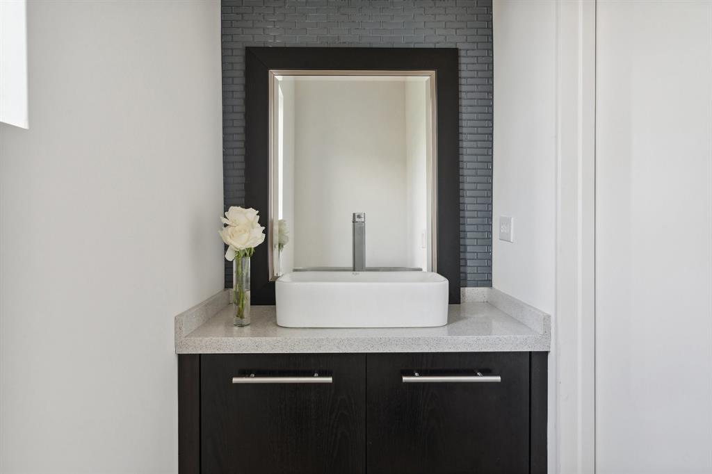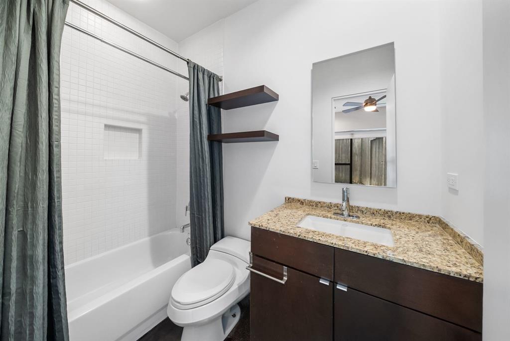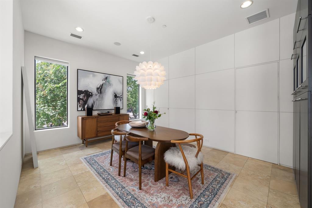 The first level features a spacious bedroom with en-suite bath, a two-car garage with bonus storage, and a private turfed backyard framed by a stunning crepe myrtle. The second floor offers an open-concept layout ideal for entertaining, with a sleek kitchen including a gas range, stainless steel appliances, ample storage, a walk-in pantry, and an eat-in island—all flowing seamlessly into the living room with a gas fireplace and the dining area framed by a wall of western-facing windows. Hidden and tucked-away spaces throughout the home provide unique character and thoughtful design.