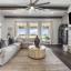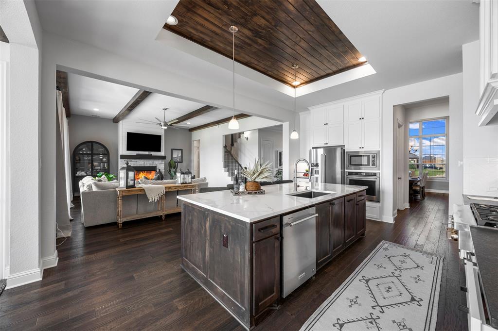 Step into the inviting foyer with rich wood flooring and be greeted by soaring vaulted ceilings. The expansive dining room boasts a full wall of custom cabinetry, perfect for entertaining and storage. The open-concept living area features a cozy gas fireplace, abundant natural light, and seamless flow into the chef’s kitchen, complete with stainless steel appliances, an eat-in area, and elegant finishes. The front windows feature ceramic tint for added comfort and energy efficiency.