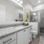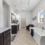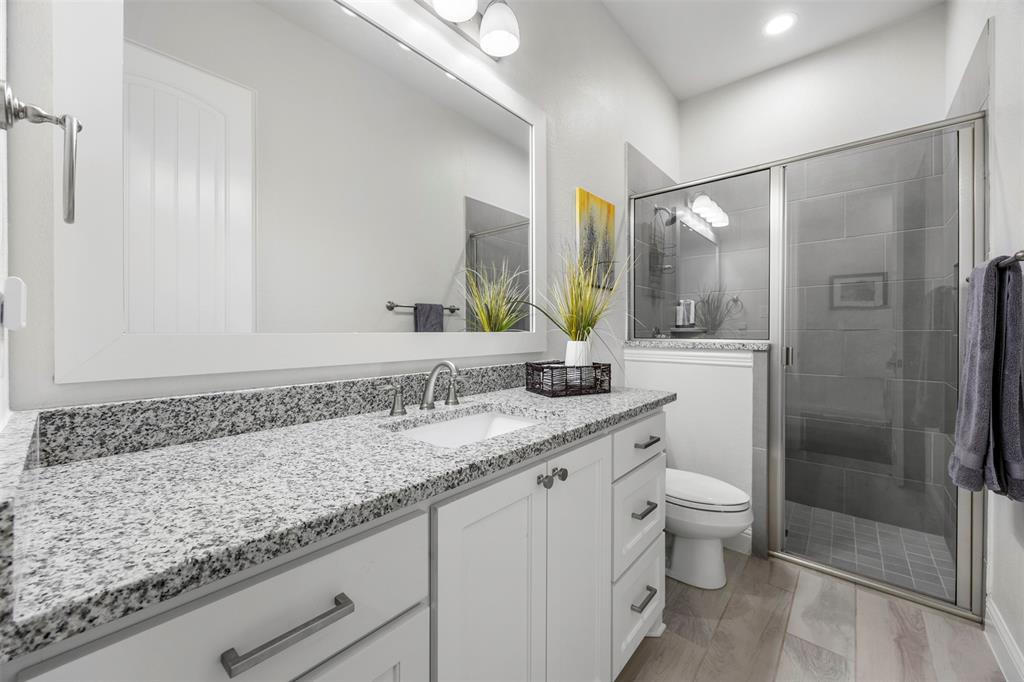 The main primary suite is a private retreat with vaulted ceilings and a spa-inspired ensuite featuring separate vanities, a soaking tub, and a large walk-in shower. A second bedroom also functions as a primary suite with its own ensuite bath — ideal for guests or multi-generational living.