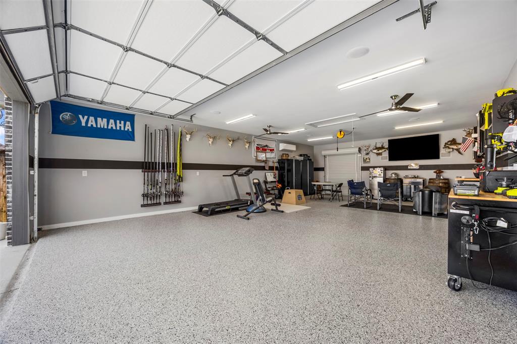 The attached 3-car garage offers epoxy floors and was designed to accommodate an oversized vehicle, while the 34x22 detached custom garage provides space for 4 additional vehicles and includes heat and AC, epoxy flooring, surround sound, insulation, attic access, and more. A built-in tornado shelter adds peace of mind in the attached garage.