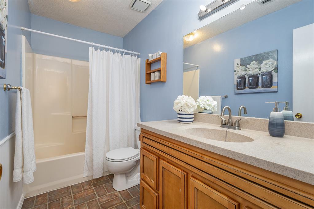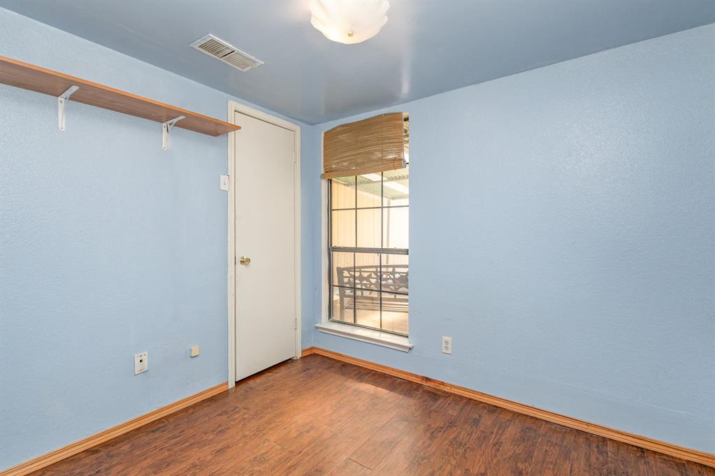 The private owner’s suite is a relaxing retreat, featuring wood floors, a high ceiling, and a bath with dual sinks and a spacious walk-in shower. Secondary bedrooms offer versatility for guests, hobbies, or a home office. The second bath, conveniently located, is bright and well-appointed.
