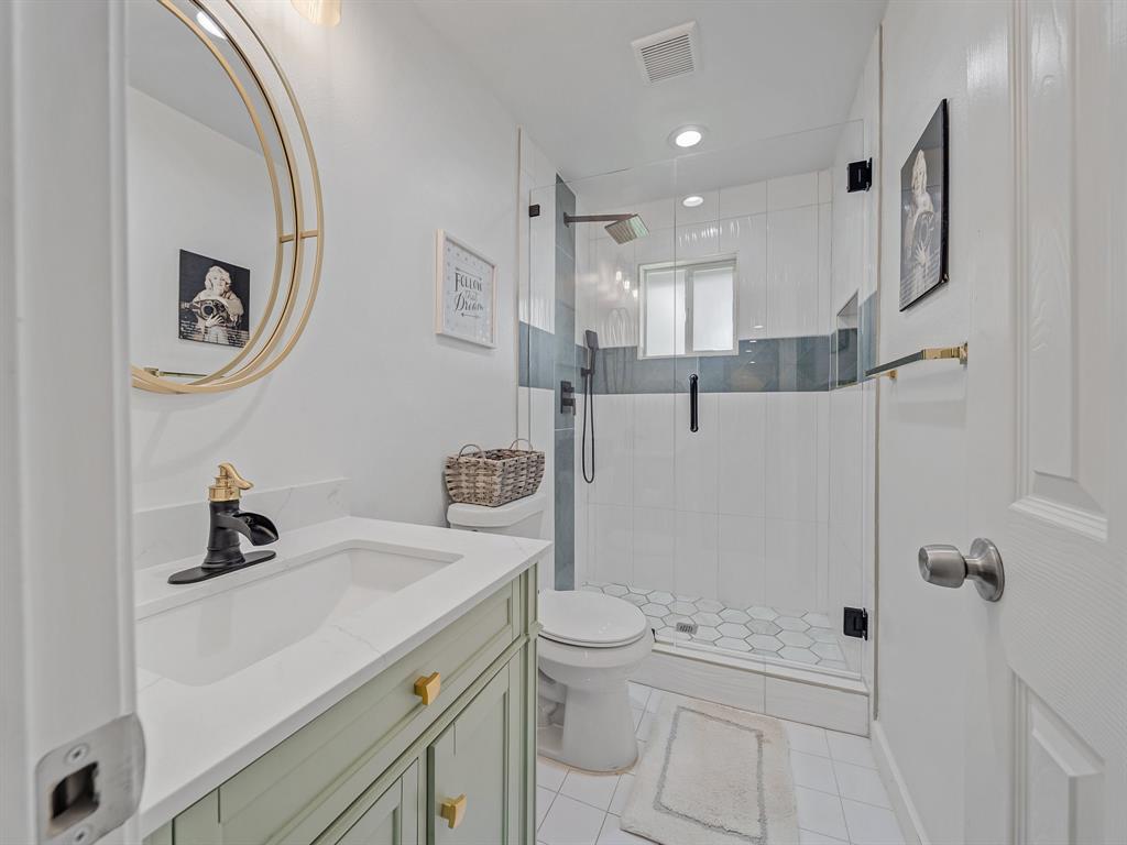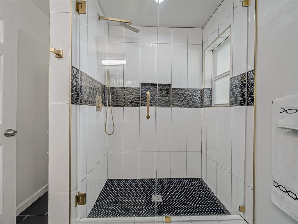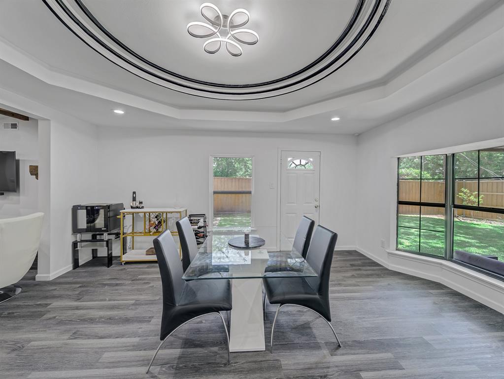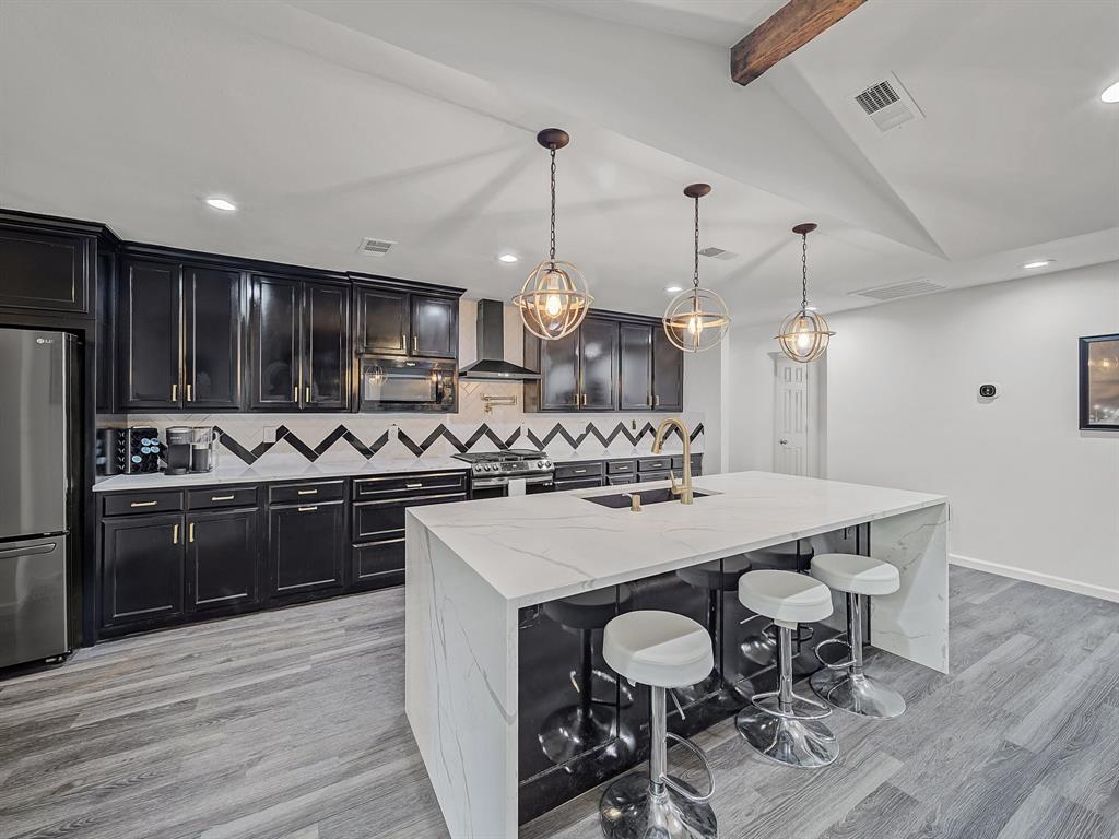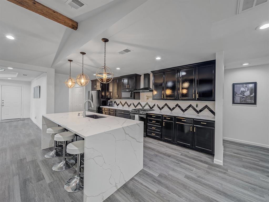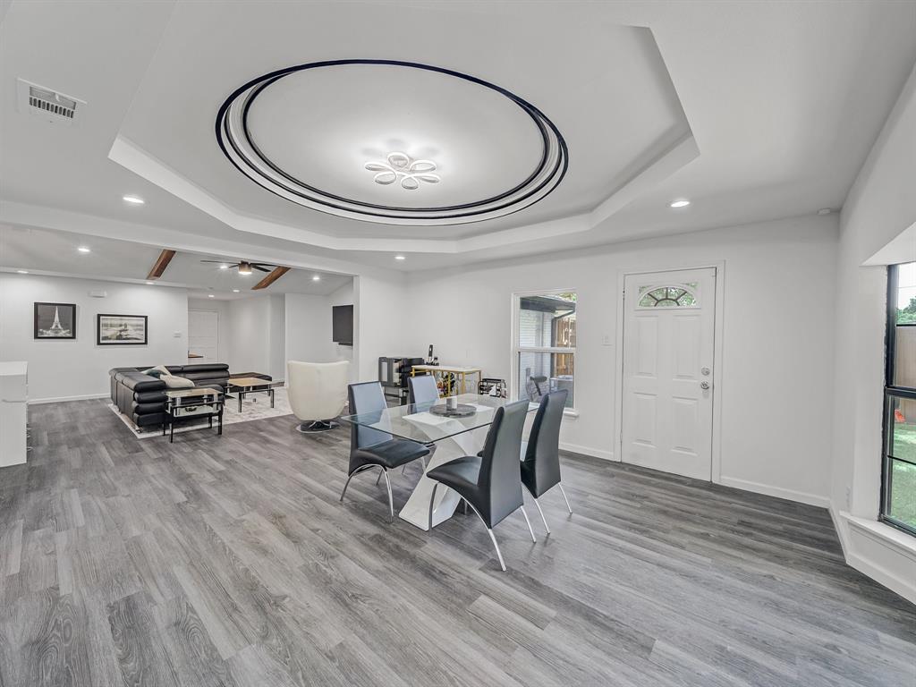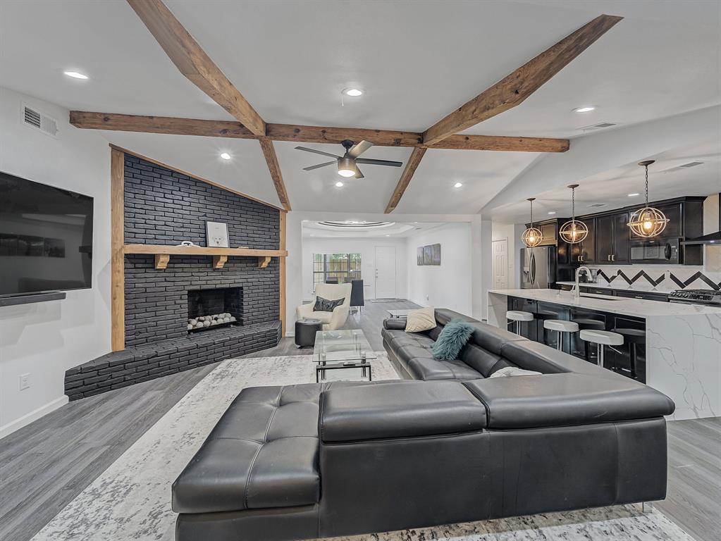 Immaculate and fully renovated, this one-story corner lot home in Buckner Terrace offers 4 spacious bedrooms, 3 beautifully updated full baths, and an attached 2-car garage. From the moment you walk in, the open-concept layout with vaulted ceilings and designer-selected finishes welcomes you in. The chef’s kitchen is a true showstopper, featuring an 8ft x 4ft double waterfall island with Calacatta Sponda Quartz countertops (MSI, 3cm), stainless steel appliances, modern lighting, ample cabinet space, and a stunning designer backsplash. It flows effortlessly into a large living area with an accented brick fireplace, wooden mantel, and wood ceiling beams, perfect for everyday living and entertaining. The flexible dining area opens to the backyard through two separate doors, enhancing indoor-outdoor living. Durable luxury vinyl plank flooring, crisp white walls, and plenty of natural light create a fresh and inviting atmosphere across every room. The primary bedroom offers a walk-in closet and a luxurious en-suite bath with dual vanity sinks, an oversized glass-enclosed shower, and a freestanding acrylic soaking tub surrounded by elegant marble and porcelain tilework. Two additional bedrooms share remodeled full bathrooms, while a fourth bedroom with several windows and a large closet works well as a bright and cheerful office space. Outside, enjoy a fully fenced backyard with a new 8ft privacy wood fence and a covered patio, all set on an almost quarter-acre lot. Upgrades include a 2 year HVAC and duct system, updated plumbing and internal drains, a recently replaced electrical panel and wiring, and full energy-efficiency certification from the city. With no HOA and just 12 minutes from Downtown Dallas, this move-in ready home blends style, function, and location in one beautifully updated package. Hurry! Transferable Home warranty for the buyers with Choice Home warranty through 11.04.2026!