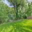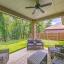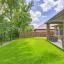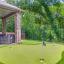 Enjoy the private outdoor retreat complete with a covered patio, upgraded artificial turf for low-maintenance living, and a custom 3-hole putting green—all set against a serene wooded backdrop with wrought iron fencing for unobstructed views.