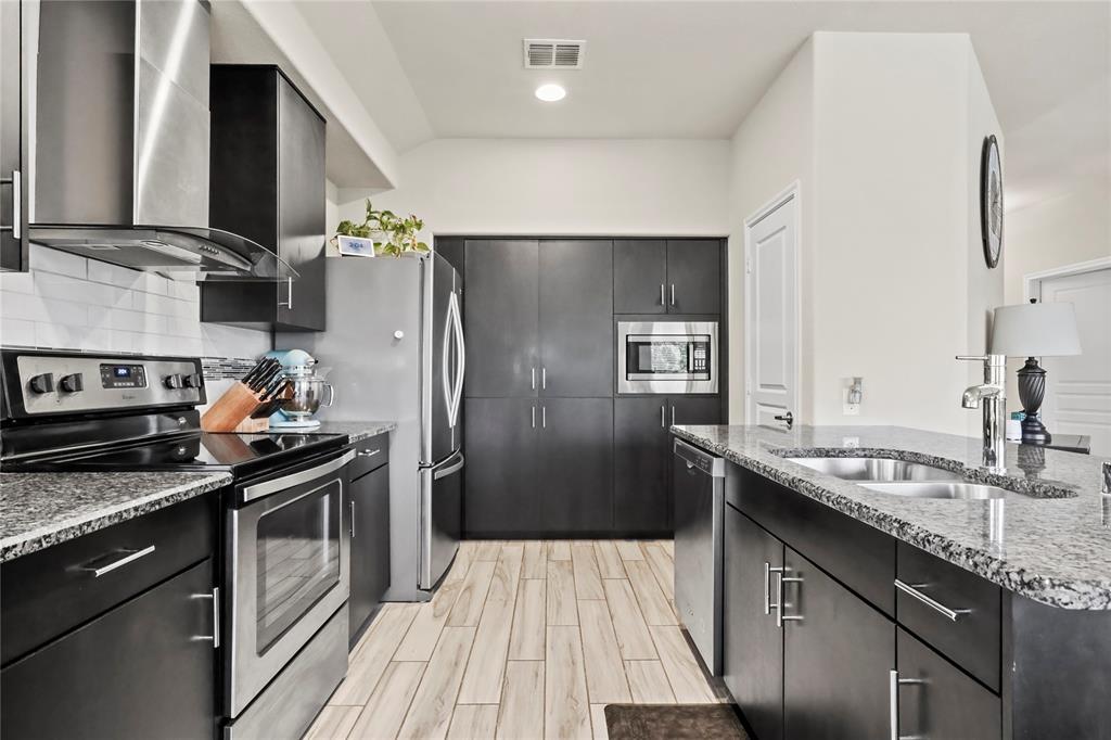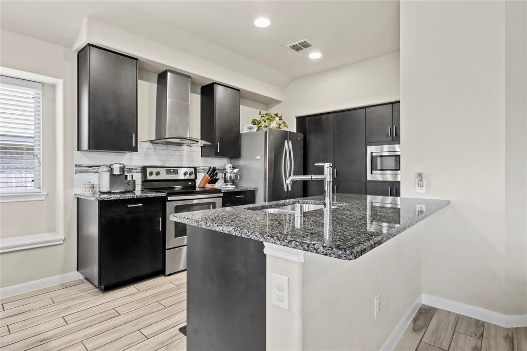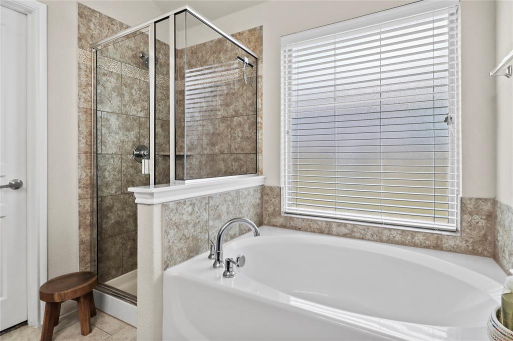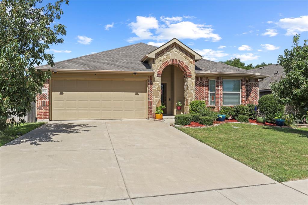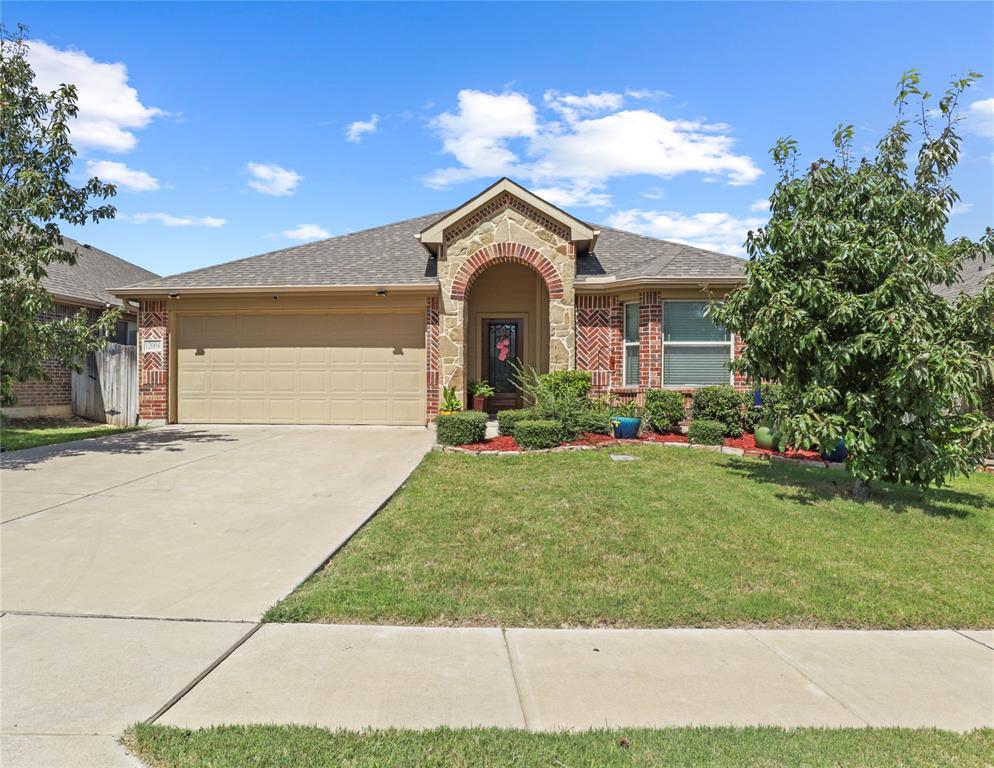 This exceptionally well-maintained home is filled with natural light and offers a spacious, inviting layout. The curb appeal is truly stunning, with a beautiful blend of stone and brick exterior and a professionally landscaped entrance that feels warm and welcoming. Inside, you'll find wood-look ceramic tile throughout the main living areas and a deluxe kitchen with custom cabinets, stainless steel appliances, granite countertops, and a stylish backsplash. The primary bathroom features dual sinks, a glass-enclosed shower, and a separate soaking tub with a decorative surround. Step out back to enjoy a generous yard and a covered patio, perfect for relaxing or entertaining. This home is move-in ready and a true standout.
