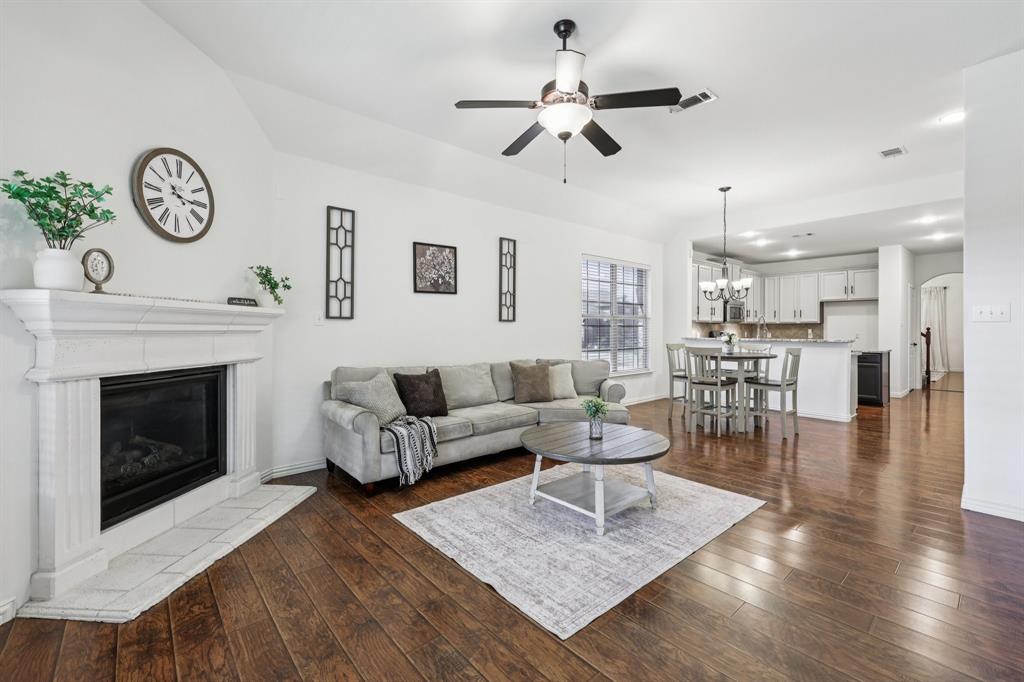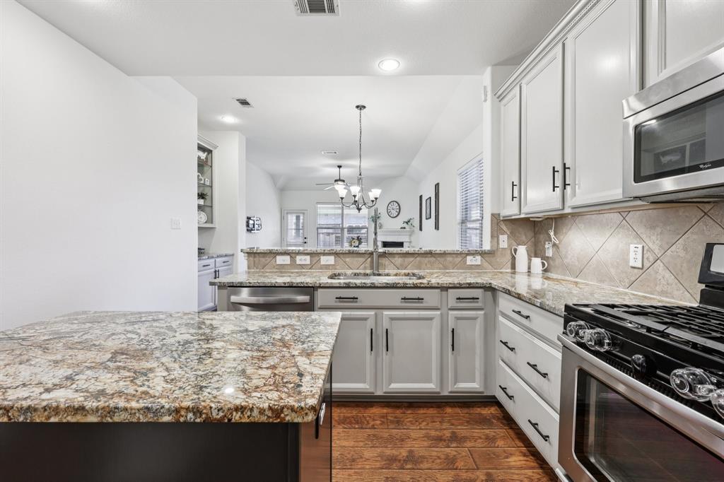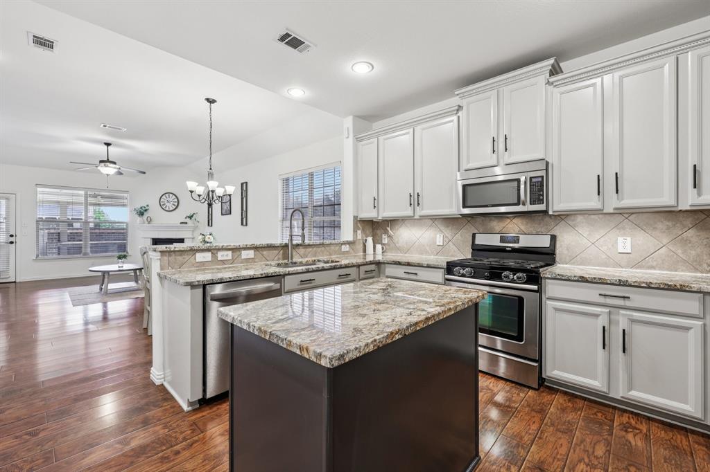 The gourmet kitchen features granite countertops, upgraded cabinetry, stainless steel appliances, a gas cooktop, center prep island with pot rack, built-in hutch, and breakfast bar—all open to the spacious living room with a cast-stone gas fireplace and wired surround sound. The generous primary suite boasts a sitting area, dual vanities, soaking tub, separate shower, and a large walk-in closet.