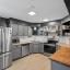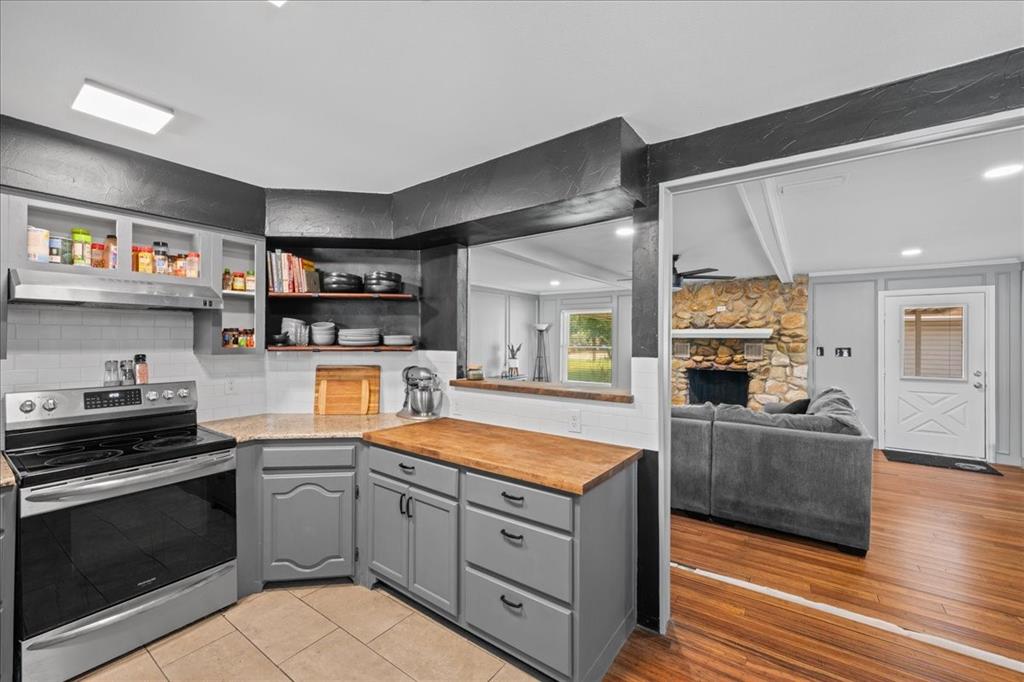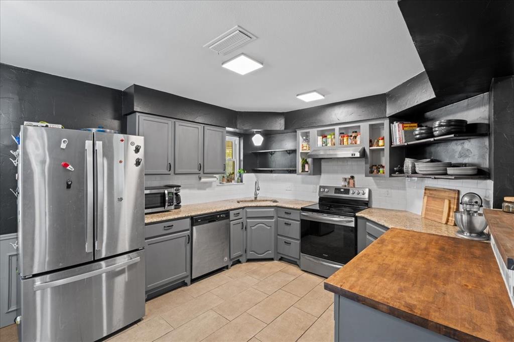 And the kitchen? Completely reimagined. Think granite countertops, subway tile backsplash, designer floating shelves, stainless steel appliances, opened up to the living room and refreshed cabinetry that gives this space a designer look without the designer price tag.