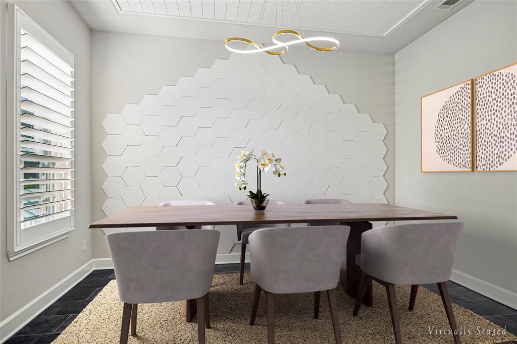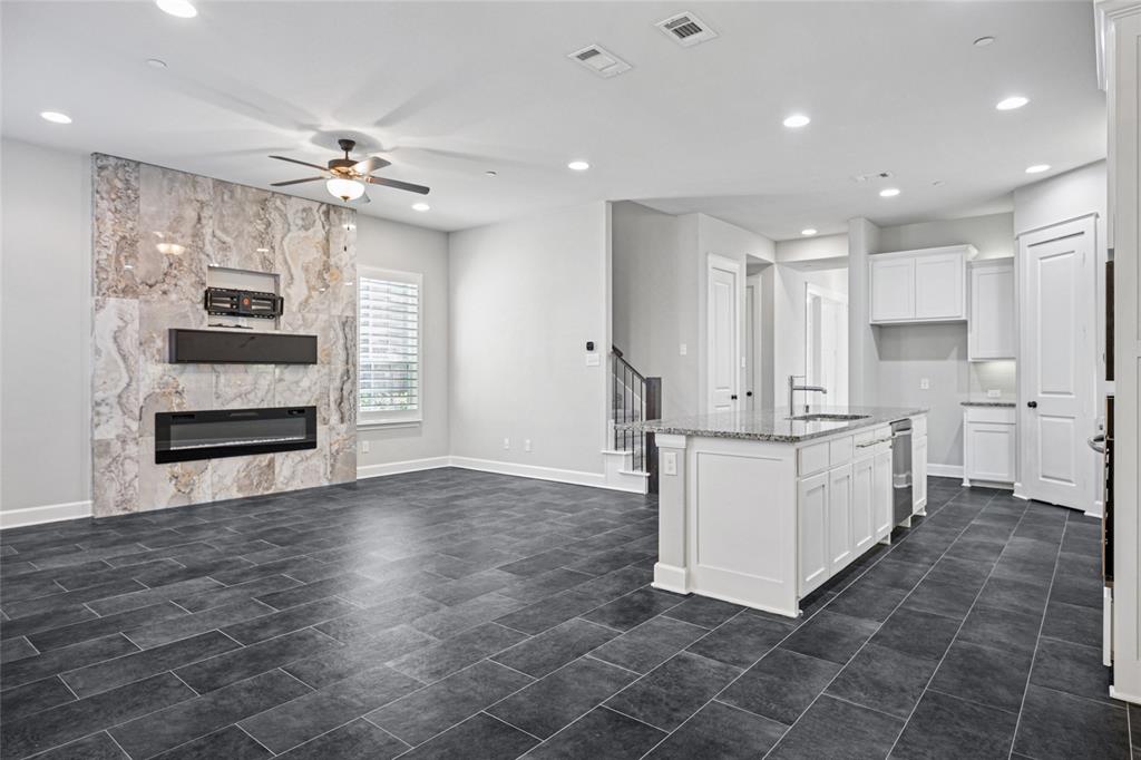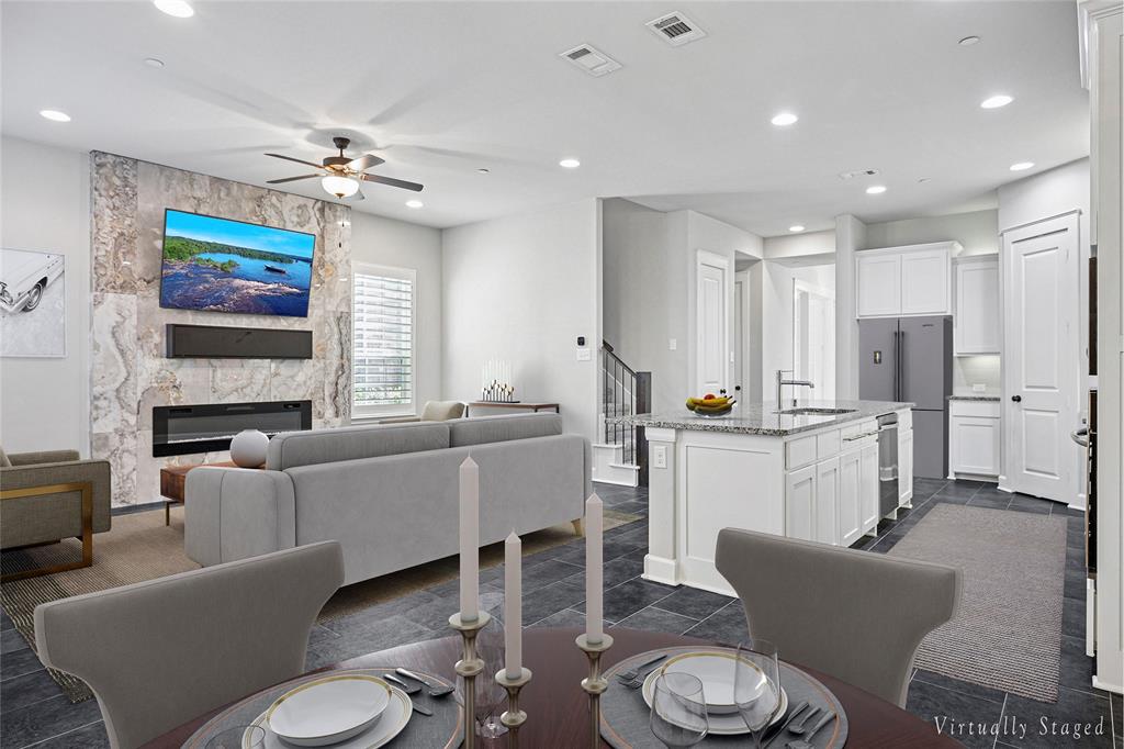 Beautifully appointed residence in Hometown Canal District that blends timeless finishes with modern convenience. A seamless layout designed for comfort and style, featuring quality materials and optimal use of space. Preferred corner location for additional natural light, plantation shutters throughout, recent designer tile on first floor, and new plush carpeting on second level. 2025 roof and 2022 dishwasher. Front-facing study and formal dining at entry lead to an open floorplan. The expansive living area has a striking floor-to-ceiling marble-effect wall with a linear fireplace. It opens to the kitchen with gas range and large center island. Next to the breakfast room is a flex space ideal for second workspace or craft area. Upstairs, there is a spacious primary suite and two additional bedrooms with walk-in closets. Great storage throughout. EV charger remains in the rear-facing two-car garage. HOA includes landscape, lawn & irrigation maintenance plus exterior building care. As a homeowner, your typical to-do list just eased! Choose this opportunity for a vibrant lifestyle location. Across the street is highly rated Walker Creek Elementary. Walk to Birdville HS and Nytex Sports Centre. Explore strolling paths with picturesque pond views & parks. Enjoy shopping, dining, and everyday essentials, only minutes from your doorstep. 8765 Bridge Street checks all the boxes, including proximity to DFW Airport & easy access commuter routes. Welcome Home!