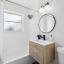 Both bathrooms impress with contemporary tile, wall-mounted vanities with storage, and modern fixtures that add a touch of spa-like comfort.