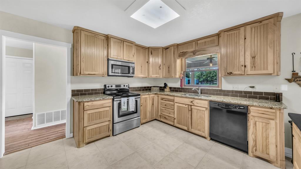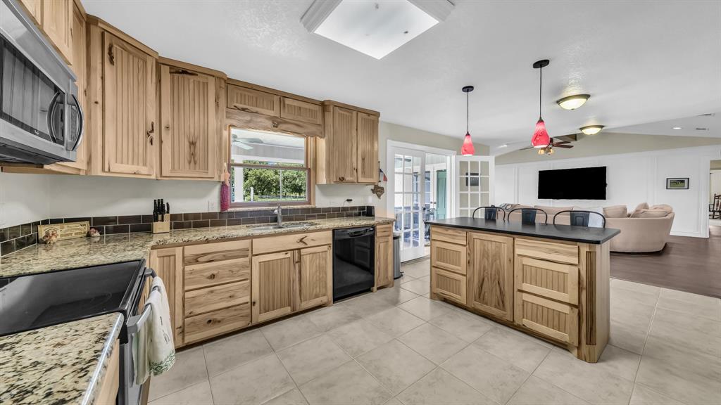 The house offers three bedrooms and three bathrooms, an updated open-concept kitchen, spacious bedrooms with walk-in closets, and a primary suite with a remodeled bathroom. The living room features vaulted ceilings, and there’s a closed-in porch with a sink and bar. A metal roof completes the home.