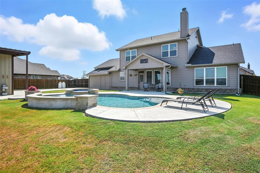 Upstairs, two full bathrooms provide extra convenience for family and guests. A dedicated private office offers the perfect work-from-home space. Outside, enjoy resort-style living with a sparkling pool featuring a soothing hot tub—ideal for relaxing evenings under the Texas sky.