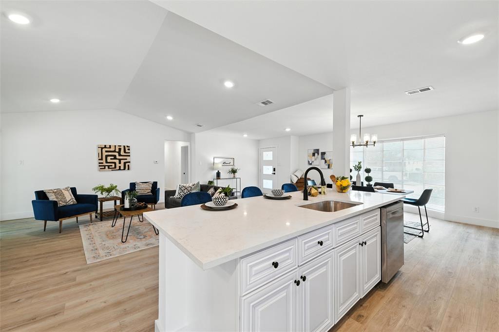 BRAND NEW PRIVACY FENCE INSTALLED 8.25.2025!!! WELCOME HOME!!! Completely renovated 4-bedroom, 3-bath home in a well-established Dallas neighborhood, offering an open-concept layout flooded with natural light. Thoughtfully updated with modern recessed lighting and fresh interior and exterior paint, this home showcases beautiful 5-inch baseboards throughout for an elegant finish. The chef-inspired kitchen boasts a large oversized island, perfect for meal prep and entertaining, featuring a 100% undermount sink and stainless steel appliances that combine style with functionality. New faucets and fixtures throughout add a fresh, modern touch.