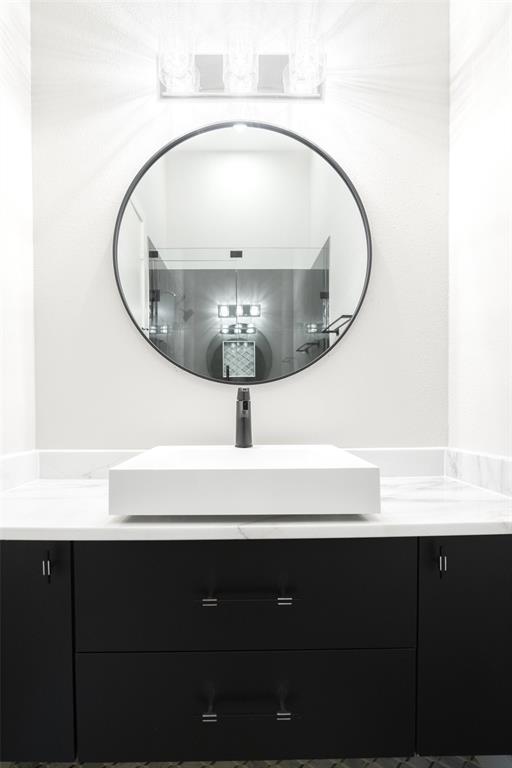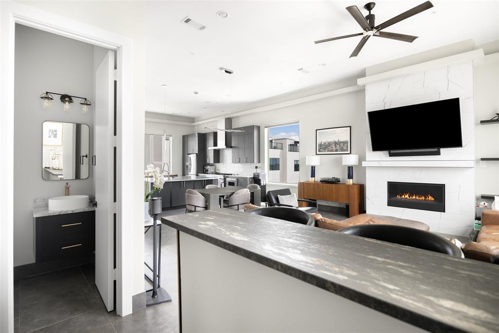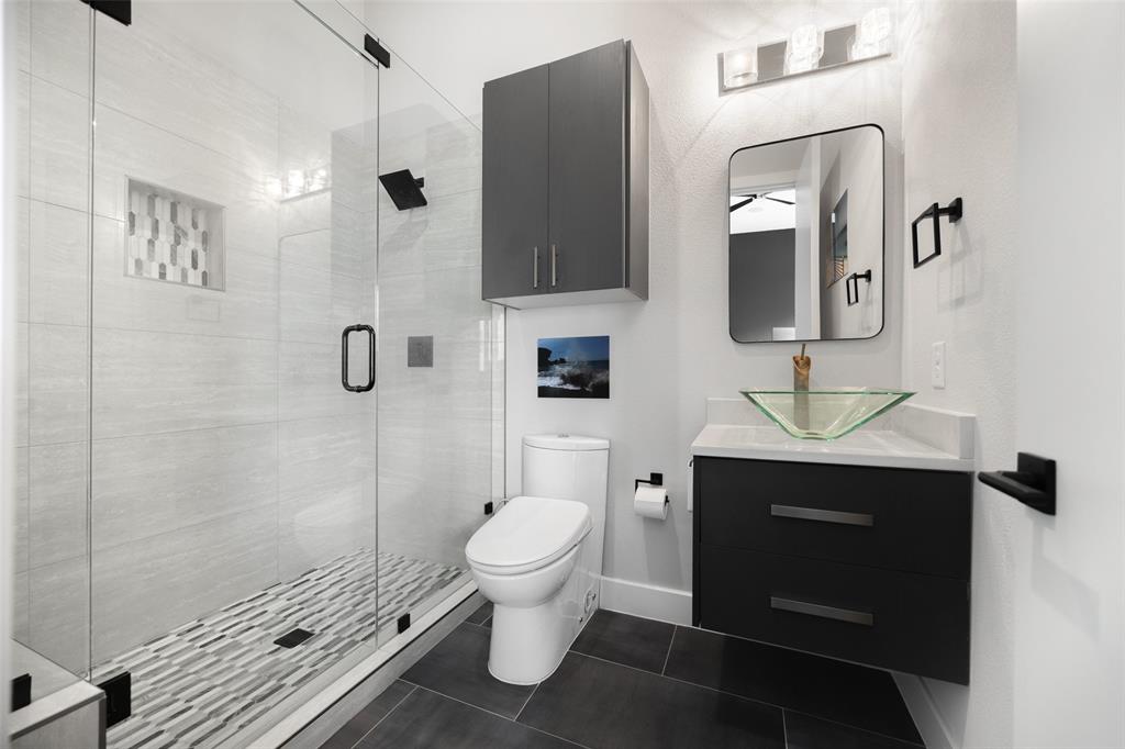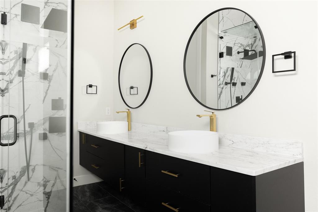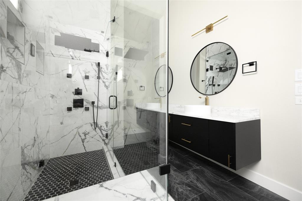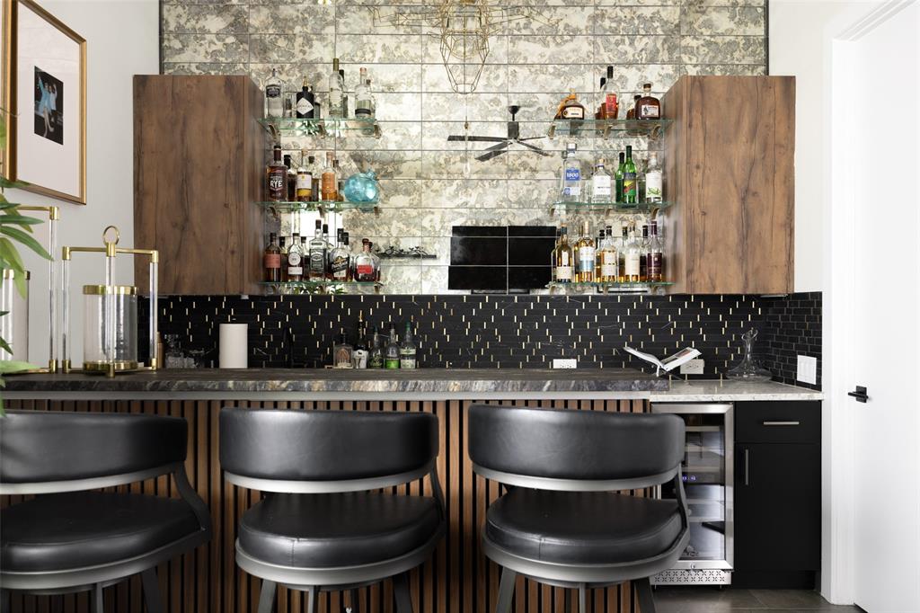 An Entertainer’s Dream Living Room; the custom wet bar is the centerpiece of the living space, featuring a nugget ice maker, beverage fridge, dual-zone wine cooler, dishwasher, glass shelving, and a stunning glass tile backsplash. Step into the Chefs Kitchen with a professional Thermador appliance package, including a 48” 6 burner range with griddle, steam and convection ovens, warming drawer, and commercial-grade hood. The showstopping 5’x8’ dual waterfall quartz island includes hidden storage and is complemented by a food-grade butcher block prep island. All cabinetry throughout the kitchen and bathrooms is high end Milania soft-close.Relax in the Spa Inspired Bathrooms:Every bathroom features floating Milania vanities with vessel sinks. The primary suite showcases an oversized custom glass steam shower for the ultimate spa-like experience.