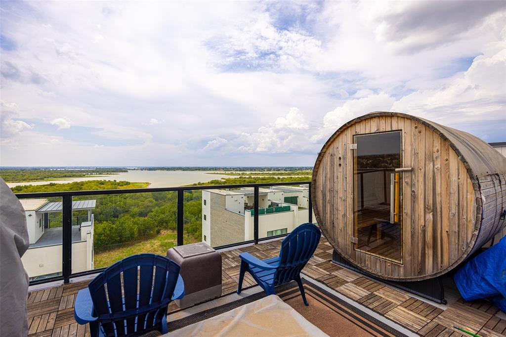 Which is a true showstopper ...complete with custom flooring, a built-in Coyote grill, outdoor fridge and sink, and two zones of outdoor speakers with a subwoofer. Relax year-round with a full sauna and motorized UV shades enclosing all sides of the pergola.