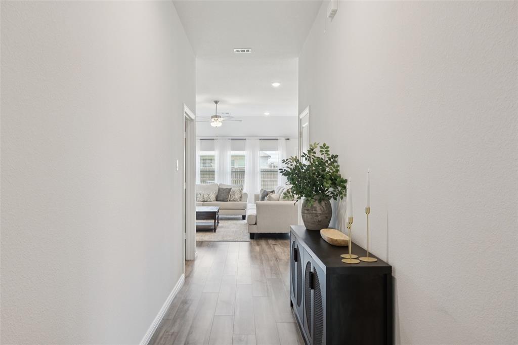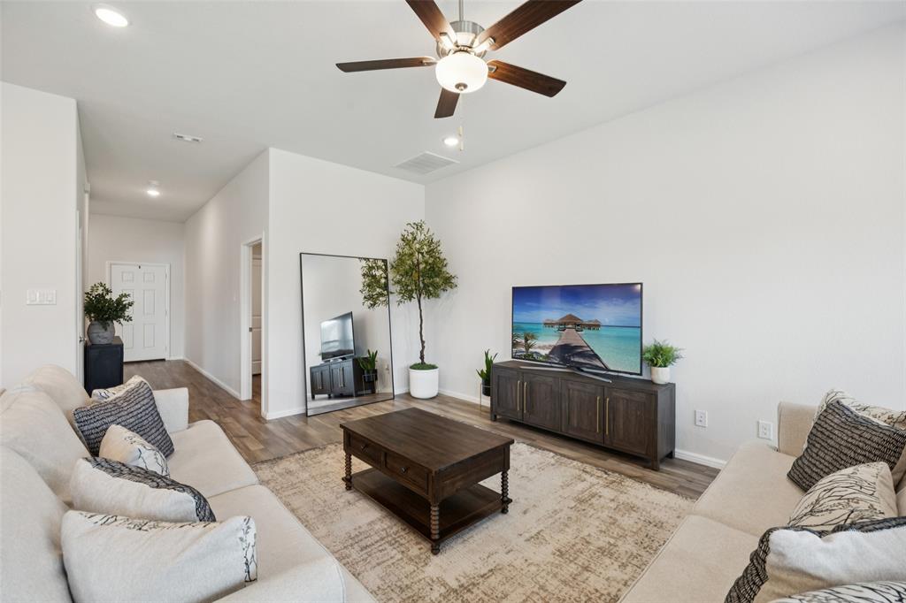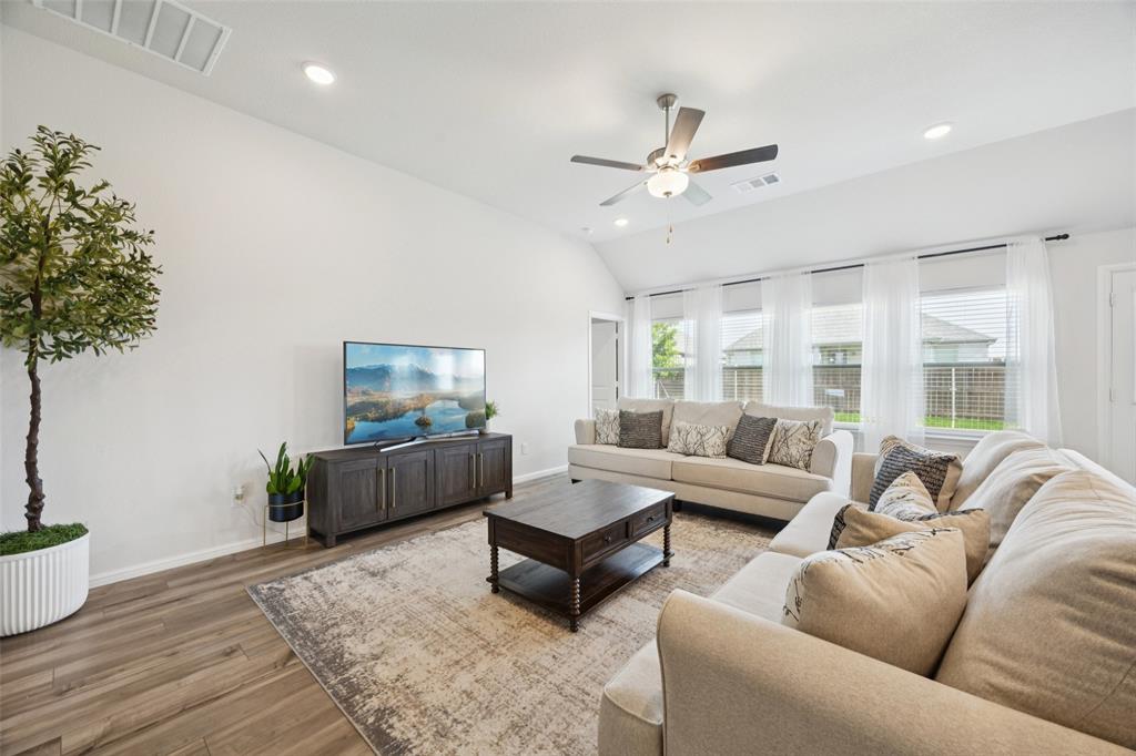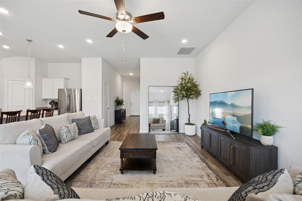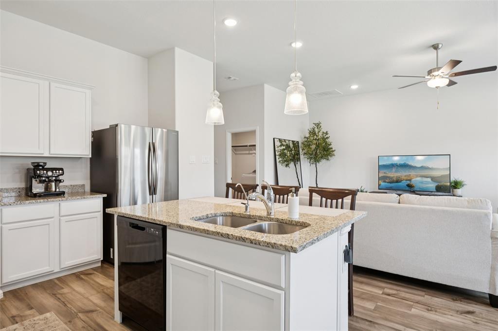 Welcome to this beautifully maintained 3-bedroom, 2-bathroom single-story home that blends style, comfort, and functionality. Enter to an expansive open-concept living space that offers a warm and inviting atmosphere. The gourmet kitchen is a dream come true for any chef, featuring stainless steel appliances, a large island with granite countertops, ample cabinetry, and a spacious walk-in pantry—perfect for entertaining or everyday living. Tucked away for privacy, the luxurious primary suite offers serene backyard views, a generous walk-in closet, and a spa-inspired en-suite bath and walk-in closet. Two additional bedrooms are thoughtfully located in their own wing and share a full bathroom, making them ideal for family, guests, or a home office. Outside, enjoy relaxing or entertaining on the patio in the fully fenced backyard. With a 2-car garage and modern finishes throughout, this home offers both comfort and convenience in a well-designed layout. Don’t miss your chance to make this one yours! 3D tour available online!