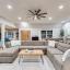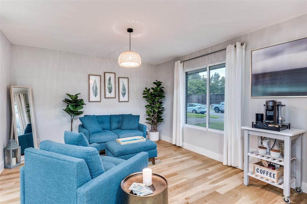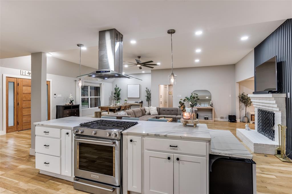 The spacious living room features vaulted ceilings, a gas started fireplace, and an open layout that flows into the updated kitchen, complete with a large island, and walk-in pantry. Two separate bedroom wings include a private guest or in-law suite. The climate-controlled garage with epoxy floors doubles as a hobby space or home gym.