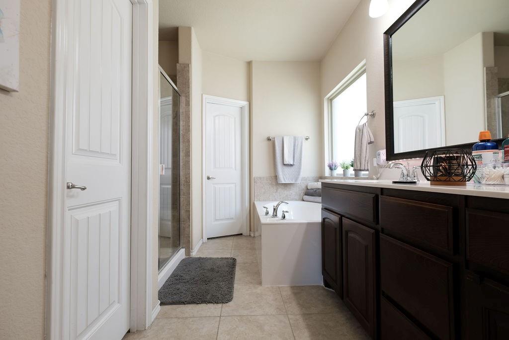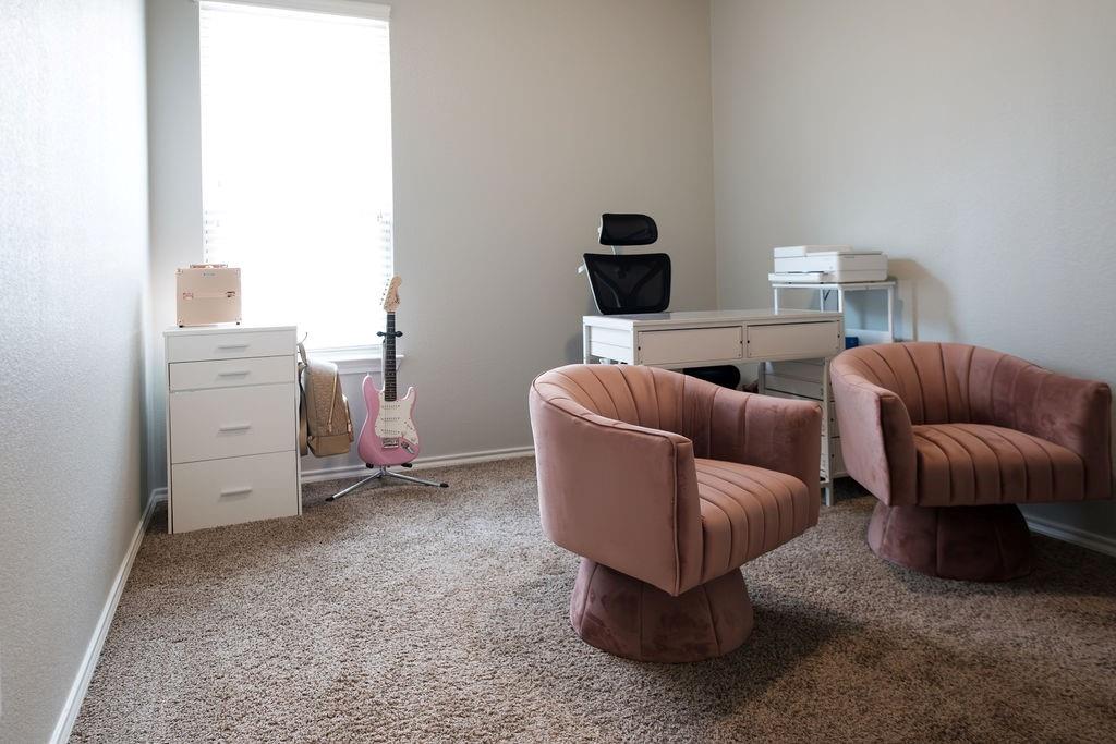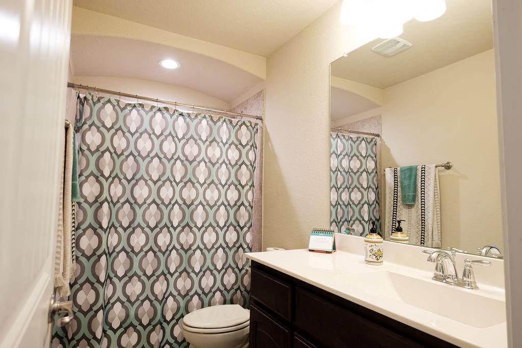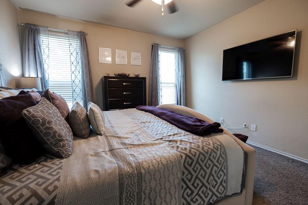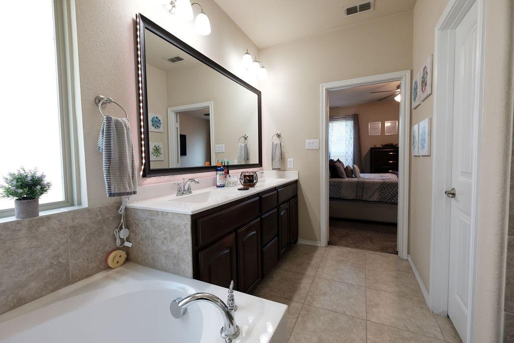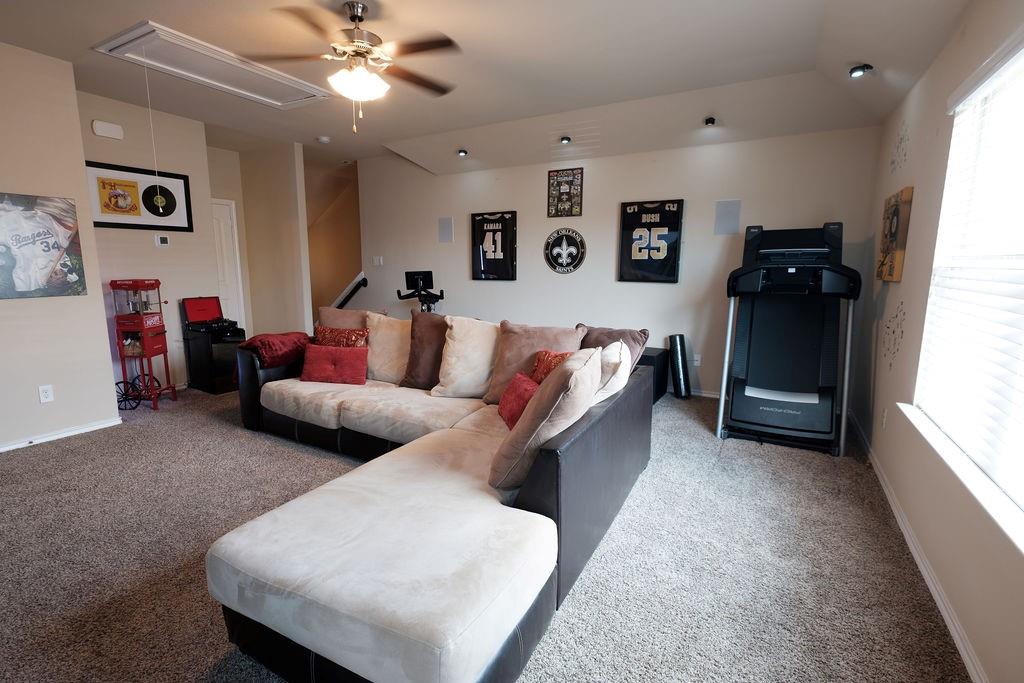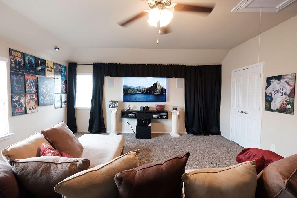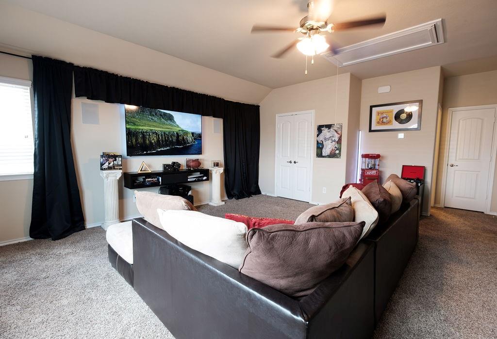 The main level features one private study (or bedroom) and a spacious primary suite with a dual-sink vanity, garden tub, separate shower, and a fully customized walk-in closet by California Closets. Upstairs is home to a large game room perfect as an additional bedroom or second suite. It boasts a full bath and is pre-wired for an immersive surround sound experience.