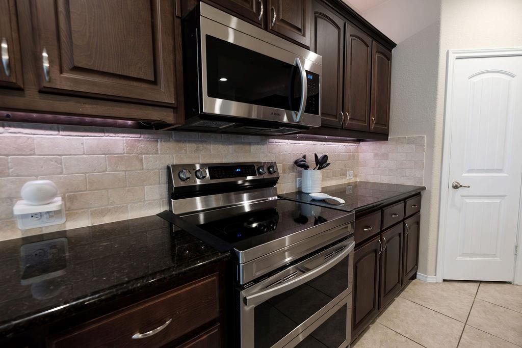 The heart of the home is the expansive kitchen, complete with granite countertops, stainless steel appliances, a tiled backsplash, large island, and walk-in pantry. Rich beech-stained cabinets open to a bright dining area and a generous living room anchored by a bold corner wood-burning fireplace.